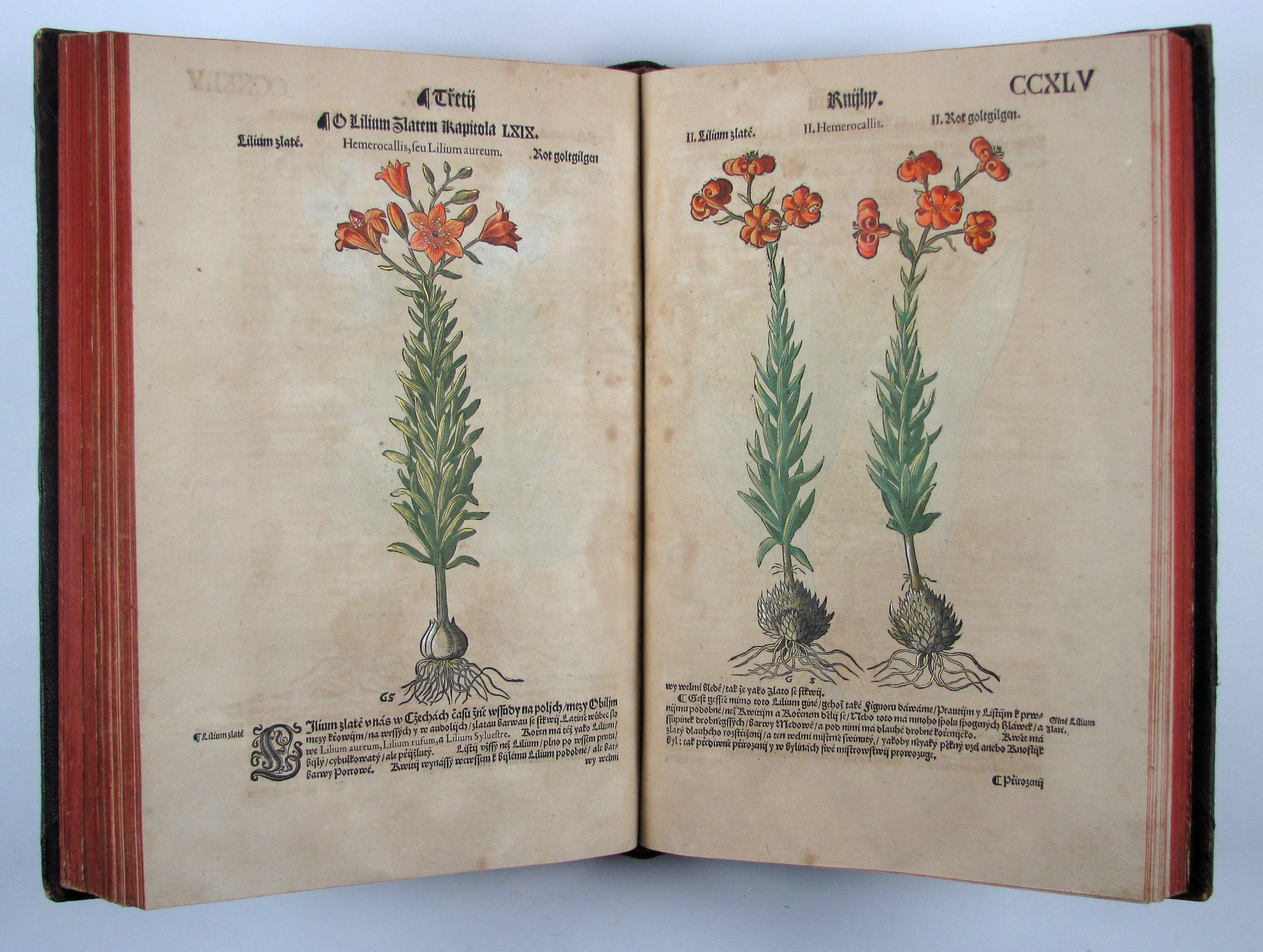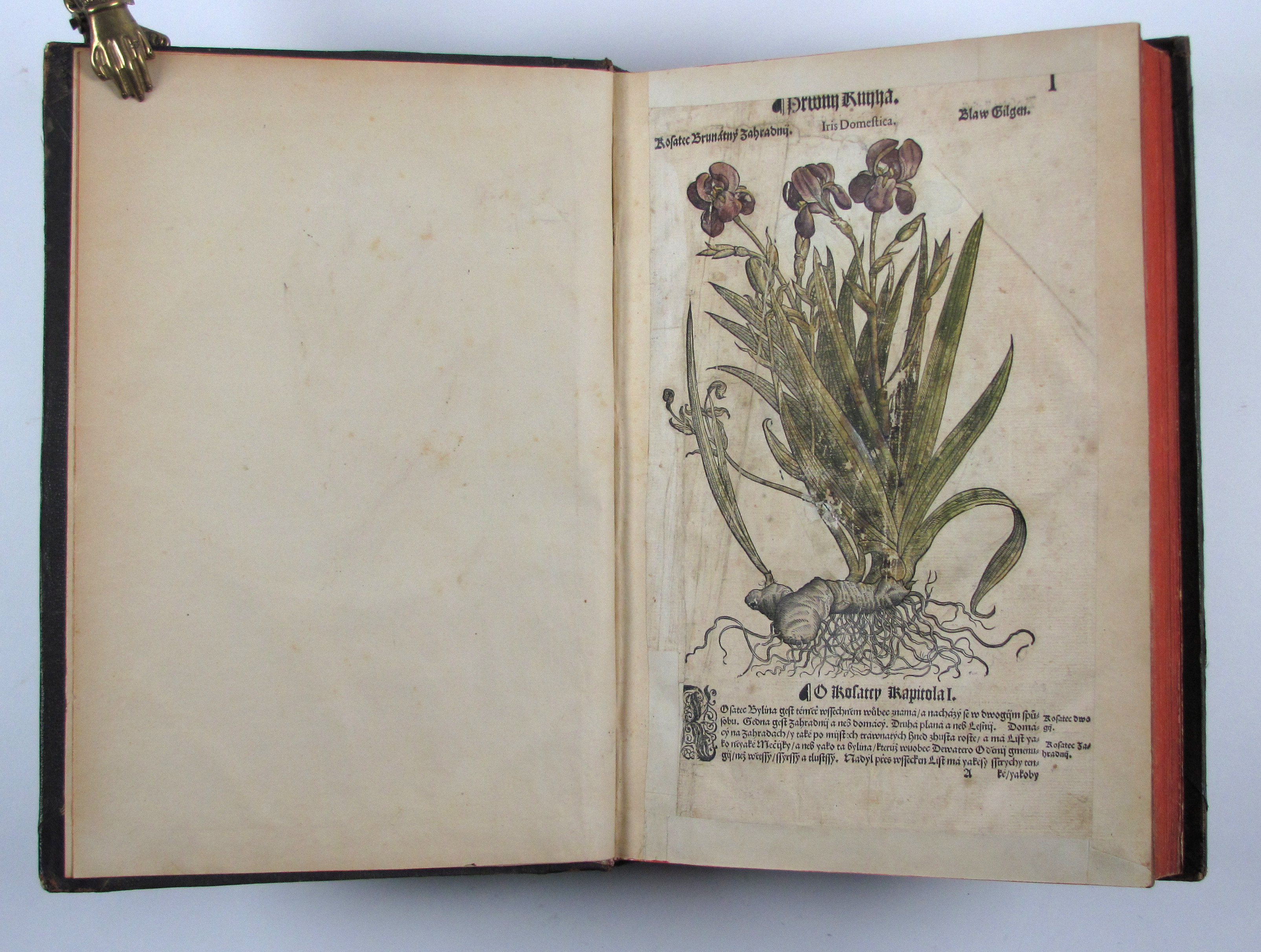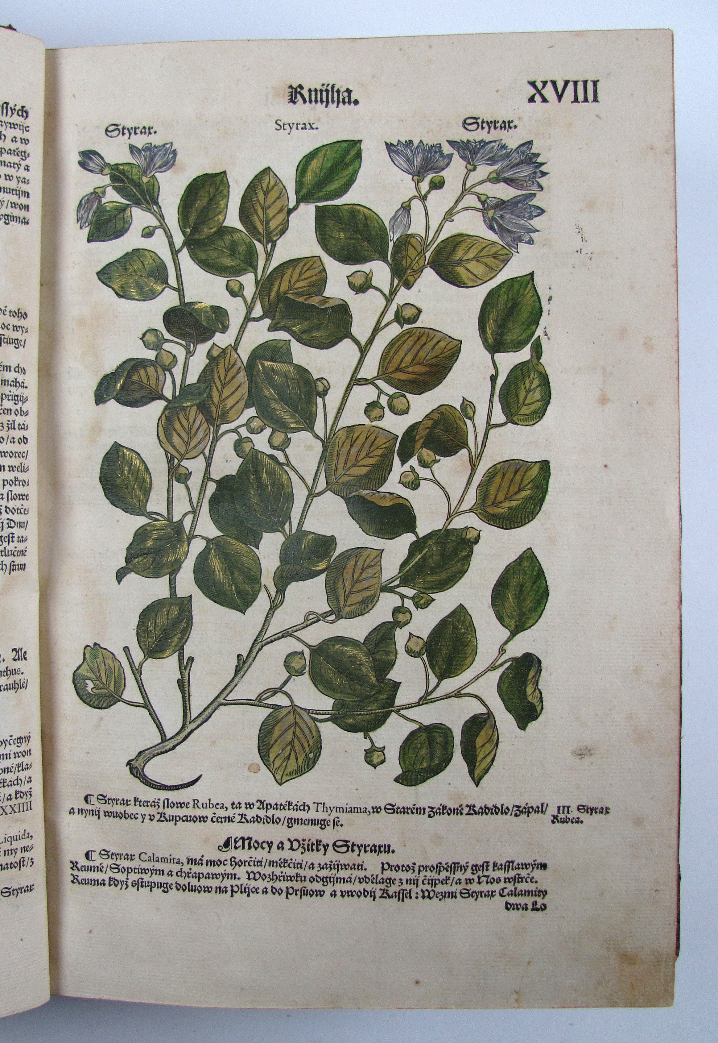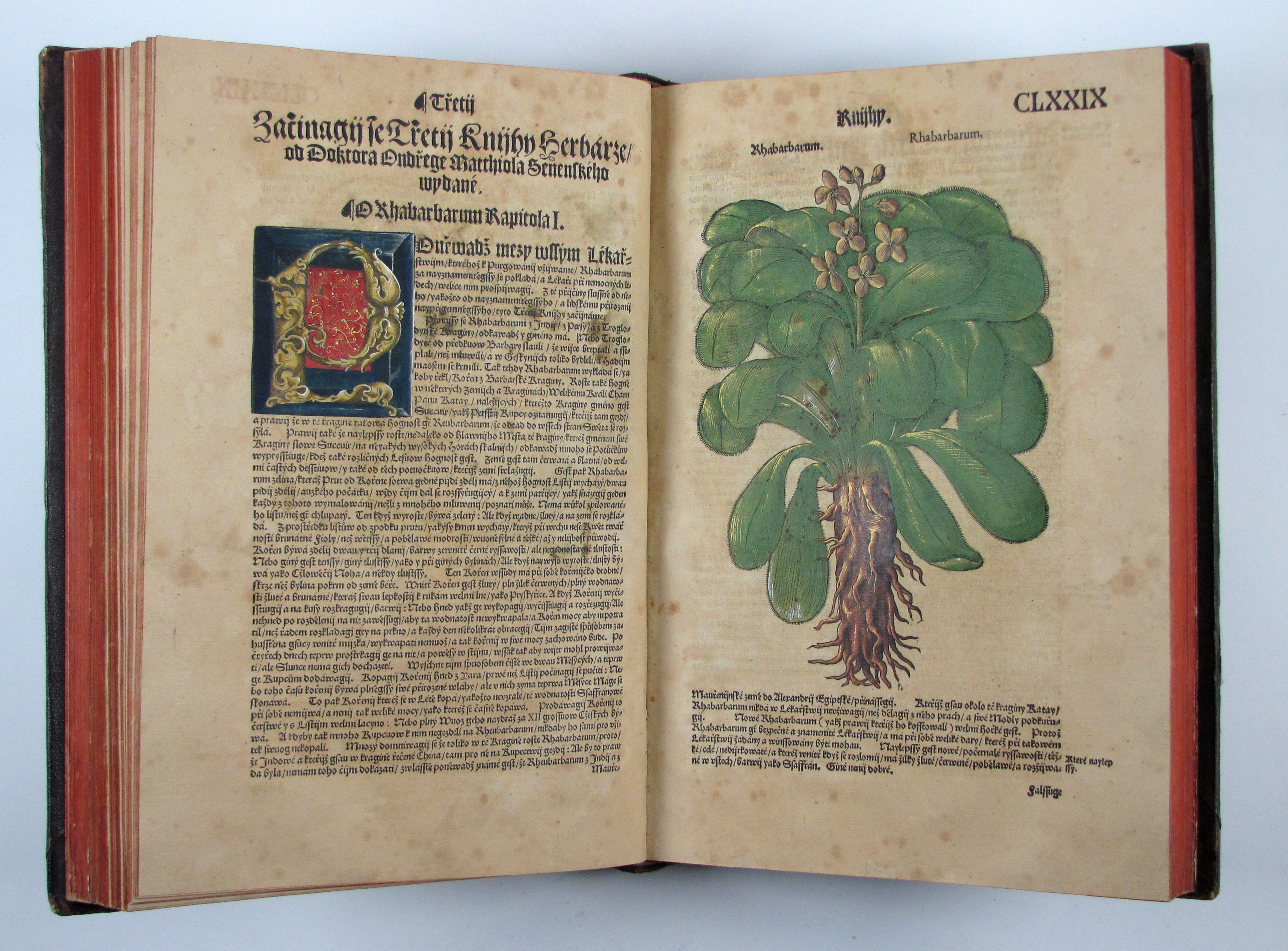 Seltene erste böhmische Ausgabe in tschechischer Sprache, die erste Ausgabe mit den großen Holzschnitten von Giorgio Liberale und Wolfgang Meyerpeck. Der Herausgeber Th. Hagek (1525-1600) war praktischer Arzt, zweitweise Professor der Mathematik am Carolinum, später Leibarzt der Kaiser Maximilian II und Rudolph II.– Im folgenden Jahr erschien, ebenfalls bei Melanchtrich, das Kräuterbuch in deutscher Sprache mit über 800 Holzschnitten, eine nochmals erweiterte Serie von 932 Schnitten fand im Dioscoridis-Kommentar von 1565 Verwendung.– Herausragend am vorliegenden Exemplar das einmalige, durchgehend reich mit Gold und Silber gehöhte, sorgfältige Prachtkolorit. Kolorierte Exemplare aller Matthiolus-Ausgaben mit den großformatigen Holzschnitten sind von großer Seltenheit.– Am Anfang fehlt der Titel und die Vorrede mit 2 Portraits und Wappenholzschnitten im Text, der Teil mit den Pflanzen bis auf 7 Blatt komplett, am Schluß 3 (von 6) Holzschnitte mit Destillier-Öfen, danach fehlt das Register. Einige Anränderungen, hinterlegte Ein- und Ausrisse, tls. gebräunt und fleckig, vereinzelt der Abklatsch unschön mit dünnem Deckweiß beseitigt. Insgesamt trotz der Erhaltungsmängel und Unvollständigkeit durch die Seltenheit der Ausgabe und das Kolorit ein begehrenswertes Exemplar.– Nissen 1314. Pritzel 5992. Vgl. Hunt 91 Anmerkung.