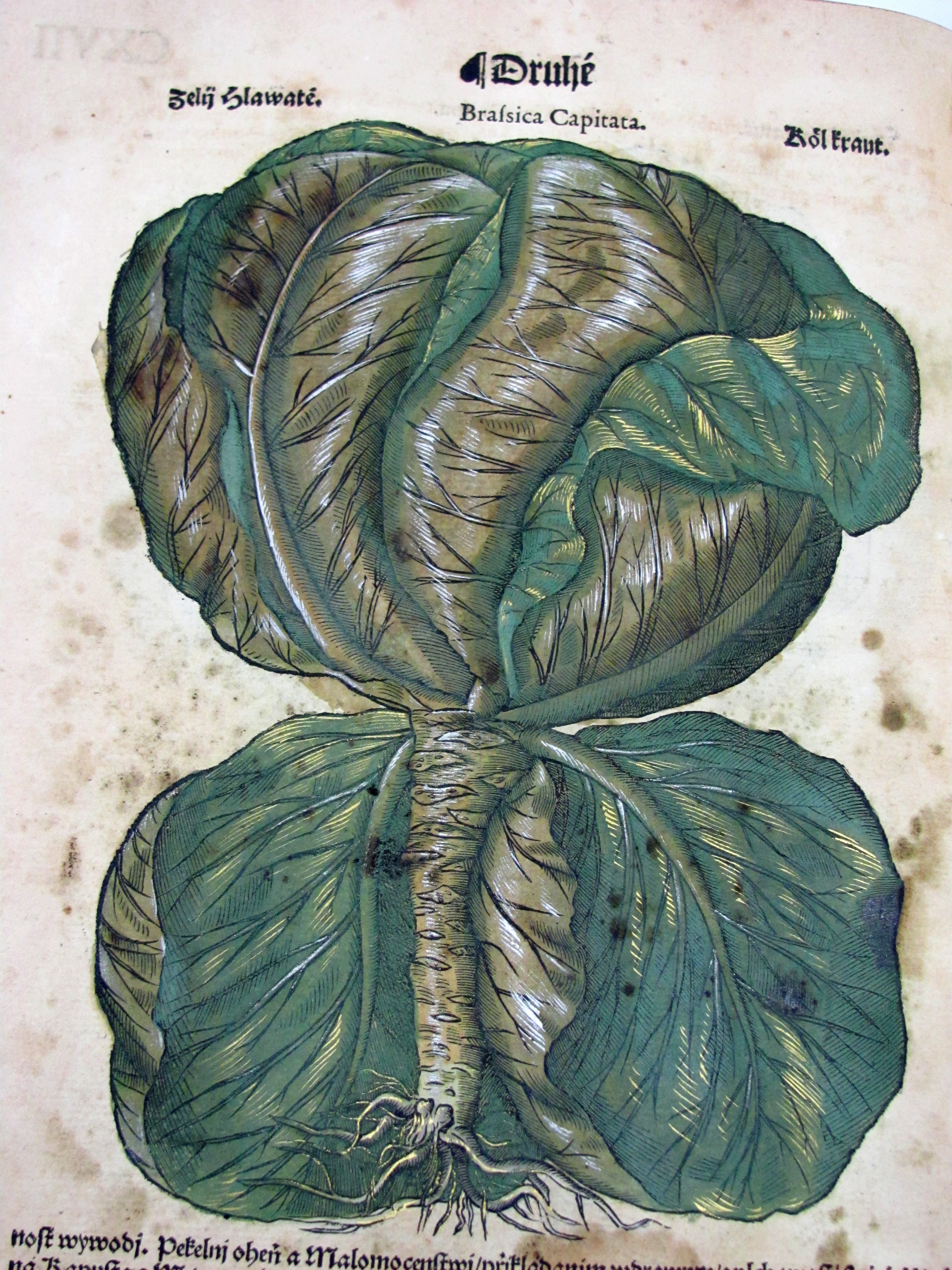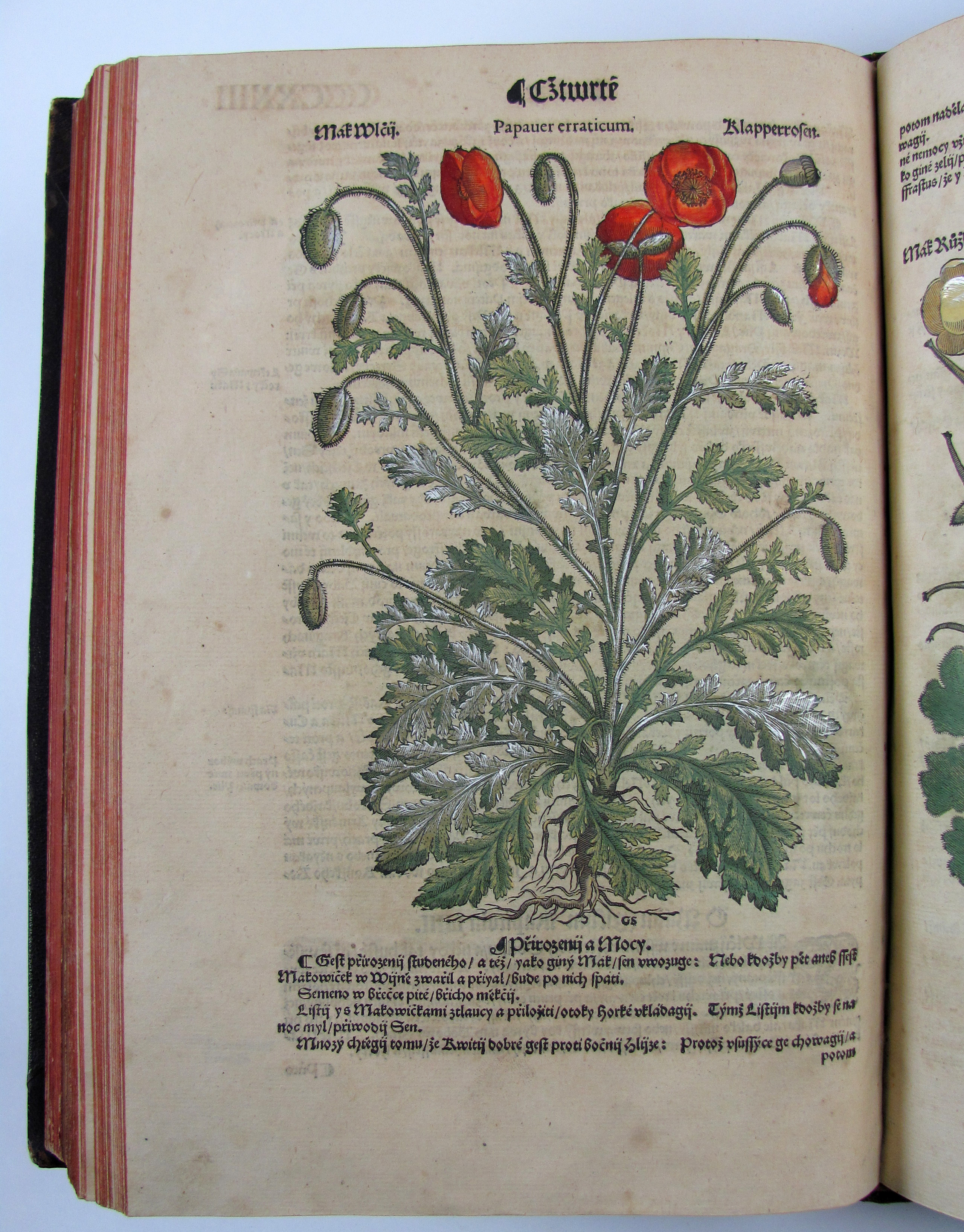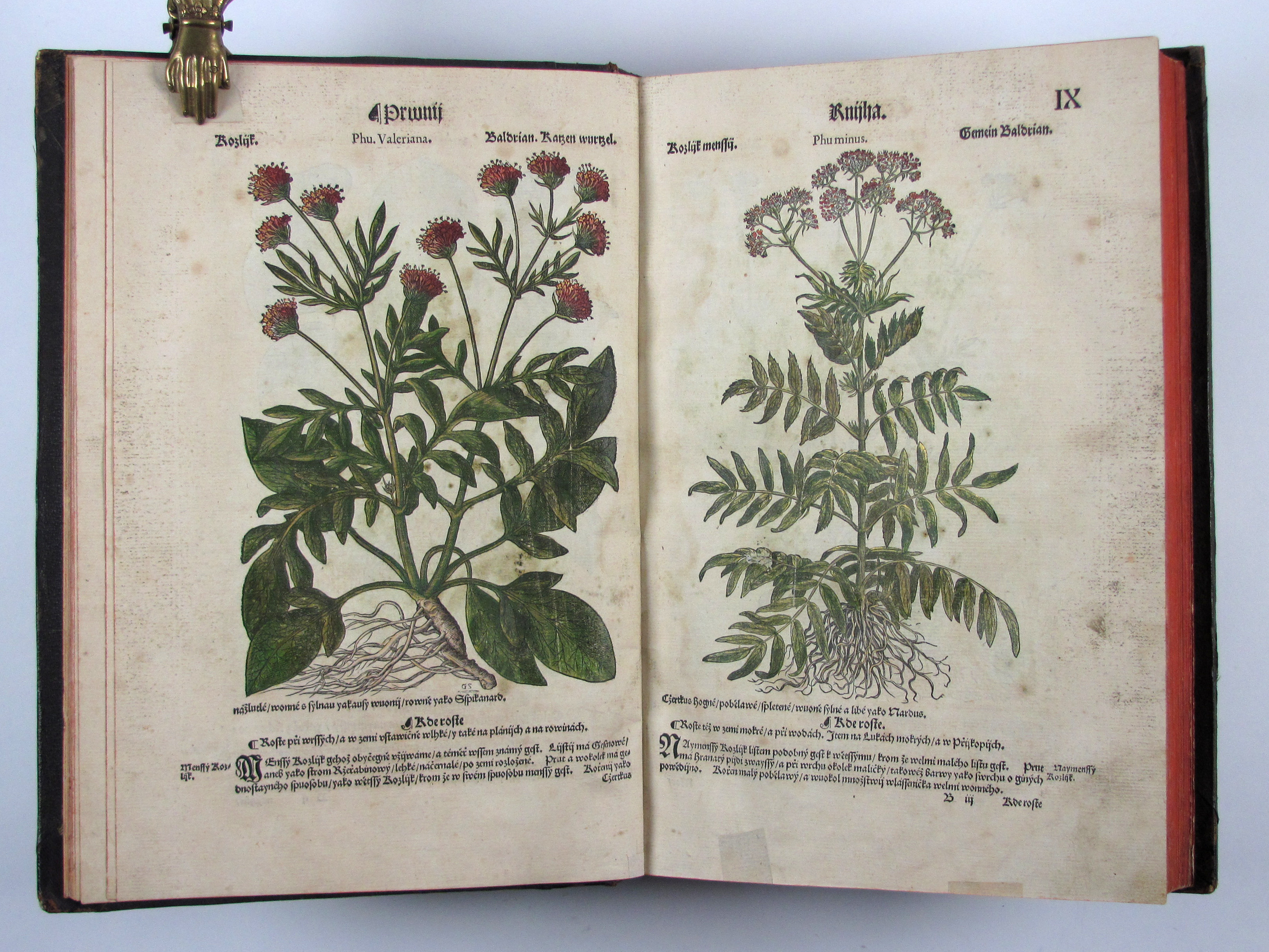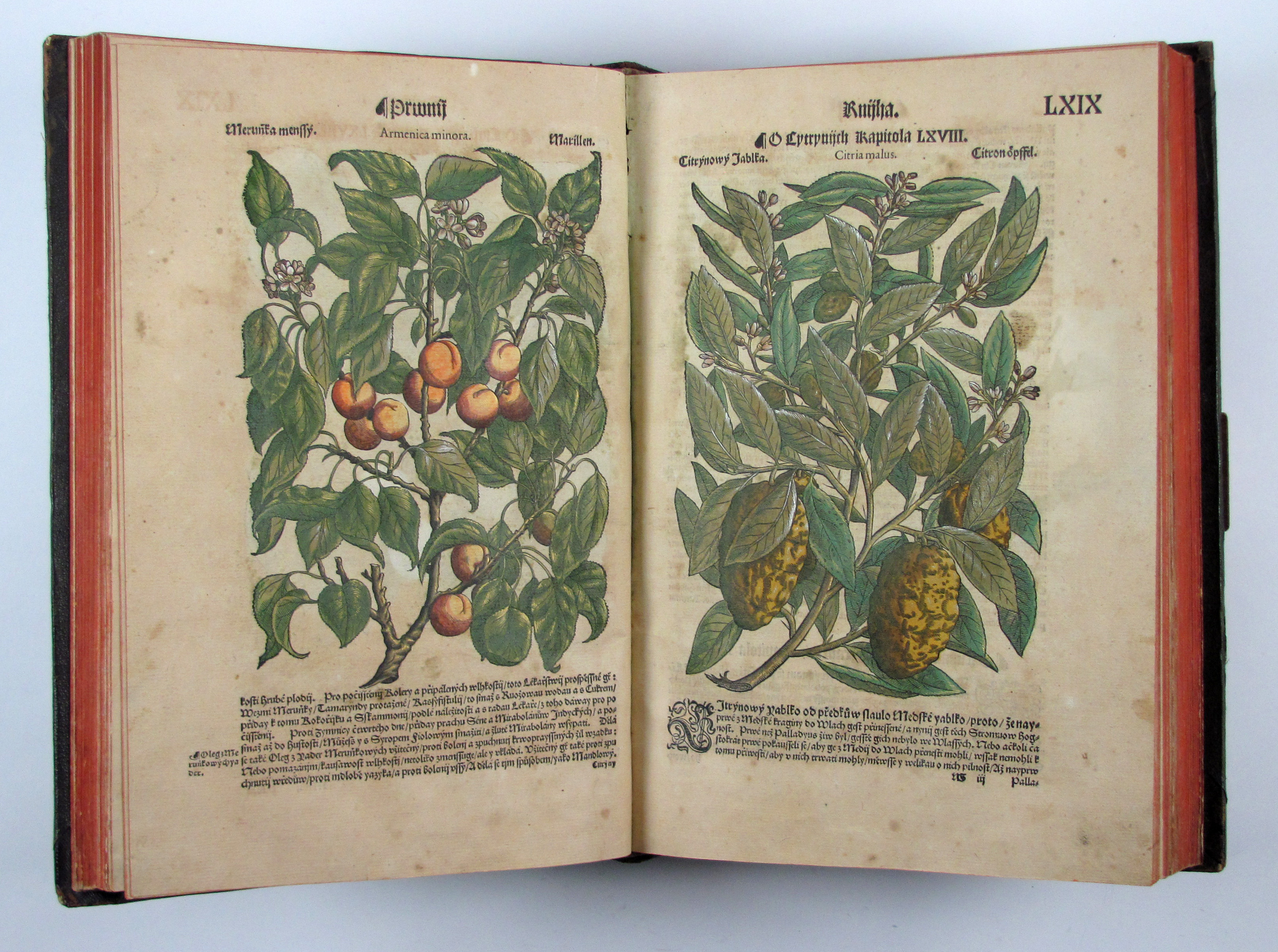 Seltene erste böhmische Ausgabe in tschechischer Sprache, die erste Ausgabe mit den großen Holzschnitten von Giorgio Liberale und Wolfgang Meyerpeck. Der Herausgeber Th. Hagek (1525-1600) war praktischer Arzt, zweitweise Professor der Mathematik am Carolinum, später Leibarzt der Kaiser Maximilian II und Rudolph II.– Im folgenden Jahr erschien, ebenfalls bei Melanchtrich, das Kräuterbuch in deutscher Sprache mit über 800 Holzschnitten, eine nochmals erweiterte Serie von 932 Schnitten fand im Dioscoridis-Kommentar von 1565 Verwendung.– Herausragend am vorliegenden Exemplar das einmalige, durchgehend reich mit Gold und Silber gehöhte, sorgfältige Prachtkolorit. Kolorierte Exemplare aller Matthiolus-Ausgaben mit den großformatigen Holzschnitten sind von großer Seltenheit.– Am Anfang fehlt der Titel und die Vorrede mit 2 Portraits und Wappenholzschnitten im Text, der Teil mit den Pflanzen bis auf 7 Blatt komplett, am Schluß 3 (von 6) Holzschnitte mit Destillier-Öfen, danach fehlt das Register. Einige Anränderungen, hinterlegte Ein- und Ausrisse, tls. gebräunt und fleckig, vereinzelt der Abklatsch unschön mit dünnem Deckweiß beseitigt. Insgesamt trotz der Erhaltungsmängel und Unvollständigkeit durch die Seltenheit der Ausgabe und das Kolorit ein begehrenswertes Exemplar.– Nissen 1314. Pritzel 5992. Vgl. Hunt 91 Anmerkung.