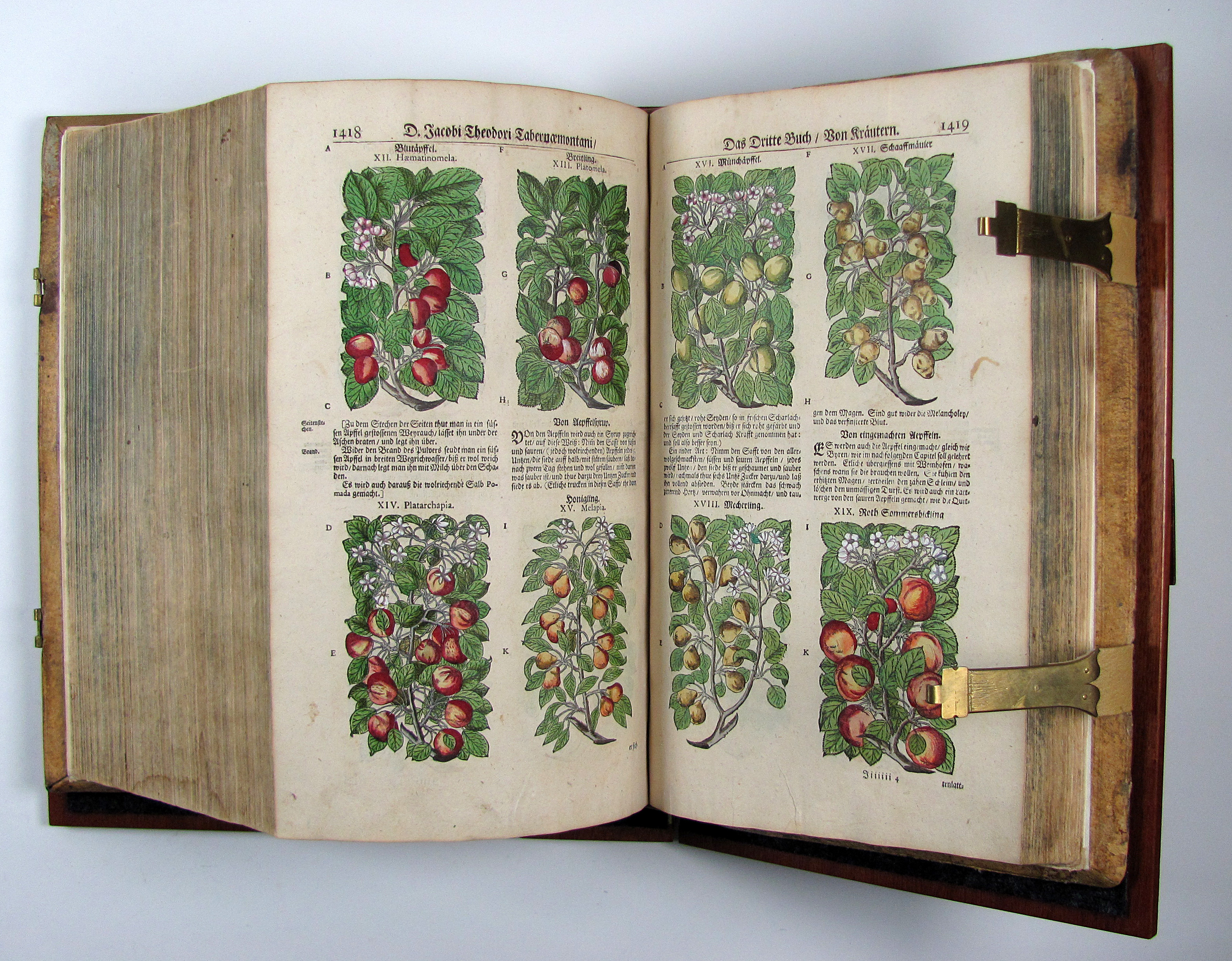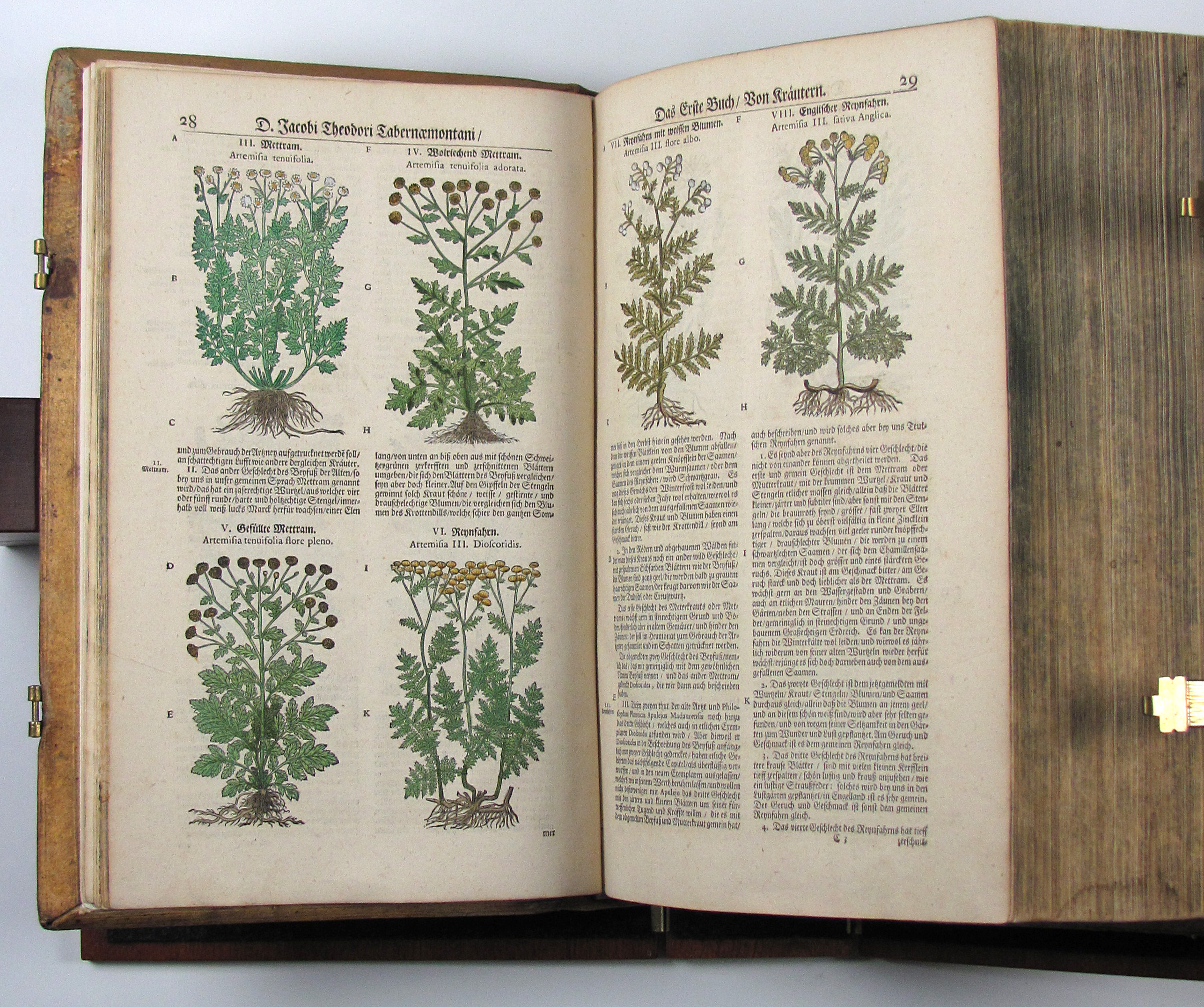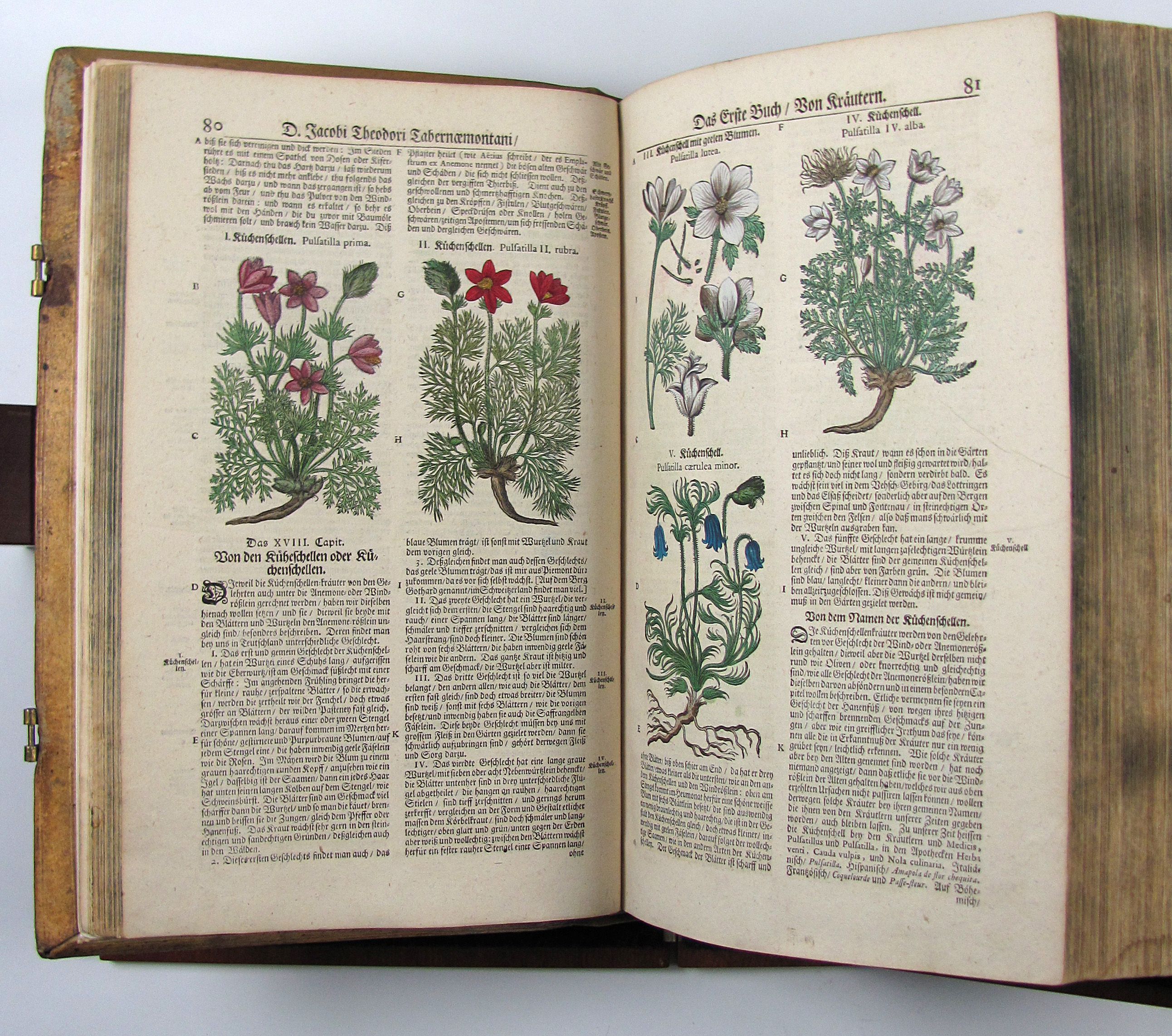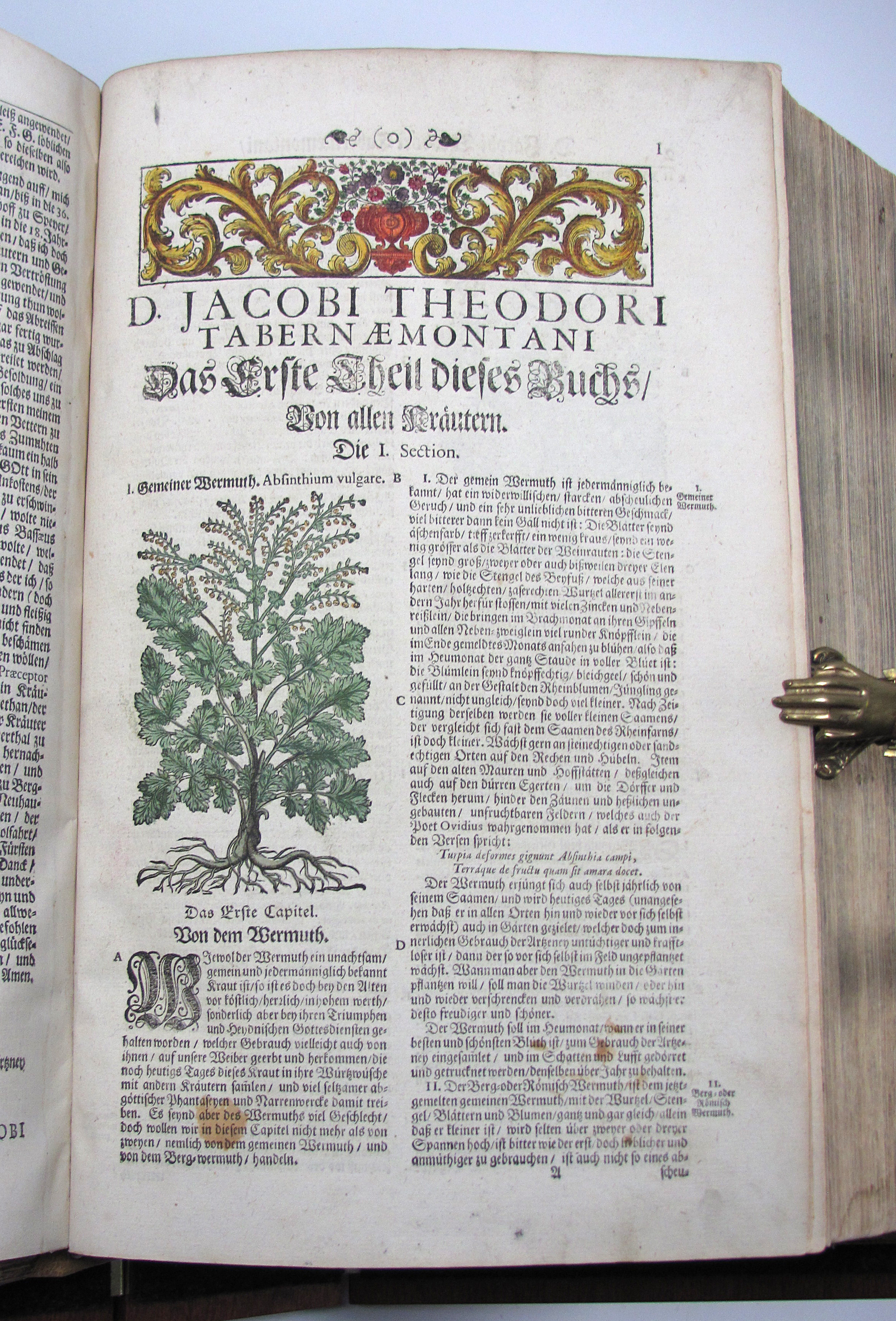 Großartiges Ausnahmeexemplar des monumentalen Kräuterbuchs, herausragend durch das durchgehende, äußerst fein ausgeführte und sehr differenzierte Handkolorit der Zeit. In über dreißig Jahren ist mir lediglich ein einziges anderes koloriertes Exemplar dieses Werks begegnet, das Kolorit bezeichnenderweise nicht bis zum Ende des Buches hin ausgeführt (Ausgabe 1664, Teile 1 und 2 altkoloriert, Teil 3 schwarz-weiß, bei Koller 30.04.2001). Grund dafür ist der riesige Umfang des Werks, welches auf über1600 Seiten mehr als 3.000 Gewächse und deren Heilwirkungen verzeichnet und dabei mit über 2400 Holzschbnitten illustriert wurde. Darüber hinaus ist das vorliegende Kolorit von bestechender Qualität. Ein große Farbpalette von zarten Aquarell- bis hin zu kräftigen Gouachefarben in Blüten und Früchten, eine große Bandbreite fein differenzierter Grün-Töne und eine sehr sorgfältige Ausführung, wie z.B. die unterschiedliche Behandlung von Blattober- und -unterseiten oder die pedantische Einhaltung der Umrisse, zeichnen das Kolorit aus. Schon bei einem anderen Kräuterbuch wäre das Kolorit sehr bemerkenswert, bei dem hier vorliegenden Umfang erscheint es umso erstaunlicher.– Tabernaemontanus (1520-90), eigentlich Jacob Dietrich latinisiert nach seinem Heimatort Bergzabern/Pfalz, war Arzt (u.a. Leibarzt von Phillip III. von Nassau-Saarbrücken und von Kurfürst Johann Casimir), davor Schüler von Brunfels und Bock. Er hatte 36 Jahre an dem umfangreichen Kräuterbuch gearbeitet, sein ganzes Vermögen in die Drucklegung investiert, doch von seinem Lebenswerk nur die Drucklegung des ersten Bands erleben können. Der zweite Band erschien posthum 1591. Die Holzschnitte gehen hauptsächlich auf die bis dahin schon veröffentlichten, bekannten Kräuterbücher zurück (z.B. Fuchs, Bock, Matthioli). Erst mit der Bearbeitung durch Caspar Bauhin, die zuerst 1613 erschien, wurde das Werk ein verlegerischer Erfolg. Bis zur letzten Ausgabe 1731 diente das Werk 150 Jahre als Einführung in die europäische Flora. „Sein Buch berücksichtigt in erster Linie die praktisch medizinische Anwendung der Pflanzen und ist in dieser Beziehung außerordentlich reichhaltig“ (Schmid).– Titel und das folgende Blatt mit kleiner Eckergänzung, S. 847-880 mit leichtem Wasserrand, S. 1497-1506 mit Tintenfleck im Rand, die letzten beiden Blätter gebräunt. Einband restauriert, Schließen und Vorsätze erneuert, insgesamt von hervorragender Gesamterhaltung.– Nissen, BBI 1930. Pritzel 9093. Nissen Kräuterbücher, 70. Arber 76. Heilmann 228.