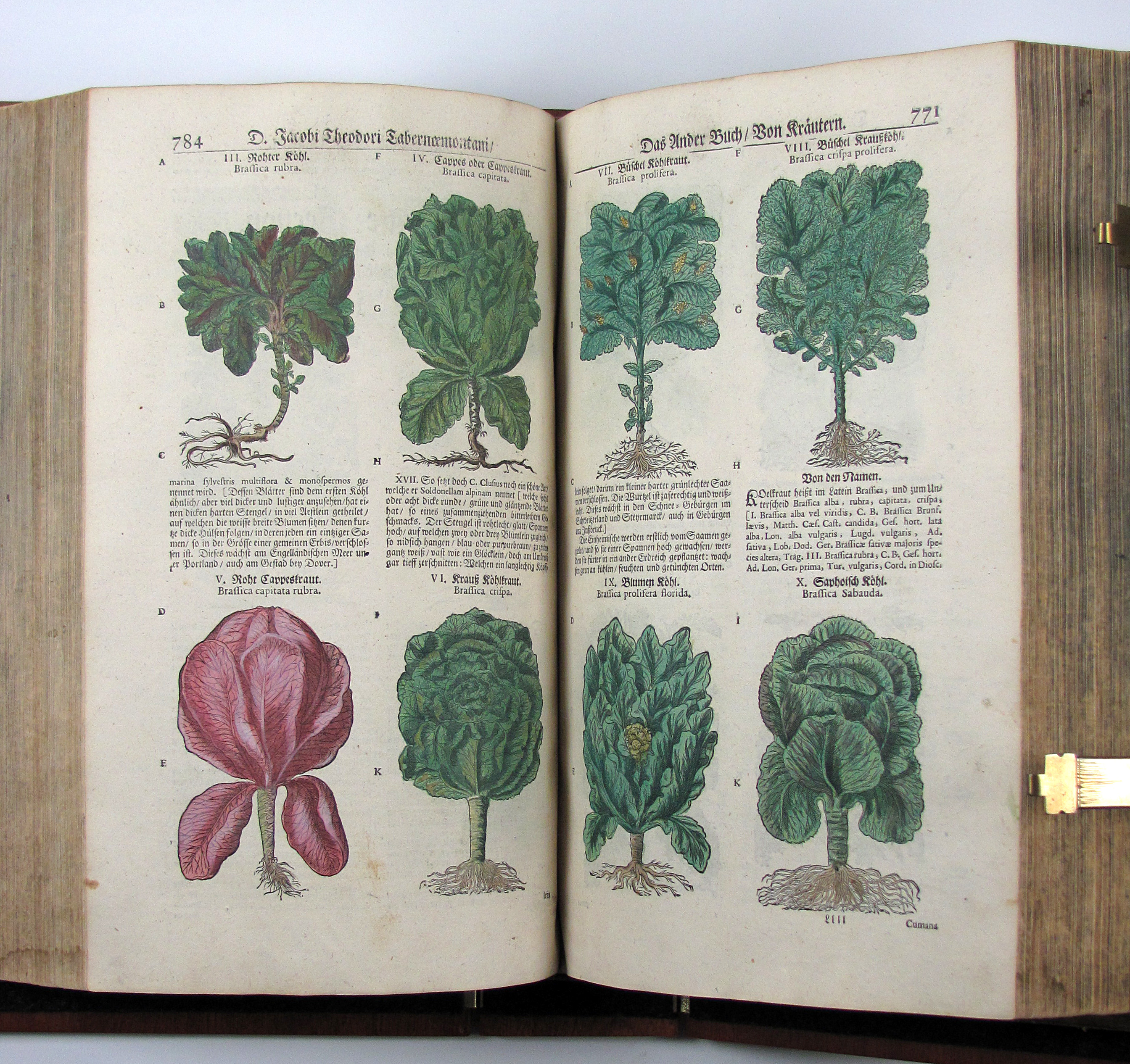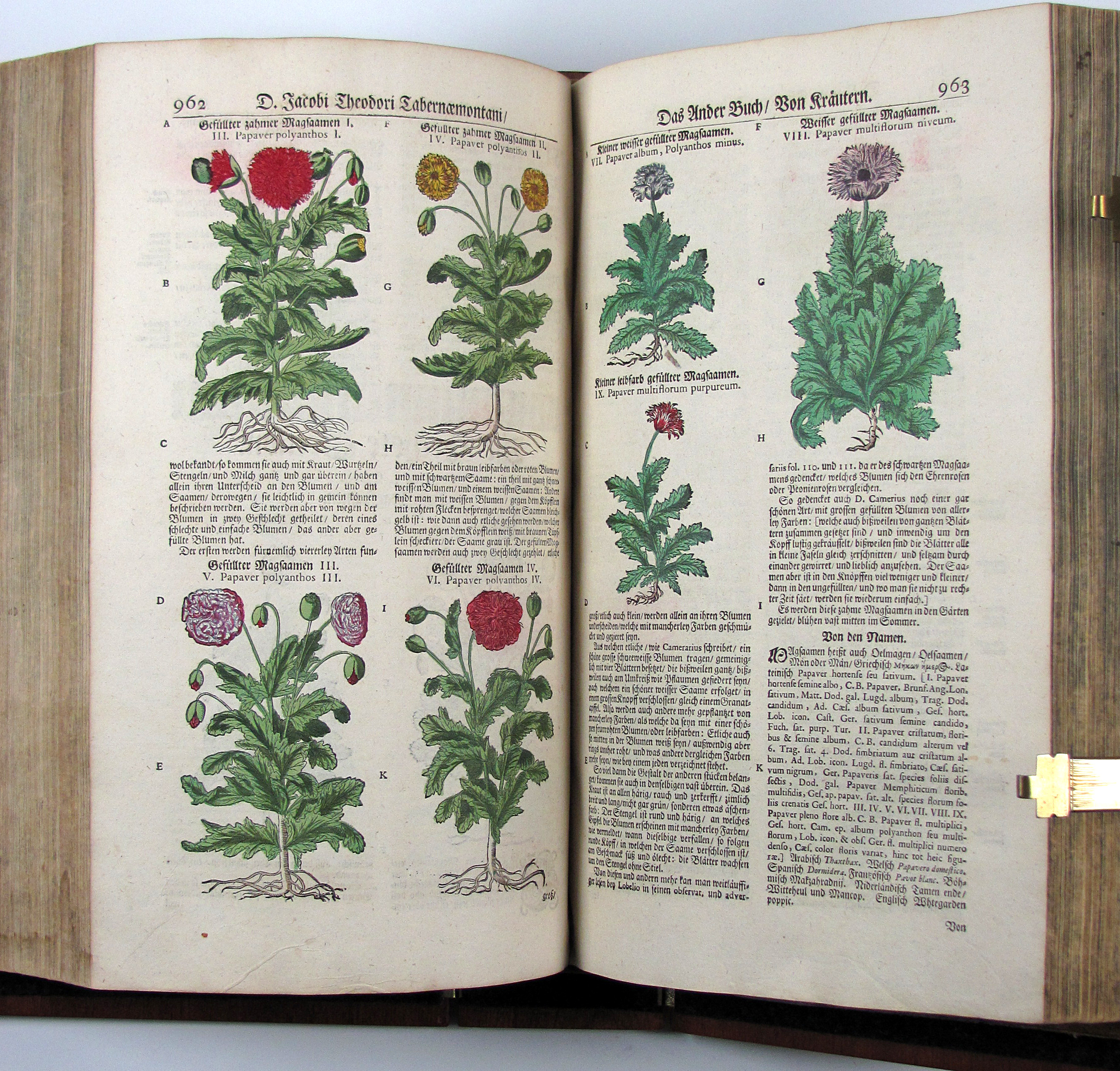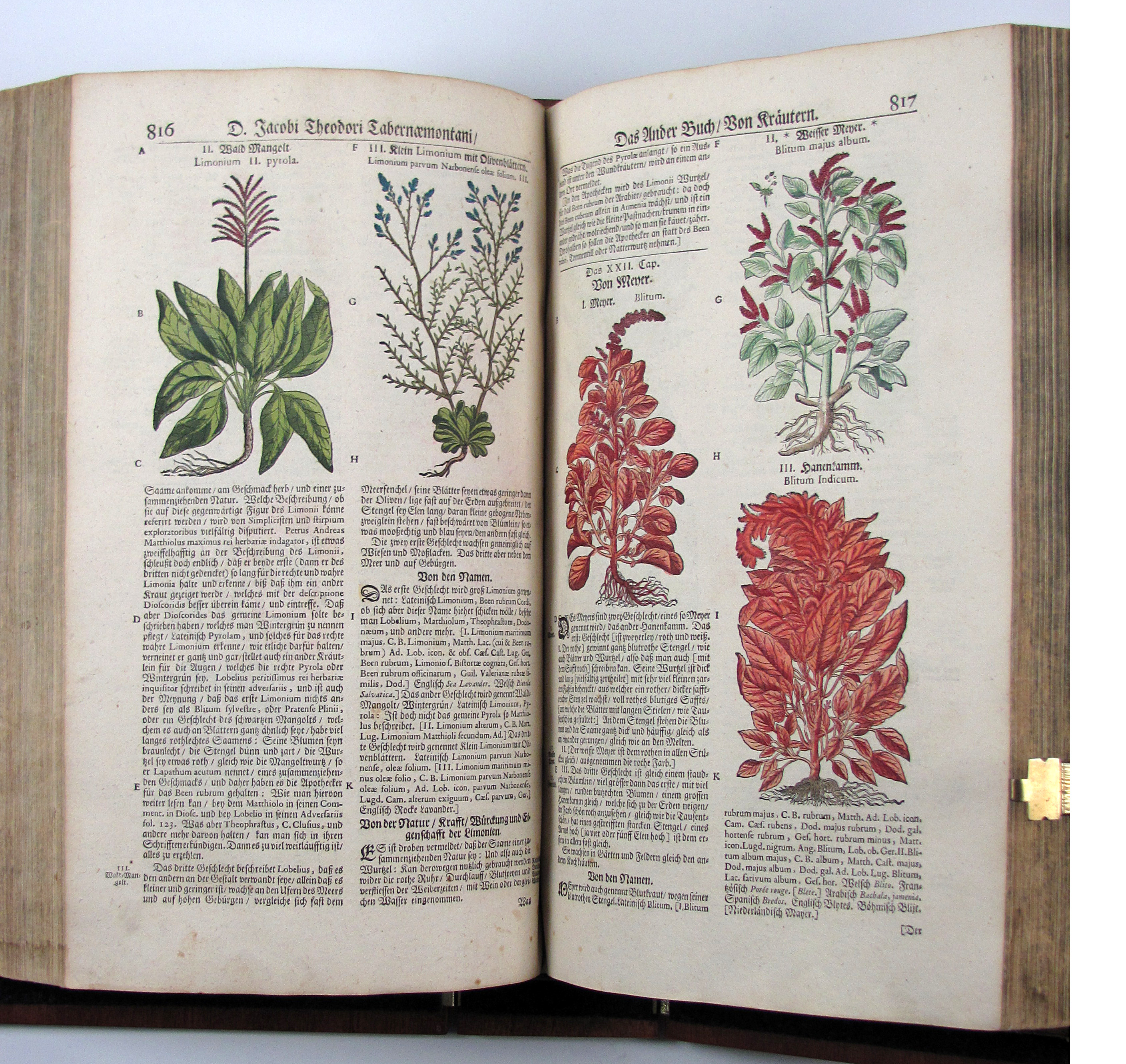 Großartiges Ausnahmeexemplar des monumentalen Kräuterbuchs, herausragend durch das durchgehende, äußerst fein ausgeführte und sehr differenzierte Handkolorit der Zeit. In über dreißig Jahren ist mir lediglich ein einziges anderes koloriertes Exemplar dieses Werks begegnet, das Kolorit bezeichnenderweise nicht bis zum Ende des Buches hin ausgeführt (Ausgabe 1664, Teile 1 und 2 altkoloriert, Teil 3 schwarz-weiß, bei Koller 30.04.2001). Grund dafür ist der riesige Umfang des Werks, welches auf über1600 Seiten mehr als 3.000 Gewächse und deren Heilwirkungen verzeichnet und dabei mit über 2400 Holzschbnitten illustriert wurde. Darüber hinaus ist das vorliegende Kolorit von bestechender Qualität. Ein große Farbpalette von zarten Aquarell- bis hin zu kräftigen Gouachefarben in Blüten und Früchten, eine große Bandbreite fein differenzierter Grün-Töne und eine sehr sorgfältige Ausführung, wie z.B. die unterschiedliche Behandlung von Blattober- und -unterseiten oder die pedantische Einhaltung der Umrisse, zeichnen das Kolorit aus. Schon bei einem anderen Kräuterbuch wäre das Kolorit sehr bemerkenswert, bei dem hier vorliegenden Umfang erscheint es umso erstaunlicher.– Tabernaemontanus (1520-90), eigentlich Jacob Dietrich latinisiert nach seinem Heimatort Bergzabern/Pfalz, war Arzt (u.a. Leibarzt von Phillip III. von Nassau-Saarbrücken und von Kurfürst Johann Casimir), davor Schüler von Brunfels und Bock. Er hatte 36 Jahre an dem umfangreichen Kräuterbuch gearbeitet, sein ganzes Vermögen in die Drucklegung investiert, doch von seinem Lebenswerk nur die Drucklegung des ersten Bands erleben können. Der zweite Band erschien posthum 1591. Die Holzschnitte gehen hauptsächlich auf die bis dahin schon veröffentlichten, bekannten Kräuterbücher zurück (z.B. Fuchs, Bock, Matthioli). Erst mit der Bearbeitung durch Caspar Bauhin, die zuerst 1613 erschien, wurde das Werk ein verlegerischer Erfolg. Bis zur letzten Ausgabe 1731 diente das Werk 150 Jahre als Einführung in die europäische Flora. „Sein Buch berücksichtigt in erster Linie die praktisch medizinische Anwendung der Pflanzen und ist in dieser Beziehung außerordentlich reichhaltig“ (Schmid).– Titel und das folgende Blatt mit kleiner Eckergänzung, S. 847-880 mit leichtem Wasserrand, S. 1497-1506 mit Tintenfleck im Rand, die letzten beiden Blätter gebräunt. Einband restauriert, Schließen und Vorsätze erneuert, insgesamt von hervorragender Gesamterhaltung.– Nissen, BBI 1930. Pritzel 9093. Nissen Kräuterbücher, 70. Arber 76. Heilmann 228.