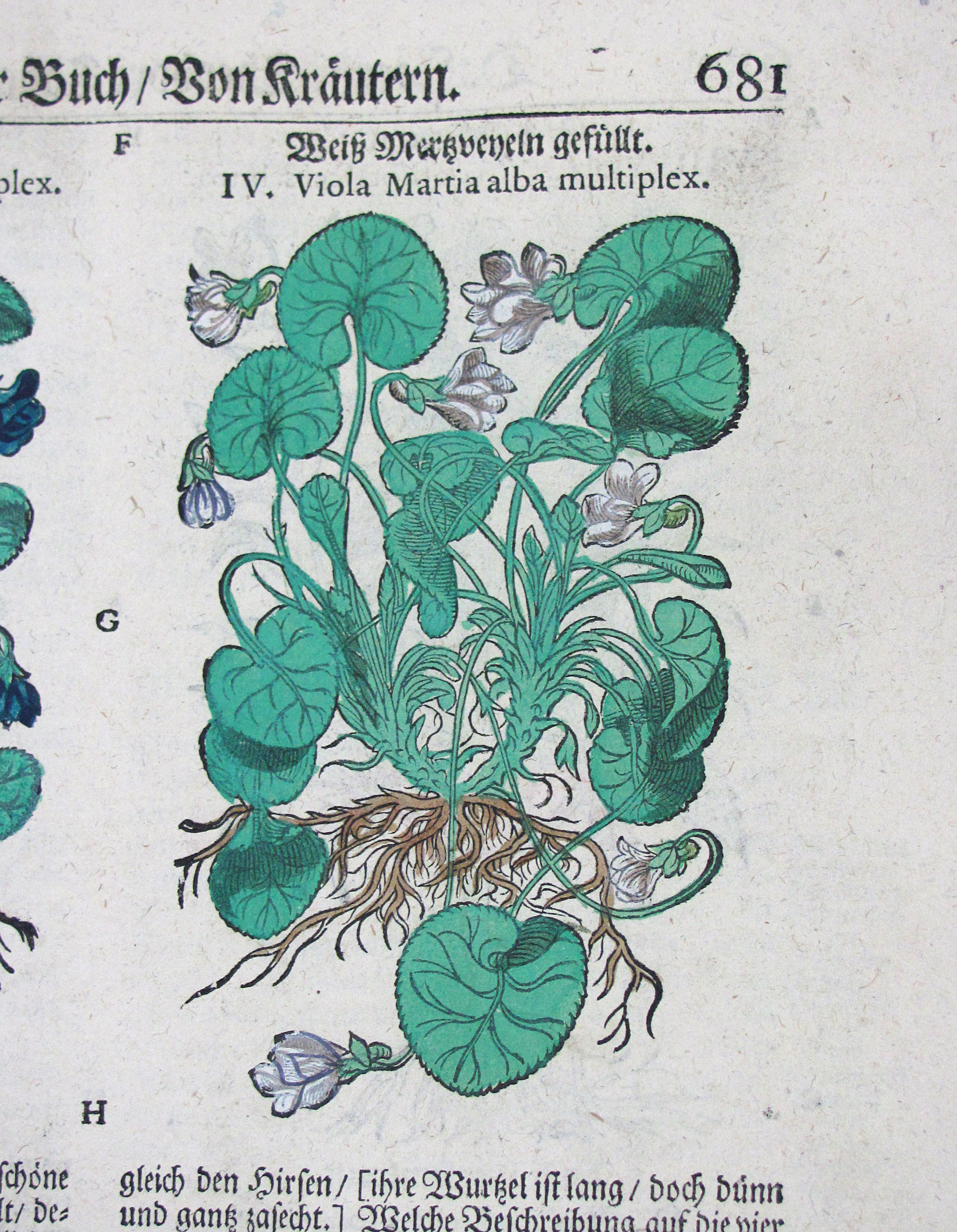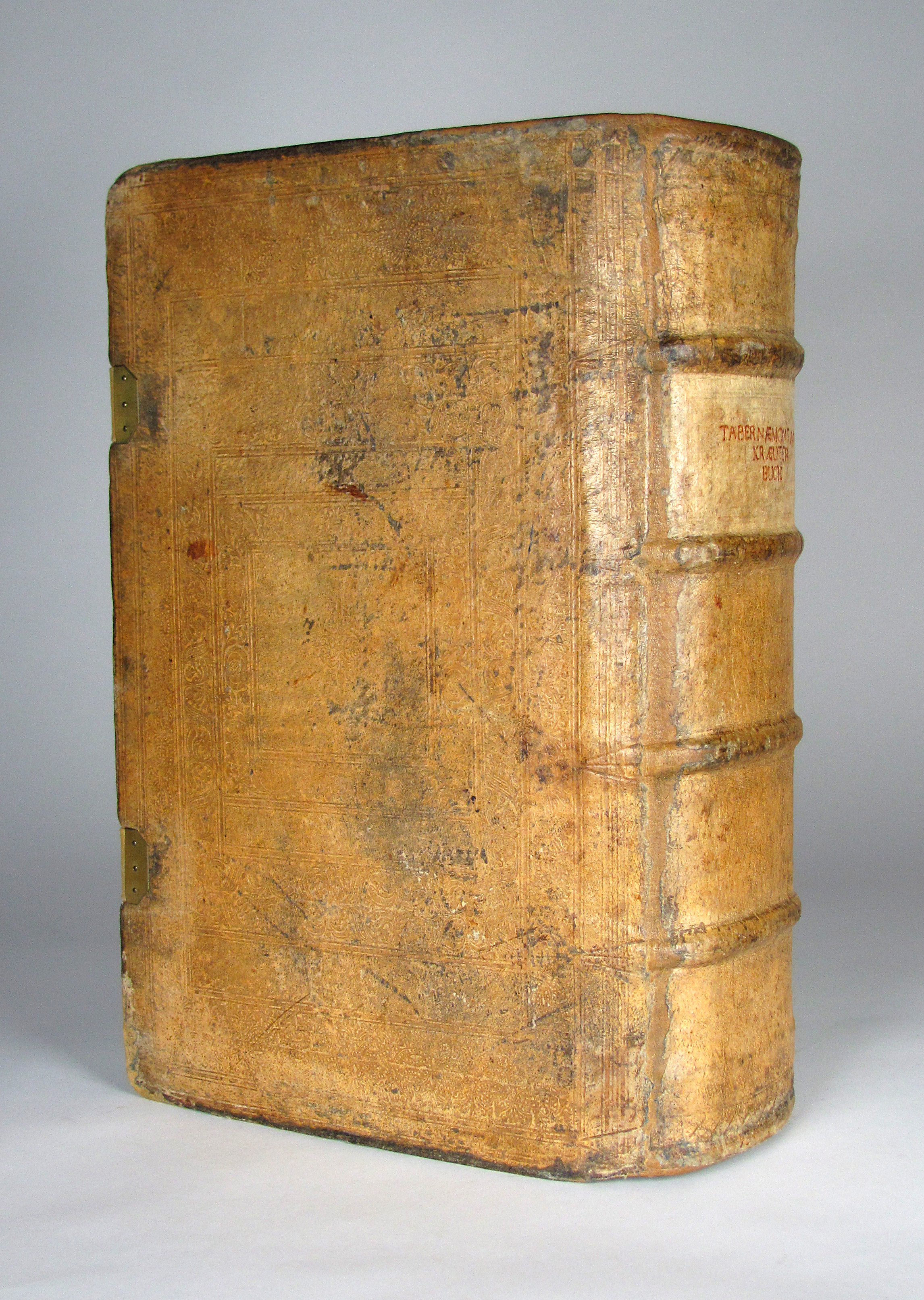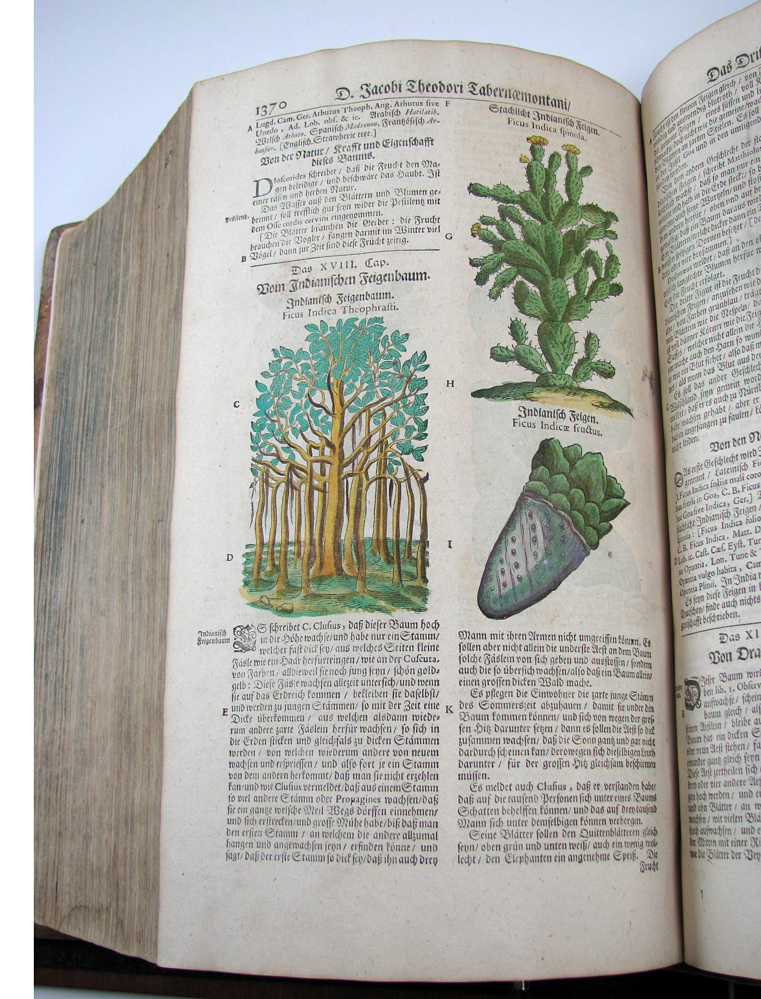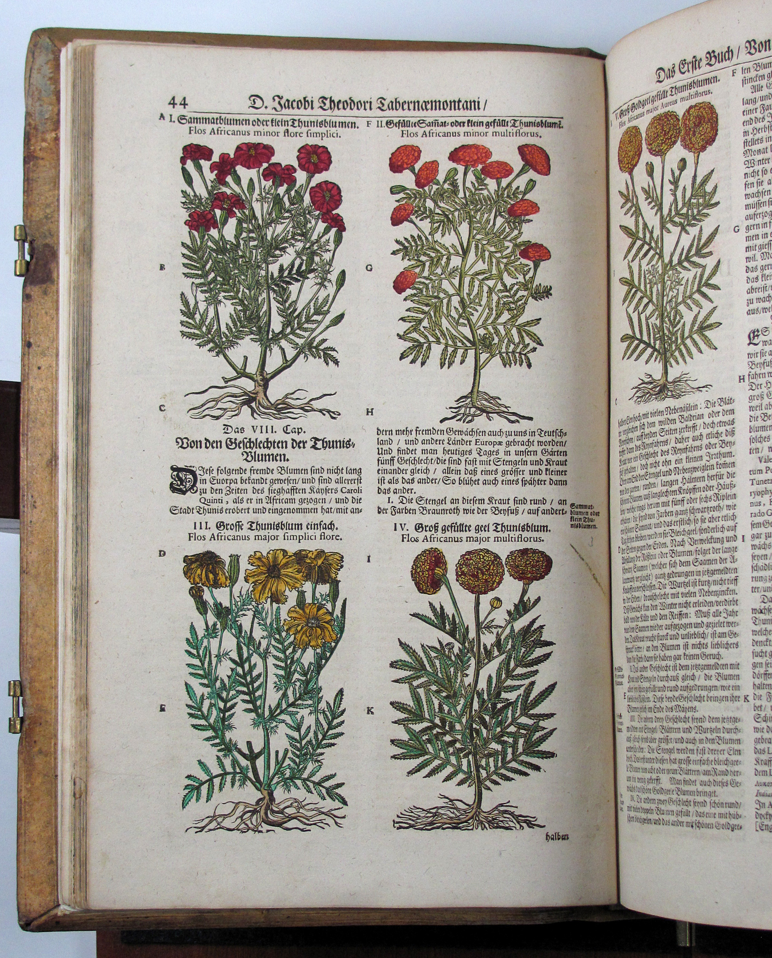 Großartiges Ausnahmeexemplar des monumentalen Kräuterbuchs, herausragend durch das durchgehende, äußerst fein ausgeführte und sehr differenzierte Handkolorit der Zeit. In über dreißig Jahren ist mir lediglich ein einziges anderes koloriertes Exemplar dieses Werks begegnet, das Kolorit bezeichnenderweise nicht bis zum Ende des Buches hin ausgeführt (Ausgabe 1664, Teile 1 und 2 altkoloriert, Teil 3 schwarz-weiß, bei Koller 30.04.2001). Grund dafür ist der riesige Umfang des Werks, welches auf über1600 Seiten mehr als 3.000 Gewächse und deren Heilwirkungen verzeichnet und dabei mit über 2400 Holzschbnitten illustriert wurde. Darüber hinaus ist das vorliegende Kolorit von bestechender Qualität. Ein große Farbpalette von zarten Aquarell- bis hin zu kräftigen Gouachefarben in Blüten und Früchten, eine große Bandbreite fein differenzierter Grün-Töne und eine sehr sorgfältige Ausführung, wie z.B. die unterschiedliche Behandlung von Blattober- und -unterseiten oder die pedantische Einhaltung der Umrisse, zeichnen das Kolorit aus. Schon bei einem anderen Kräuterbuch wäre das Kolorit sehr bemerkenswert, bei dem hier vorliegenden Umfang erscheint es umso erstaunlicher.– Tabernaemontanus (1520-90), eigentlich Jacob Dietrich latinisiert nach seinem Heimatort Bergzabern/Pfalz, war Arzt (u.a. Leibarzt von Phillip III. von Nassau-Saarbrücken und von Kurfürst Johann Casimir), davor Schüler von Brunfels und Bock. Er hatte 36 Jahre an dem umfangreichen Kräuterbuch gearbeitet, sein ganzes Vermögen in die Drucklegung investiert, doch von seinem Lebenswerk nur die Drucklegung des ersten Bands erleben können. Der zweite Band erschien posthum 1591. Die Holzschnitte gehen hauptsächlich auf die bis dahin schon veröffentlichten, bekannten Kräuterbücher zurück (z.B. Fuchs, Bock, Matthioli). Erst mit der Bearbeitung durch Caspar Bauhin, die zuerst 1613 erschien, wurde das Werk ein verlegerischer Erfolg. Bis zur letzten Ausgabe 1731 diente das Werk 150 Jahre als Einführung in die europäische Flora. „Sein Buch berücksichtigt in erster Linie die praktisch medizinische Anwendung der Pflanzen und ist in dieser Beziehung außerordentlich reichhaltig“ (Schmid).– Titel und das folgende Blatt mit kleiner Eckergänzung, S. 847-880 mit leichtem Wasserrand, S. 1497-1506 mit Tintenfleck im Rand, die letzten beiden Blätter gebräunt. Einband restauriert, Schließen und Vorsätze erneuert, insgesamt von hervorragender Gesamterhaltung.– Nissen, BBI 1930. Pritzel 9093. Nissen Kräuterbücher, 70. Arber 76. Heilmann 228.