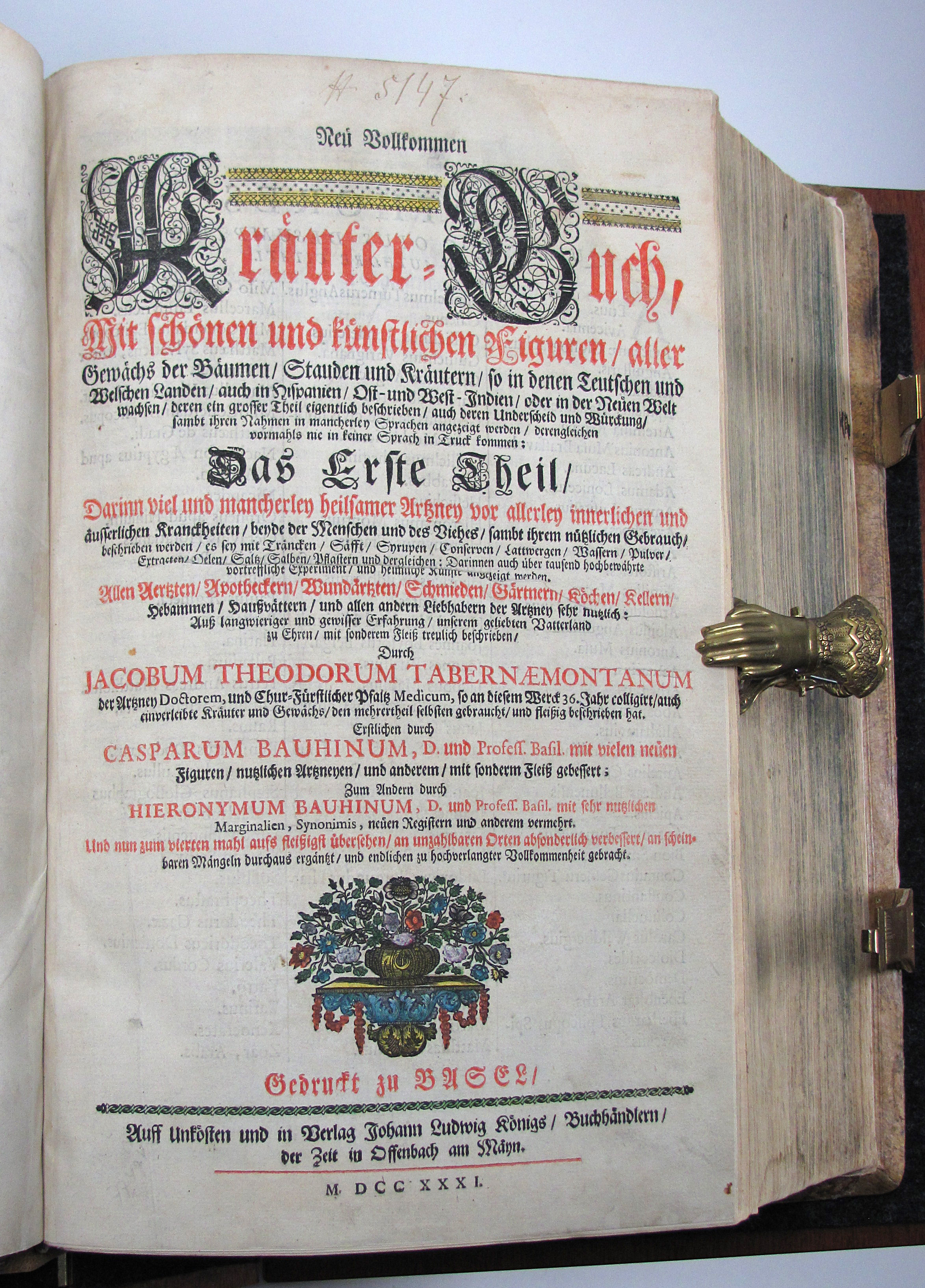 Neu vollkommen Kräuter-Buch, mit schönen, künstlichen Figuren unnd Conterfeyten, aller Gewächs… auch deren… Underscheid und Würckung, sampt ihren Nahmen in mancherley Sprachen… Erstlich durch Casparum Bauhinum… zum Andern durch Hieronymum Bauhinum… vermehret. Und nun zum vierdten mahl ausfs fleisigst übersehen…. und zu… Vollkommenheit gebracht.