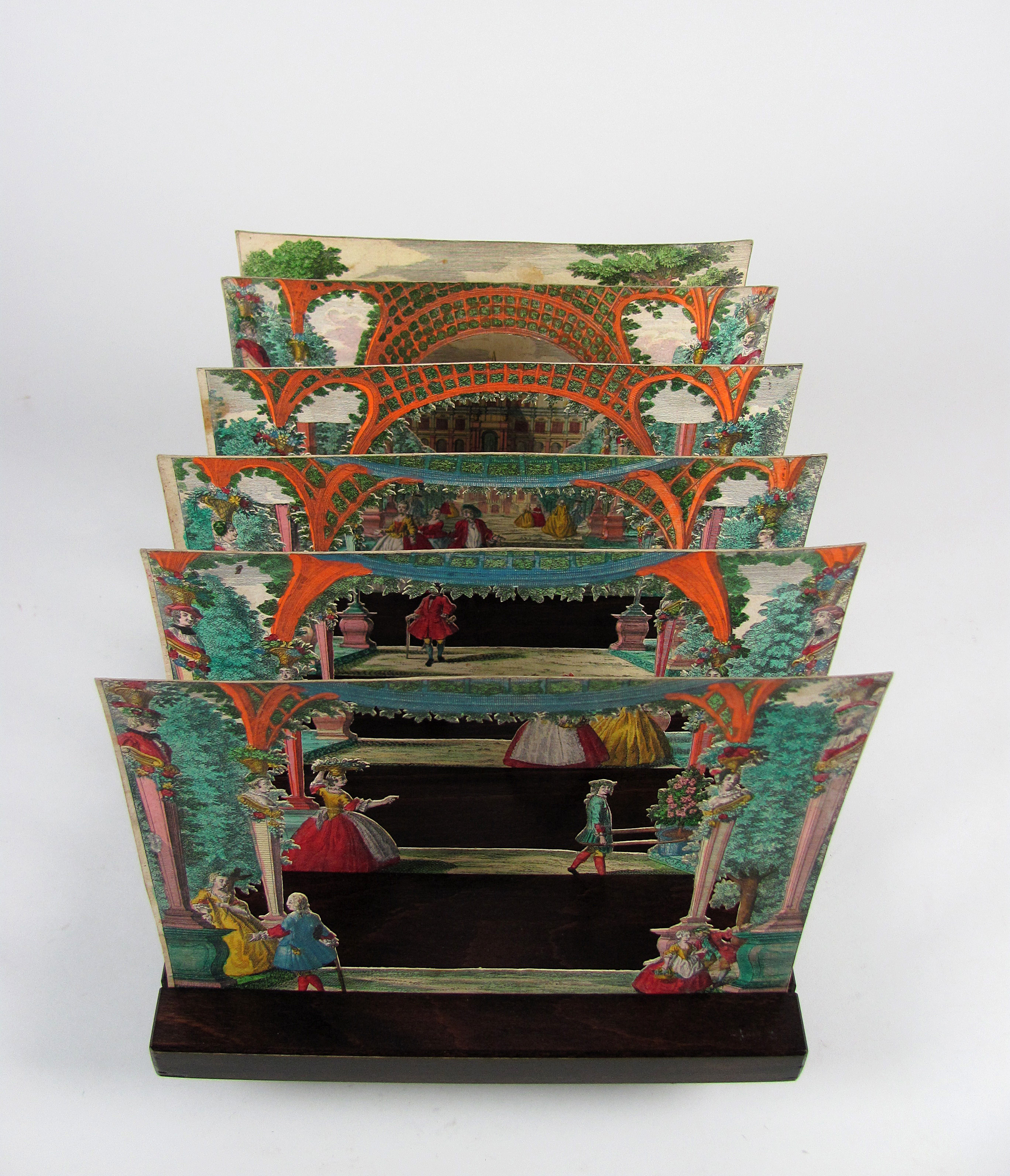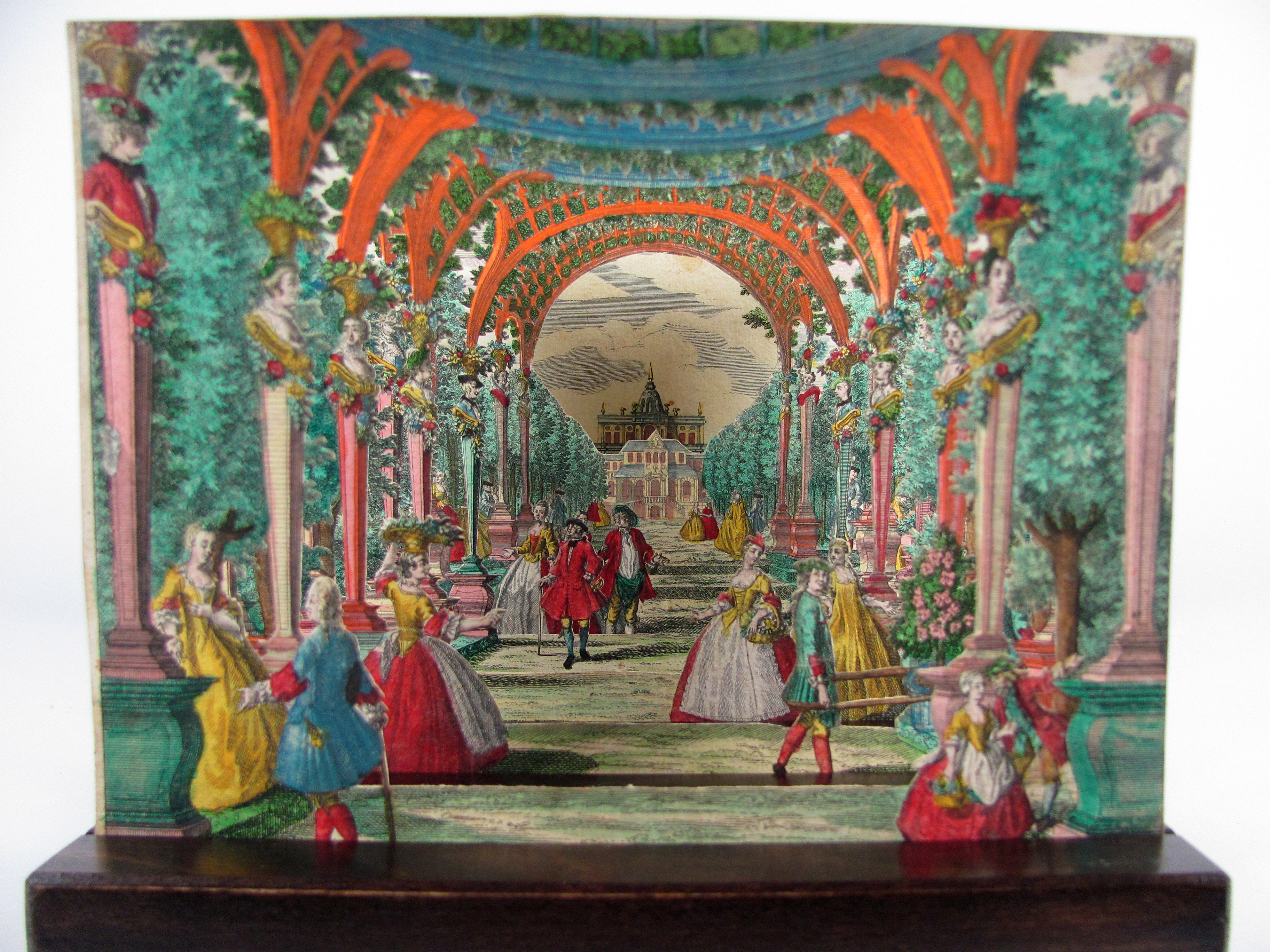 Die hübschen Kupferstichserien waren für eine räumlich gestaffelte Aufstellung mit oder ohne Guckkasten vorgesehen. Dazu wurden sie noch vor dem Verkauf auf einen Karton montiert, sehr sorgfältig ausgeschnitten und koloriert. Das Resultat sind zauberhafte, dreidimensionale Szenerien, die mit vielen Details das alltägliche Leben, die vornehme Gesellschaft, fremde Länder, Kuriositäten oder Bibelgeschichten darstellen. Gestochen wurden die Blätter von Martin Engelbrecht nach den Zeichnungen von Jeremias Wachsmuth (1711-71) und Johann David Nesselthaler (1717-66). Naturgemäß sind die fragilen Papierkunstwerke oft beschädigt oder unvollständig, gute Exemplare sind deshalb selten und gesucht. Es gab drei verschiedene Formate, hier vorliegend das größte.– Hübsches und tadellos erahltenes Diorama. Milano Nr. 8 und Abb. S. 41 (inkomplette Serie).– Vgl. Schott, Engelbrecht, S. 145 f. Füsslin u.a, Der Guckkasten S. 46 f. Ganz, Die Welt im Kasten, S. 53 f. Slg. Nekes 84 ff.
