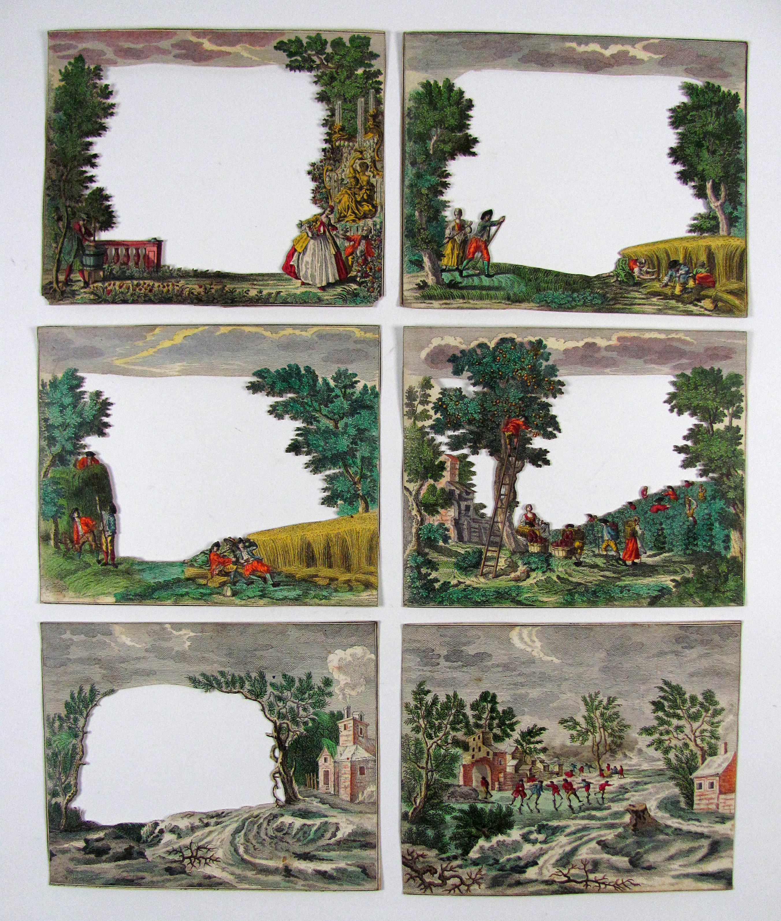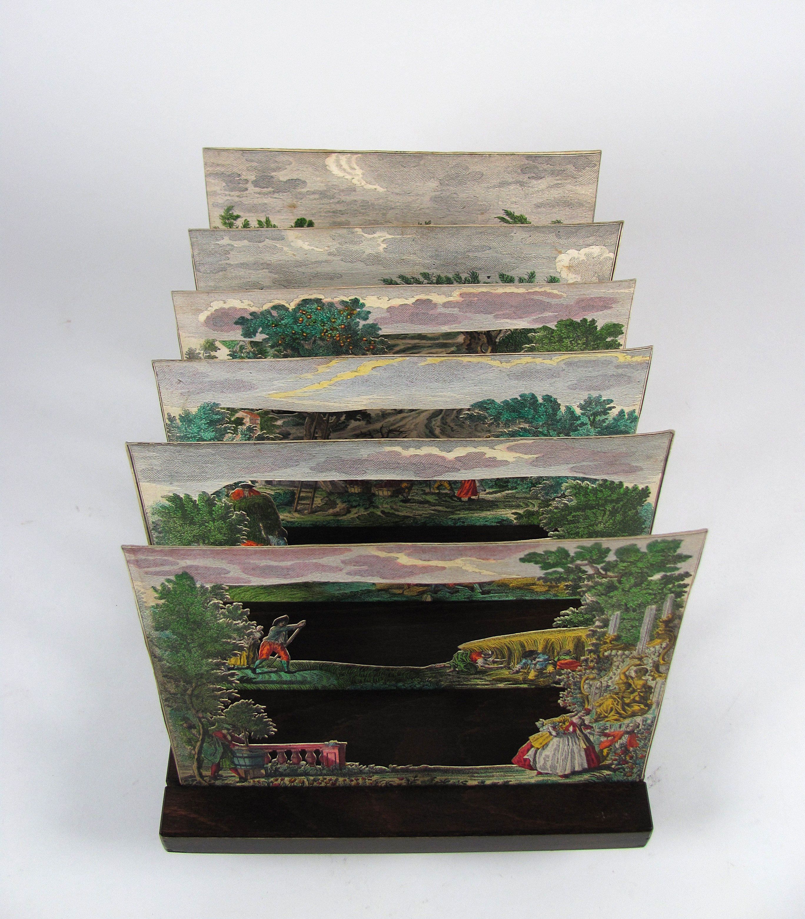 Die hübschen Kupferstichserien waren für eine räumlich gestaffelte Aufstellung mit oder ohne Guckkasten vorgesehen. Dazu wurden sie noch vor dem Verkauf auf einen Karton montiert, sehr sorgfältig ausgeschnitten und koloriert. Das Resultat sind zauberhafte, dreidimensionale Szenerien, die mit vielen Details das alltägliche Leben, die vornehme Gesellschaft, fremde Länder, Kuriositäten oder Bibelgeschichten darstellen. Gestochen wurden die Blätter von Martin Engelbrecht nach den Zeichnungen von Jeremias Wachsmuth (1711-71) und Johann David Nesselthaler (1717-66). Naturgemäß sind die fragilen Papierkunstwerke oft beschädigt oder unvollständig, gute Exemplare sind deshalb selten und gesucht. Es gab drei verschiedene Formate, hier vorliegend das größte.– Hübsches, sehr gut erhaltenes Diorama mit attraktivem Motiv. Das erste Blatt mit zwei kleinen Eckverlusten unten.– Milano Nr. 27 und Abb. S. 62.– Vgl. Schott, Engelbrecht, S. 145 f. Füsslin u.a, Der Guckkasten S. 46 f. Ganz, Die Welt im Kasten, S. 53 f. Slg. Nekes 84 ff.