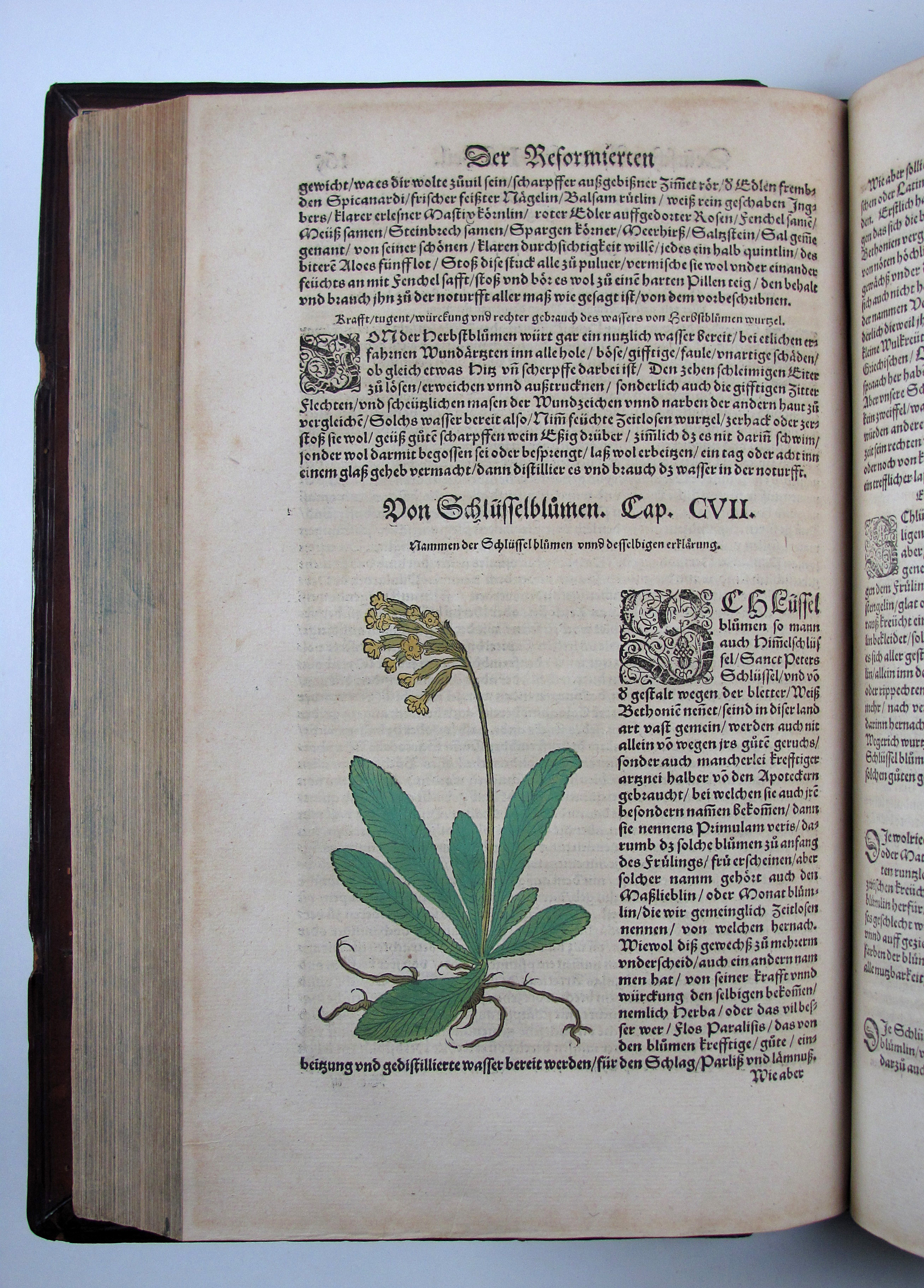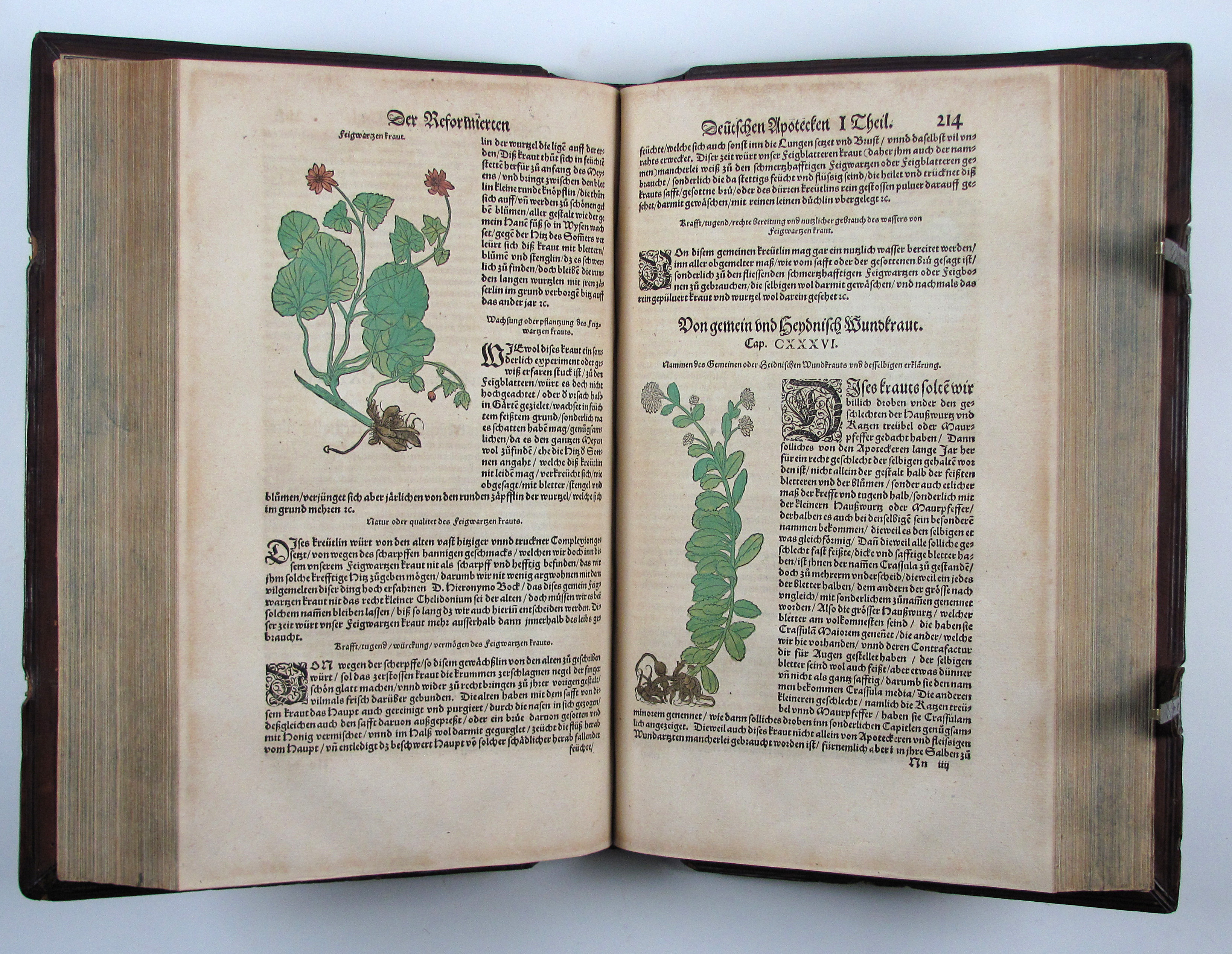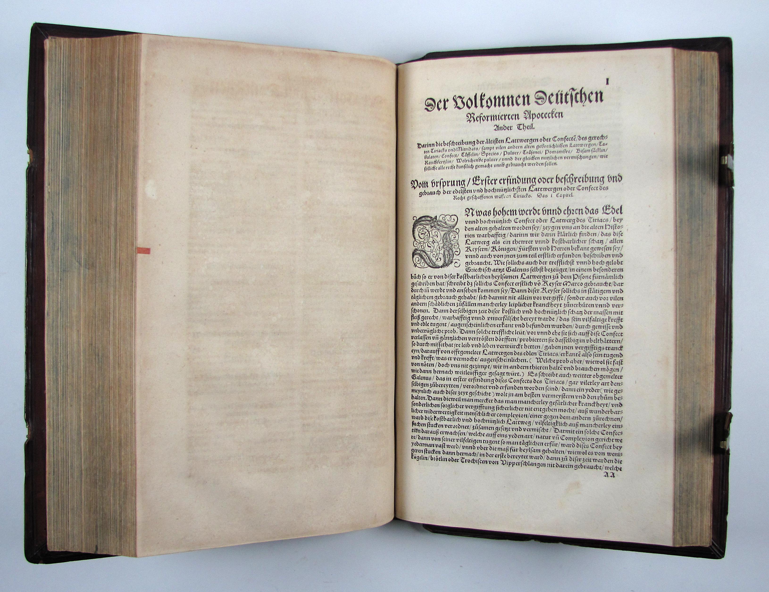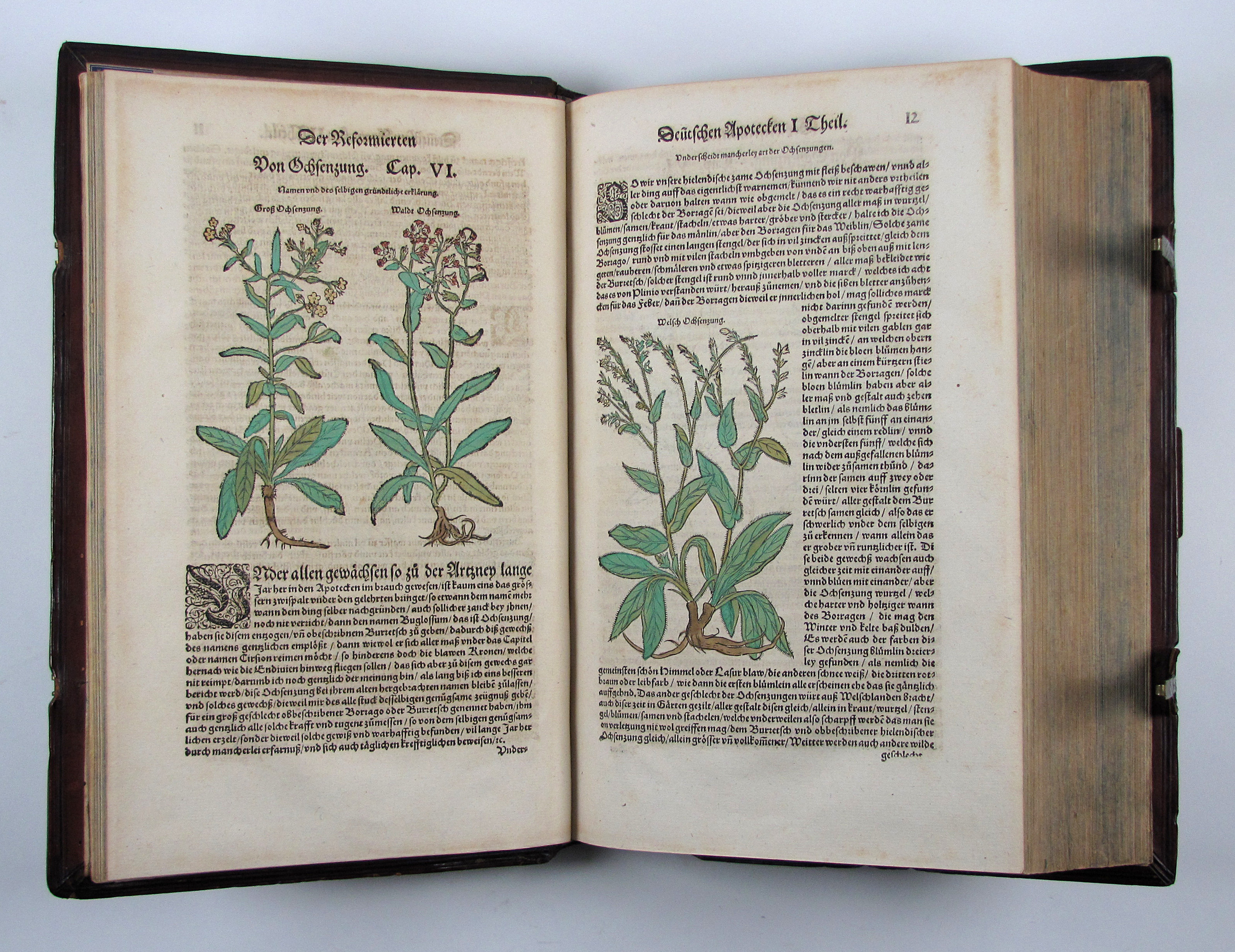 Einzige unter diesem Titel, posthum erschienene Ausgabe. Hunt nimmt an, daß der Herausgeber das Werk aus dem nachgelassenen Material Ryffs und den bis dahin erschienenen Schriften zusammengestellt und somit selber eigentlich ein neues Werk geschaffen hat.– Die Holzschnitte gehen auf Kandels Illustrationen zu Bock’s Kreuterbuch. Ryff wurde von Zeitgenossen, namentlich von Gessner und Fuchs, des Plagiats beschuldigt, stellten seine Schriften doch Kompilationen von bereits vorhandenem Material dar. In der Praxis war er nach Stationen in Nürnberg und Straßburg, wo er Nachfolger des Hieronymus Braunschweig gewesen sein soll, vor allem in Mainz erfolgreich. Dort schaffte er sich durch sein Wirken einen guten Ruf als Mediziner und Apotheker.– Exemplar in differziertem Altkolorit und einem prächtigen Einband der Zeit. Titel mit Wasserfleck, ansonsten innen wie außen von vorzüglicher Erhaltung. Provenienz: Juan Carlos Ahumada (Christies, New York, 1992).– Hunt I, 114. Nissen BBI 1707. Heilmann 192.