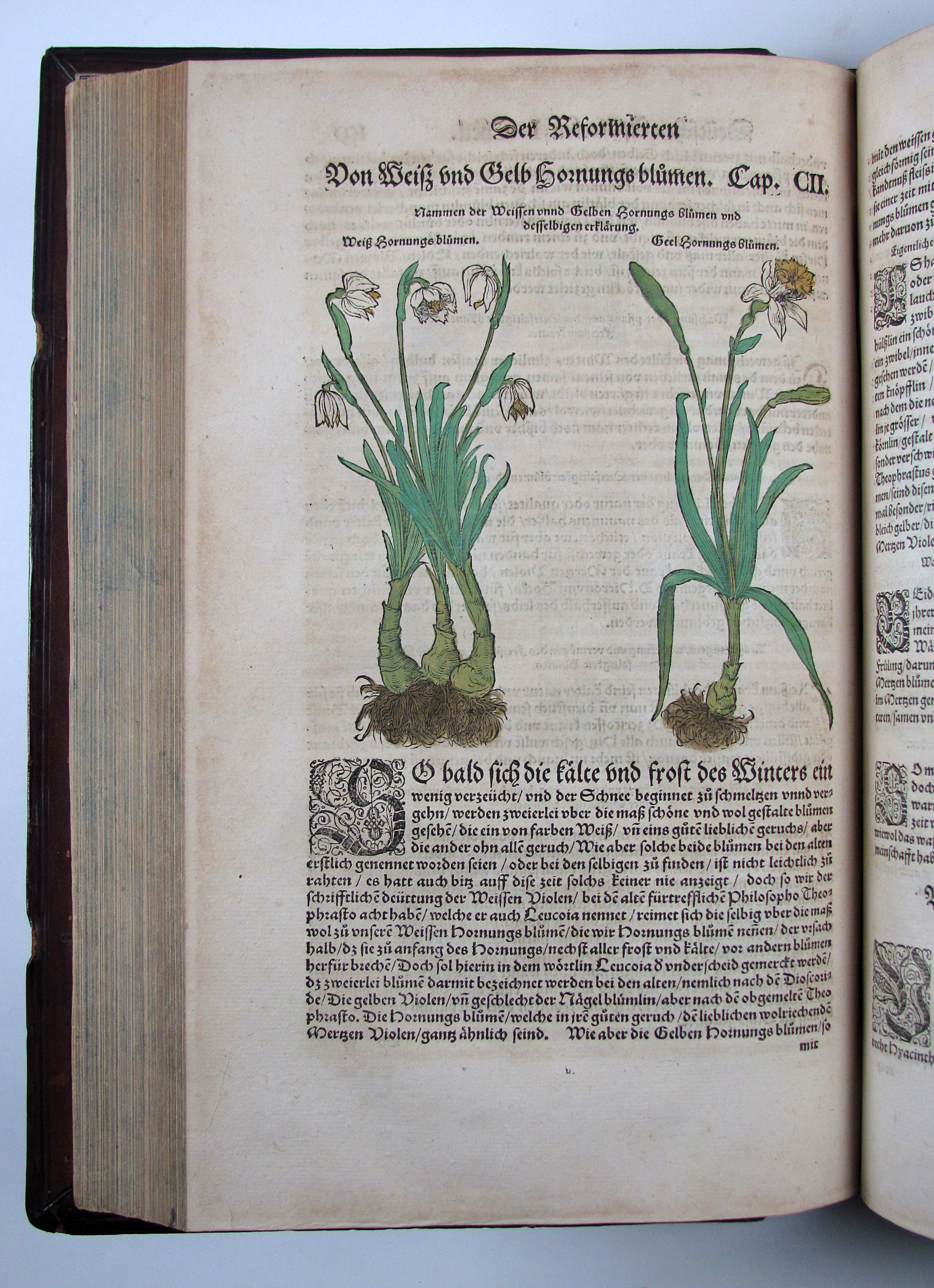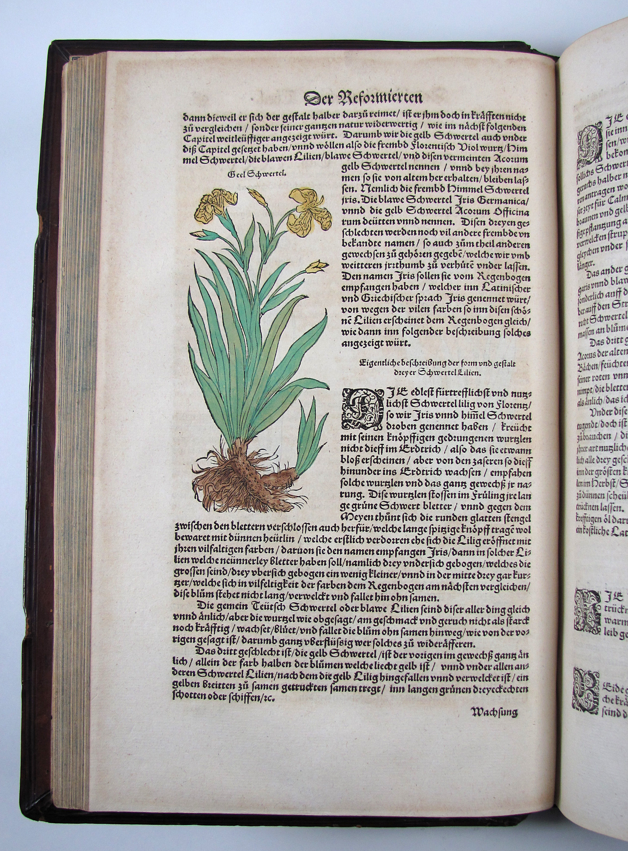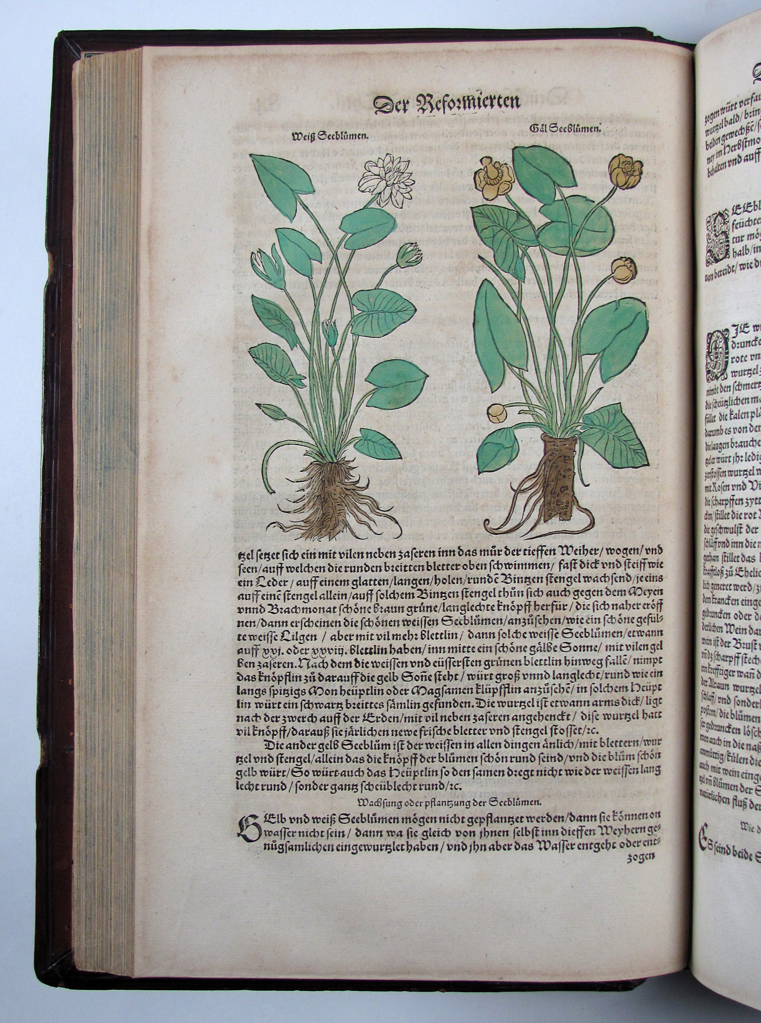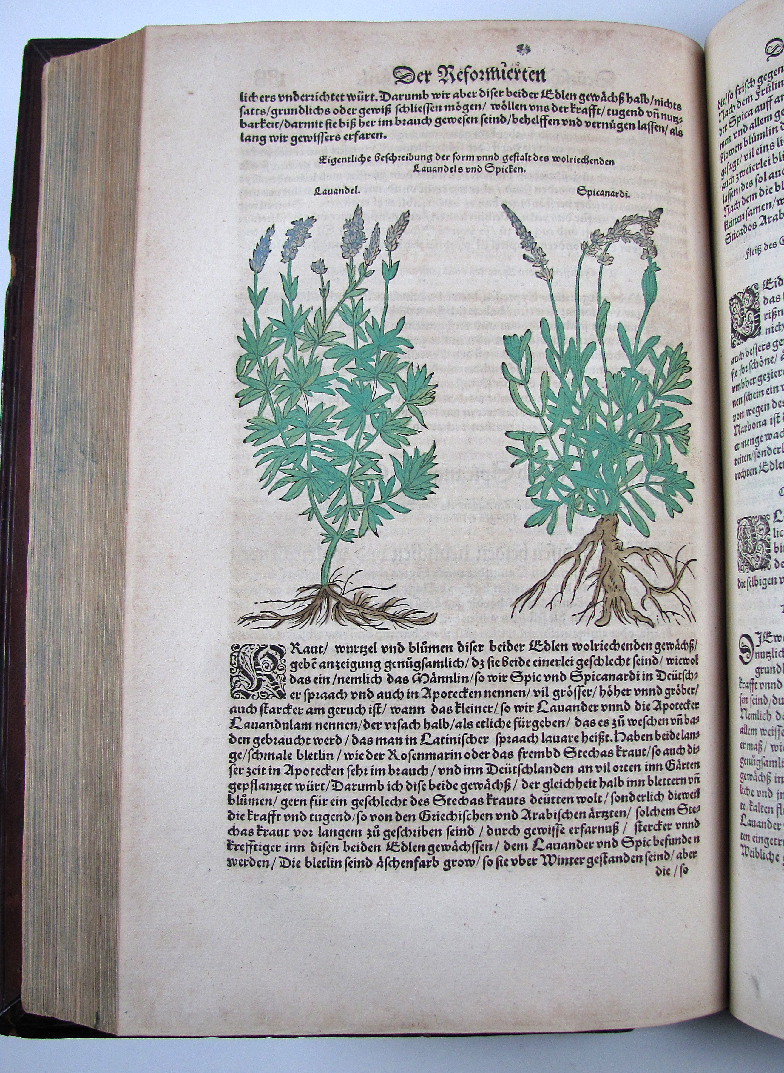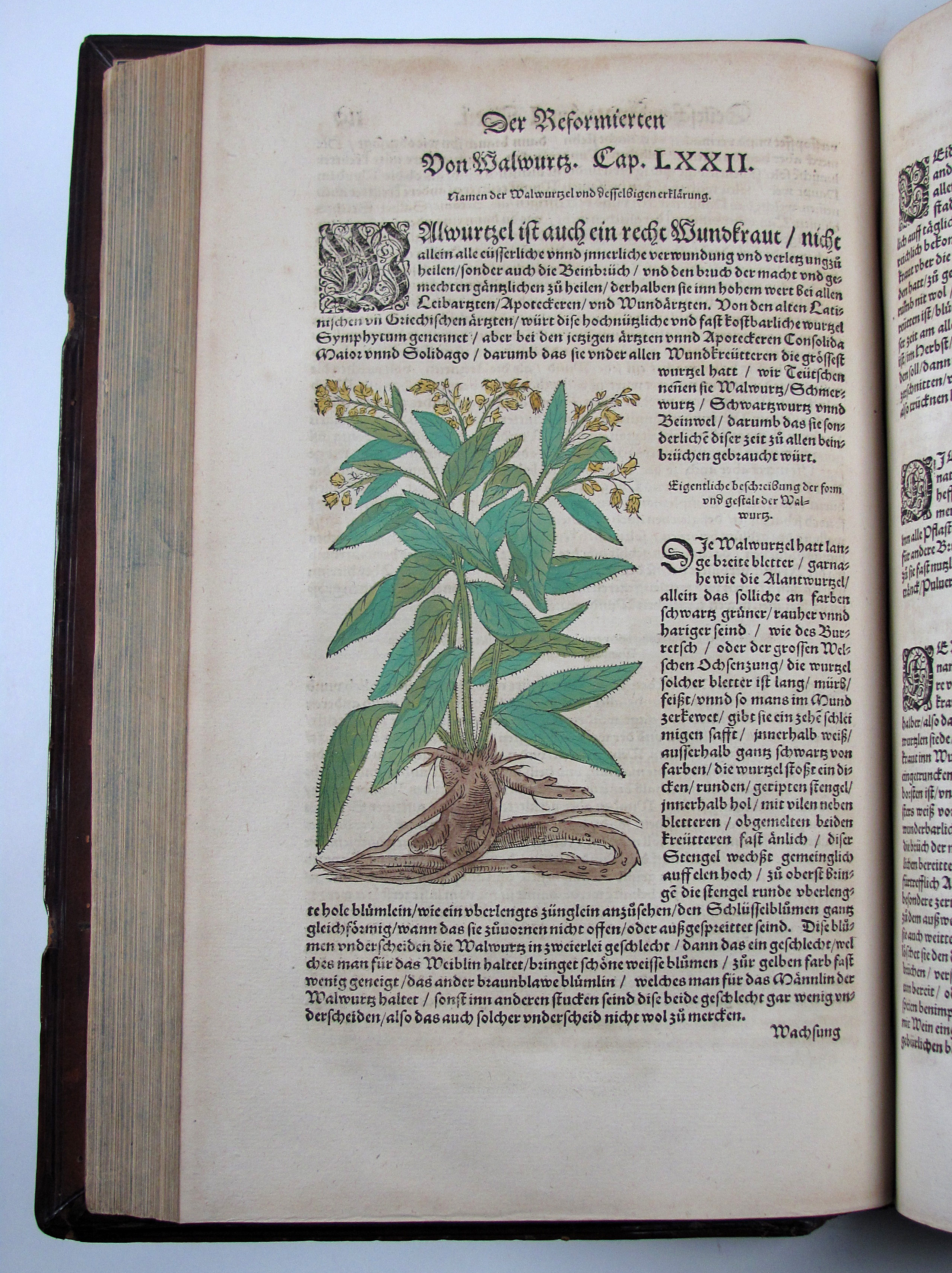 Einzige unter diesem Titel, posthum erschienene Ausgabe. Hunt nimmt an, daß der Herausgeber das Werk aus dem nachgelassenen Material Ryffs und den bis dahin erschienenen Schriften zusammengestellt und somit selber eigentlich ein neues Werk geschaffen hat.– Die Holzschnitte gehen auf Kandels Illustrationen zu Bock’s Kreuterbuch. Ryff wurde von Zeitgenossen, namentlich von Gessner und Fuchs, des Plagiats beschuldigt, stellten seine Schriften doch Kompilationen von bereits vorhandenem Material dar. In der Praxis war er nach Stationen in Nürnberg und Straßburg, wo er Nachfolger des Hieronymus Braunschweig gewesen sein soll, vor allem in Mainz erfolgreich. Dort schaffte er sich durch sein Wirken einen guten Ruf als Mediziner und Apotheker.– Exemplar in differziertem Altkolorit und einem prächtigen Einband der Zeit. Titel mit Wasserfleck, ansonsten innen wie außen von vorzüglicher Erhaltung. Provenienz: Juan Carlos Ahumada (Christies, New York, 1992).– Hunt I, 114. Nissen BBI 1707. Heilmann 192.