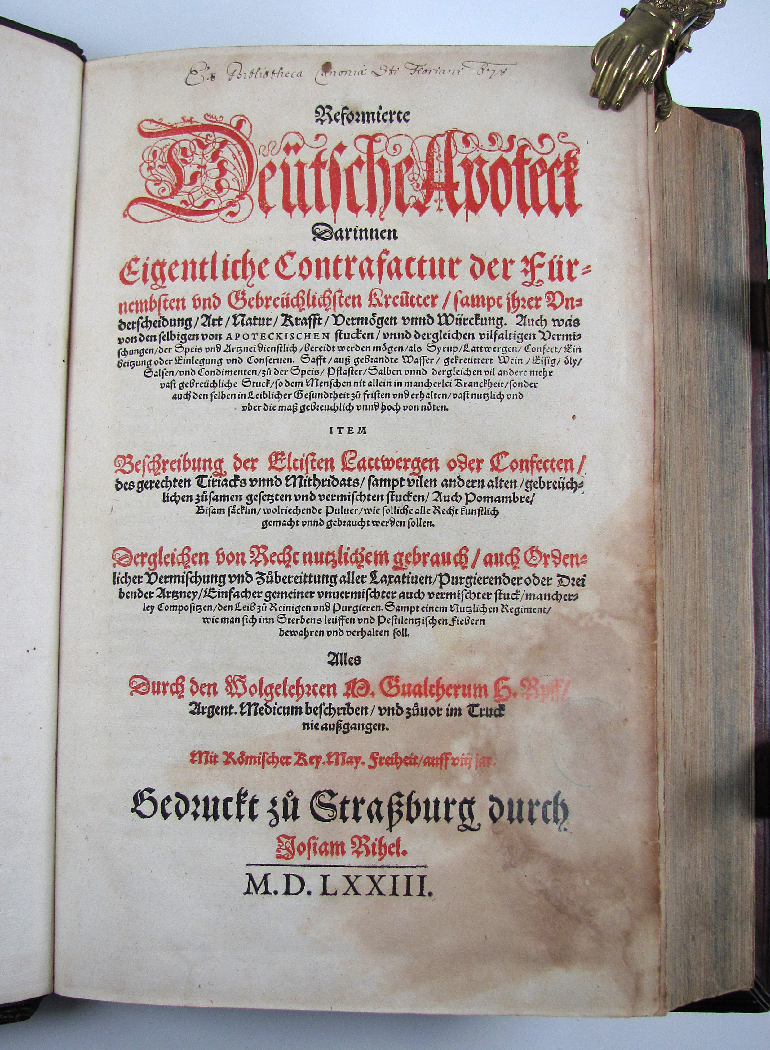 Reformierte Deutsche Apoteck. Darinnen eigentliche Contrafactur der fürnembsten und gebreuchlichsten Kreutter, sampt ihrer Underscheidung, Art…Auch was von den selbigen von Apoteckischen Stucken unnd dergleichen vilfaltigen Vermischungen…bereidt werden mögen.