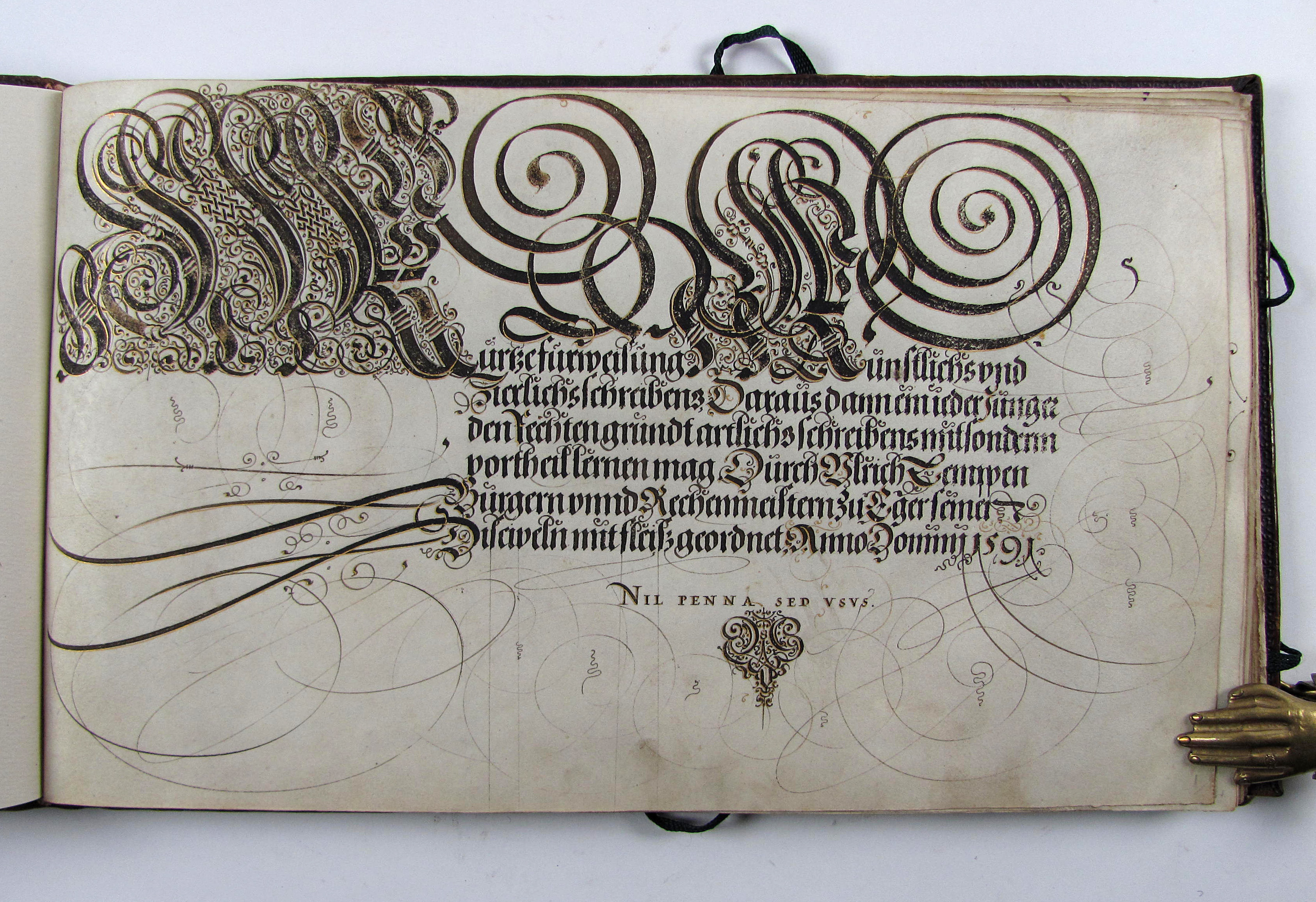 Wunderbares, qualitativ herausragendes und frühes Schreibmeisterbuch. Mit Titel und 24 Blatt, auf denen je ein Buchstabe des Alphabets als Initiale ( J = I, U = V) ein deutsches oder lateinisches Textbeispiel einleitet. Dabei werden verschiedene Schriften verwendet, deren Alphabet teilweise in der unteren Zeile wiederholt wird.– Die Landesbibliothek Coburg besitzt ein Manuskript von Ulrich Lemp mit einem fast gleich lautenten Titel und einem Umfang von 12 Blatt von 1583. Somit ist er seit mindestens 1583 als deutscher Schrifthalter in Eger nachzuweisen, 1594 ist er dort gestorben (vgl. Hubay, Handschriften der LB Coburg, MS 16). Erwähnenswert ist, daß Lemp bei Doede, Deutsche Schreibmeisterbücher, keine Erwähnung findet. Ein Qualitätsvergleich mit Cristoph Fabius Brechtel, einem berühmten Vertreter seiner Zunft, offenbart die hohe Qualität der Arbeit.– Von guter Gesamterhaltung. Einband restauriert, dabei der vordere Vorsatz und vier Bindebänder erneuert. Etwas knapp im Kopfsteg, gegen Ende im Außensteg mit Wasserrand.