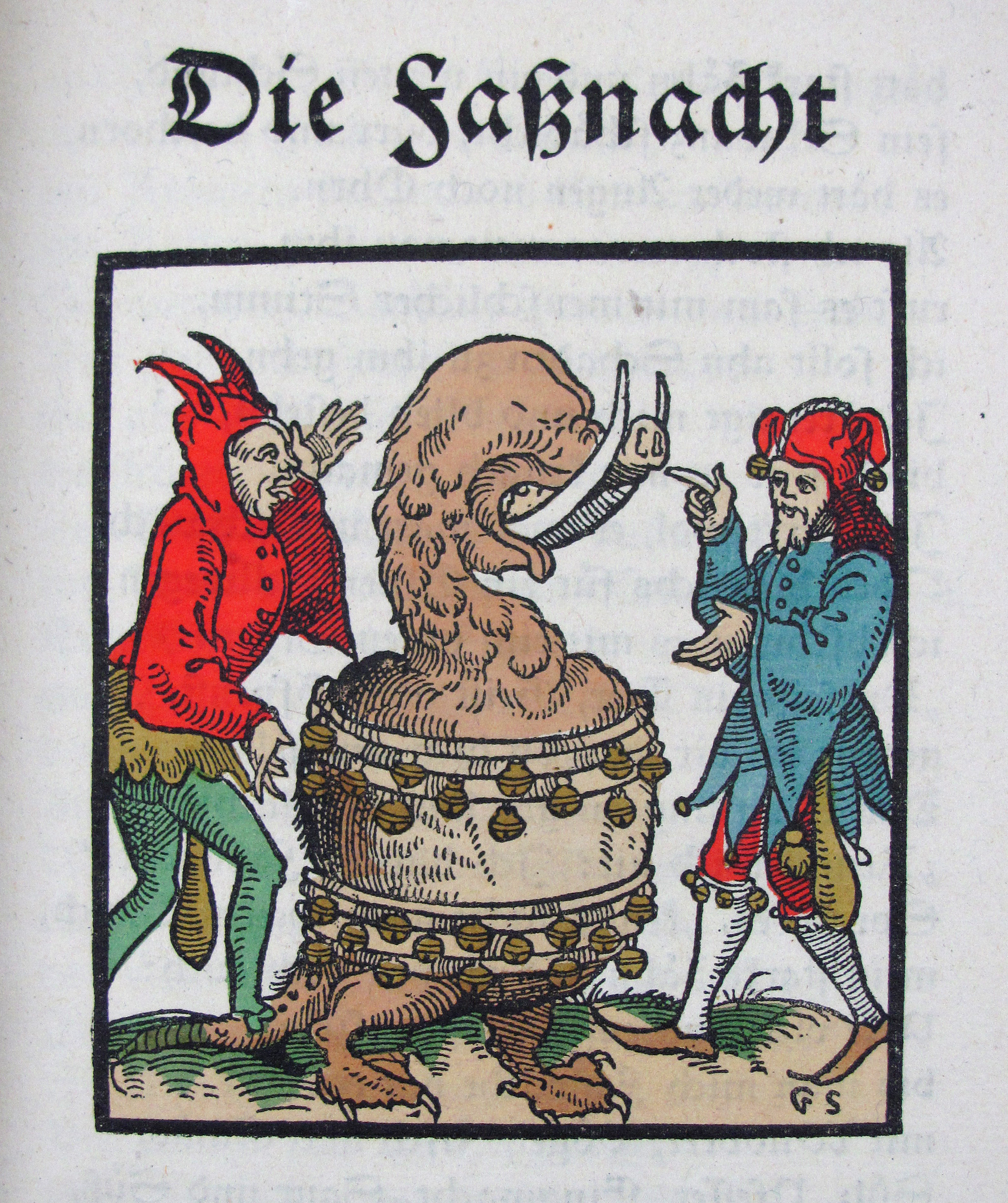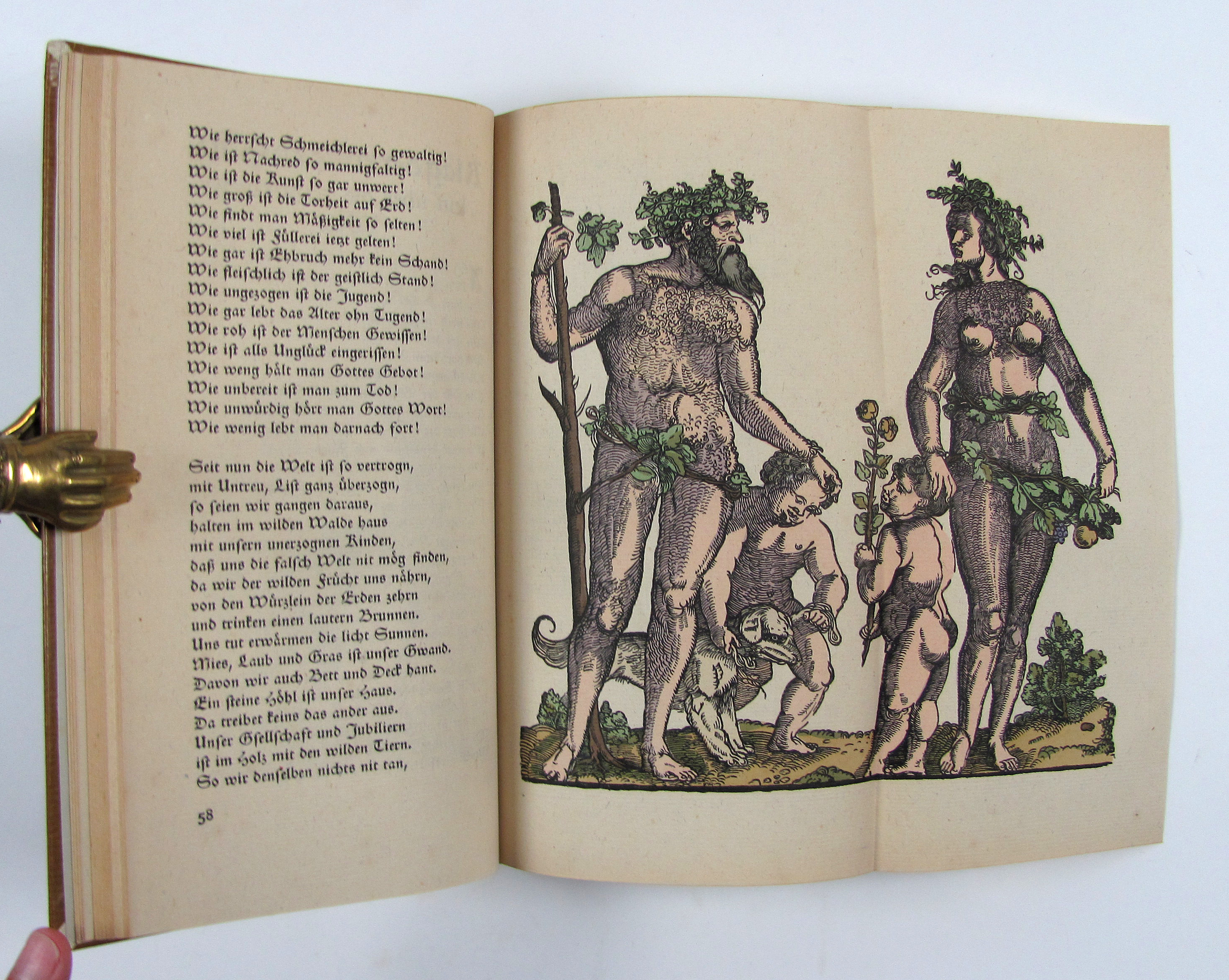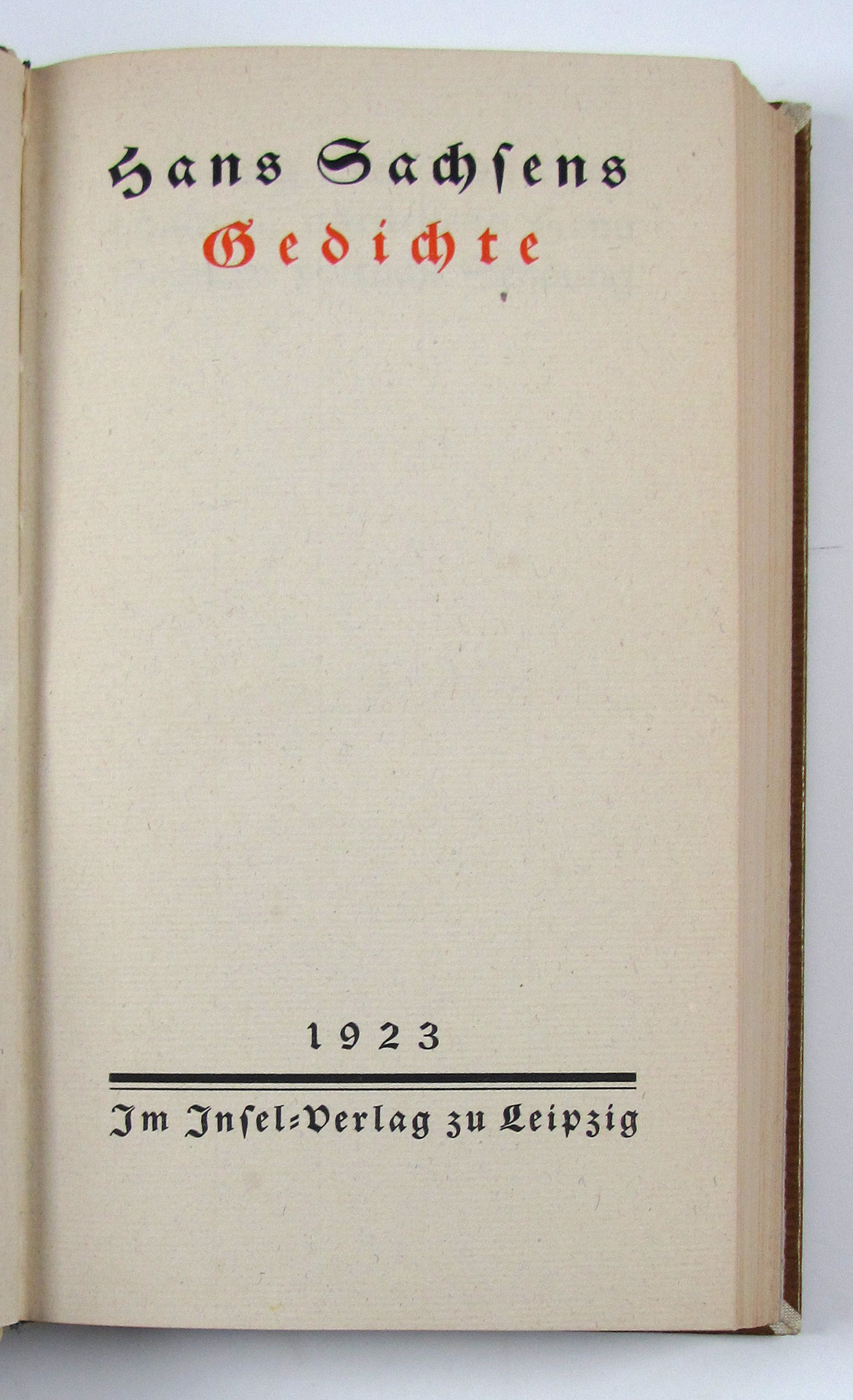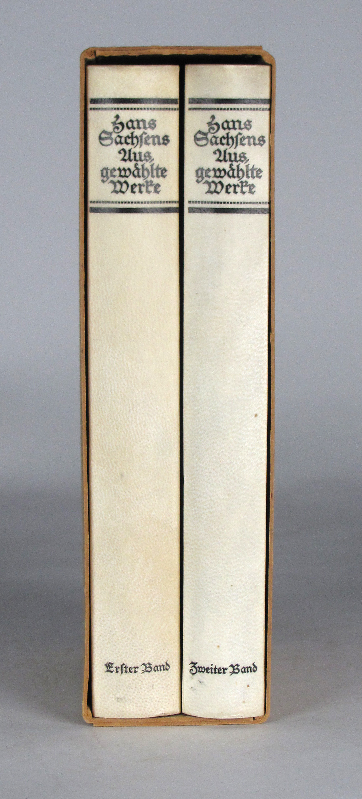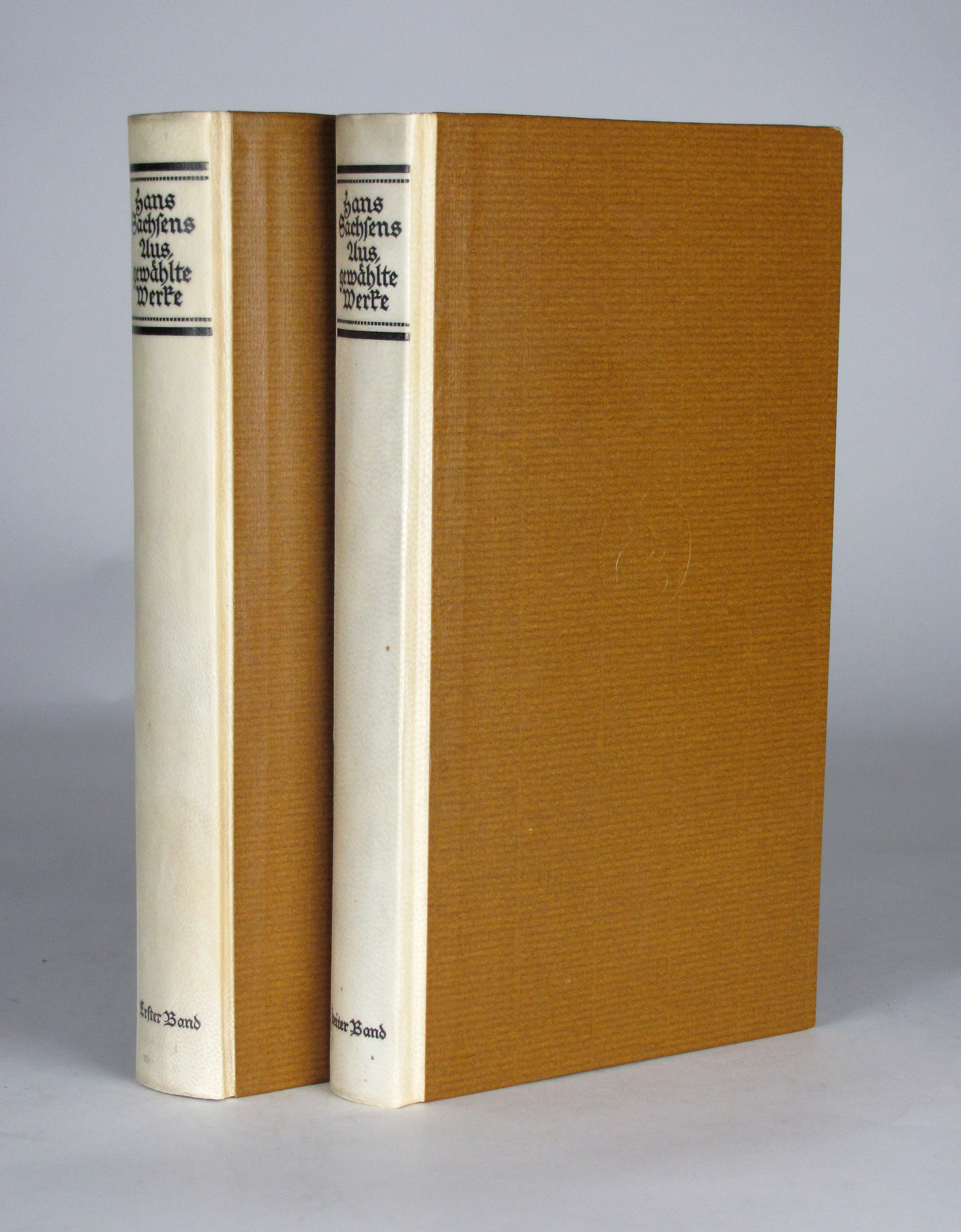 7.-10. Tausend.– Schöne Ausgabe, in Fraktura auf Bütten gedruckt und mit schönem Handkolorit der Schnitte. Sie reproduzieren die zeitgenössischen Illustrationen von Dürer, Beham, Amman u.a.– Band 1 mit Lyrik, Band 2 mit Dramen.– Neuwertiges Exemplar.– Sarkowski 1386 B.