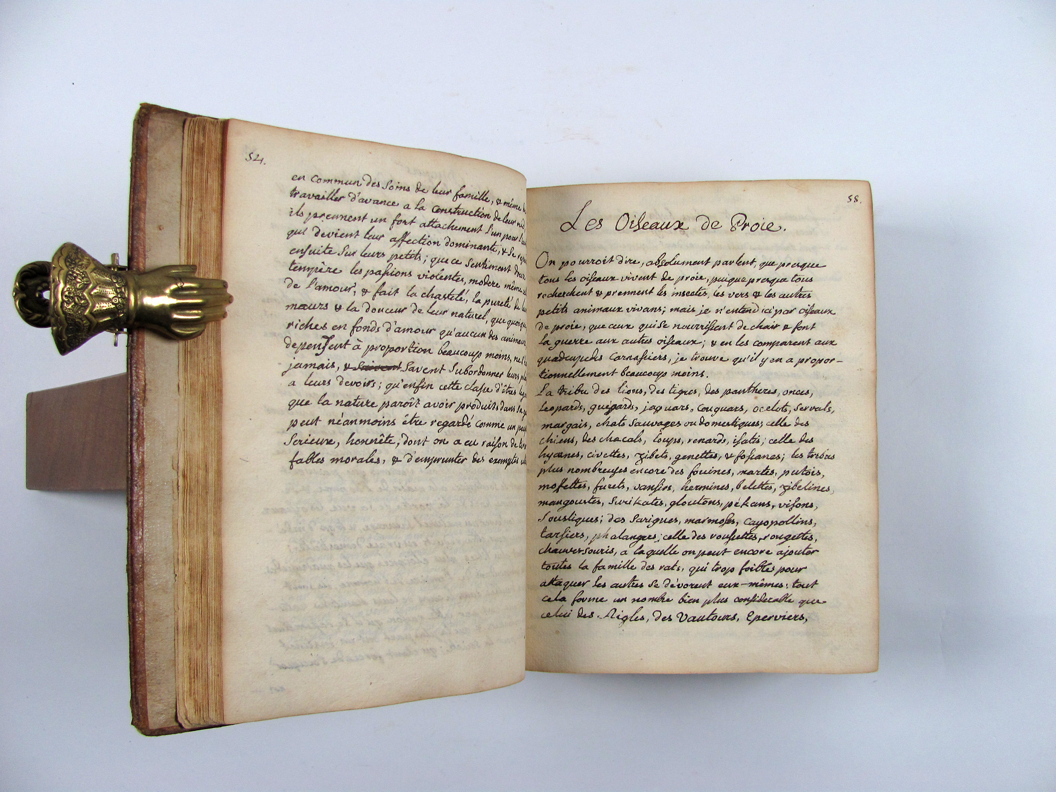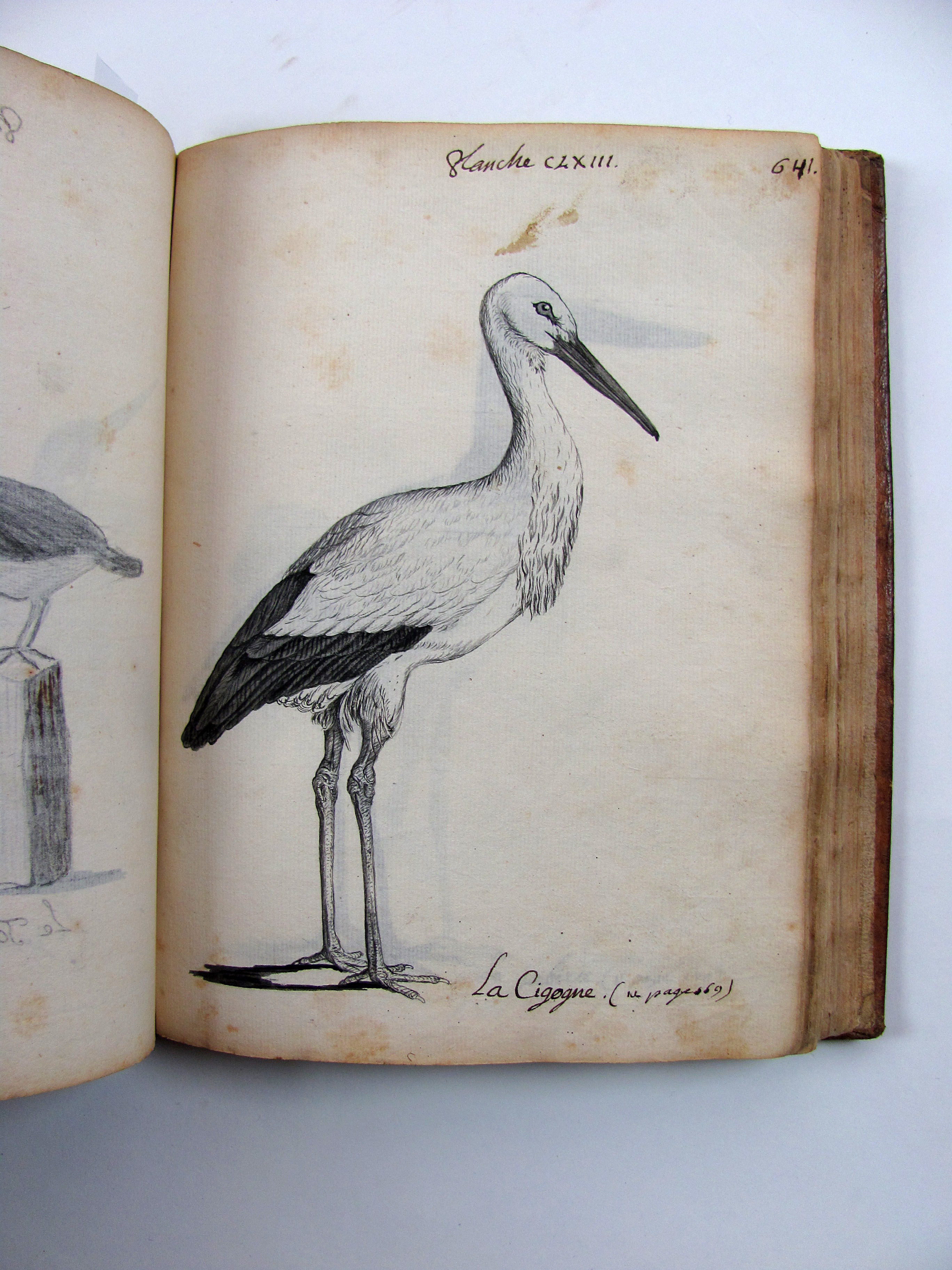 Beeindruckend umfangreiches Manuskript, wohl eines begabten Amateurs. Die Zeichnungen sind von guter Qualität. Über den Verfasser kann ich nichts in Erfahrung bringen, außer, dass er wohl Mitglied der Akademie der Wissenschaften zu Turin war. Ob das Manuskript veröffentlicht werden sollte oder nicht, muss Spekulation bleiben. Vieles spricht dafür, dass es für private Zwecke angefertigt worden ist, dafür wiederum ist der Umfang der Arbeit und die Qualität der Zeichnungen erstaunlich.– Die Gliederung des Werks ist etwas willkürlich, einzelne Kapitel beschäftigen sich in loser Folge z.B. mit Raubvögeln, Wasservögeln, nicht flugfähigen Vögeln etc. Die 510 Seiten sind bis zur Seite 640 paginiert, was daran liegt, dass es immer wieder Sprünge in der Paginierung gibt, die daher rühren, dass der Autor offensichtlich vorher nicht wusste, wie lange das Kapitel werden würde, an dem er jeweils momentan arbeitet und sich größere Reserven gelassen hat. Auch die Nummerierung der Tafeln weißt immer wieder Lücken auf, ohne dass dabei Tafeln fehlen würden. Augenscheinlich fehlen keine Tafeln, lediglich an einer Stelle ist ein Zweifel angebracht, da hier zwei Stege am Innenrand stehen. Dennoch schwer vorstellbar, dass hier eine ausgeführte Tafel eingebunden war, die später herausgeschnitten wurde; ausgeschlossen werden kann es jedoch nicht mit Sicherheit. Auch die Tafeln sind alt paginiert, ebenso mit Sprüngen.– Seitenkollation: Titel, Discours S. 1-54, S- 55-96, S. 97 leer, 1 Bl. leer, S. 119-135, S. 136 leer, S. 147-222, S. 258-319, S. 320, 321 leer, S. „Marge“ 1-43, S. 349-380, 1 Bl. leer, S. 381-414, § Bl. leer, S. 445-475, S. 489-515, S. 516 leer, S. 528-554, S. 555 leer, S. 567-614, 1 Bl. leer, S. 615-640.– Insgesamt von guter Gesamterhaltung, Tafeln vereinzelt minimal fleckig, einige wenige Tafeln etwas mehr betroffen. Einband mit leichten Gebrauchsspuren.