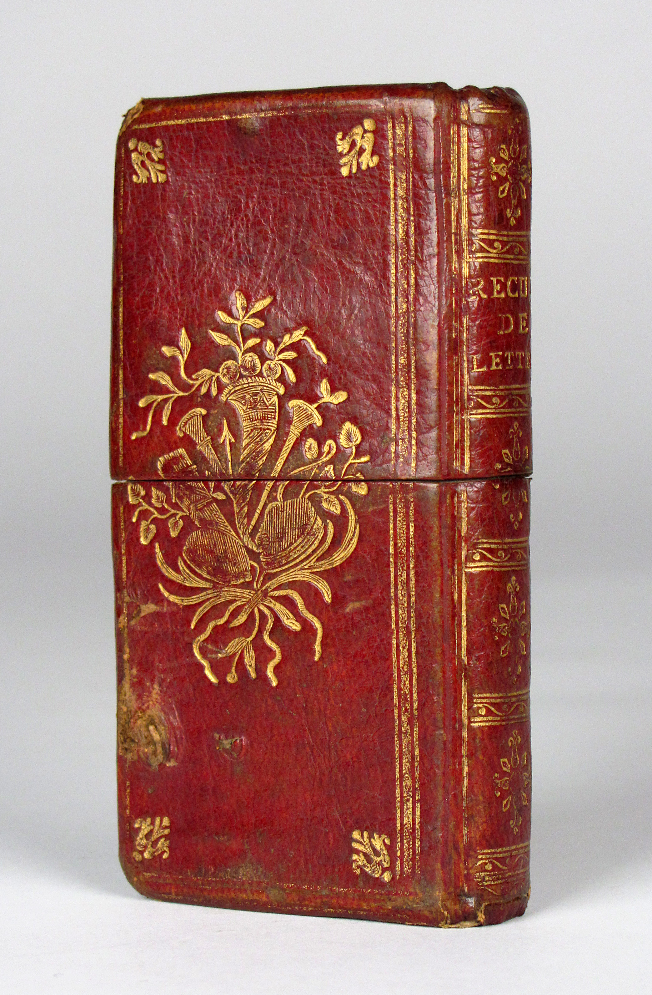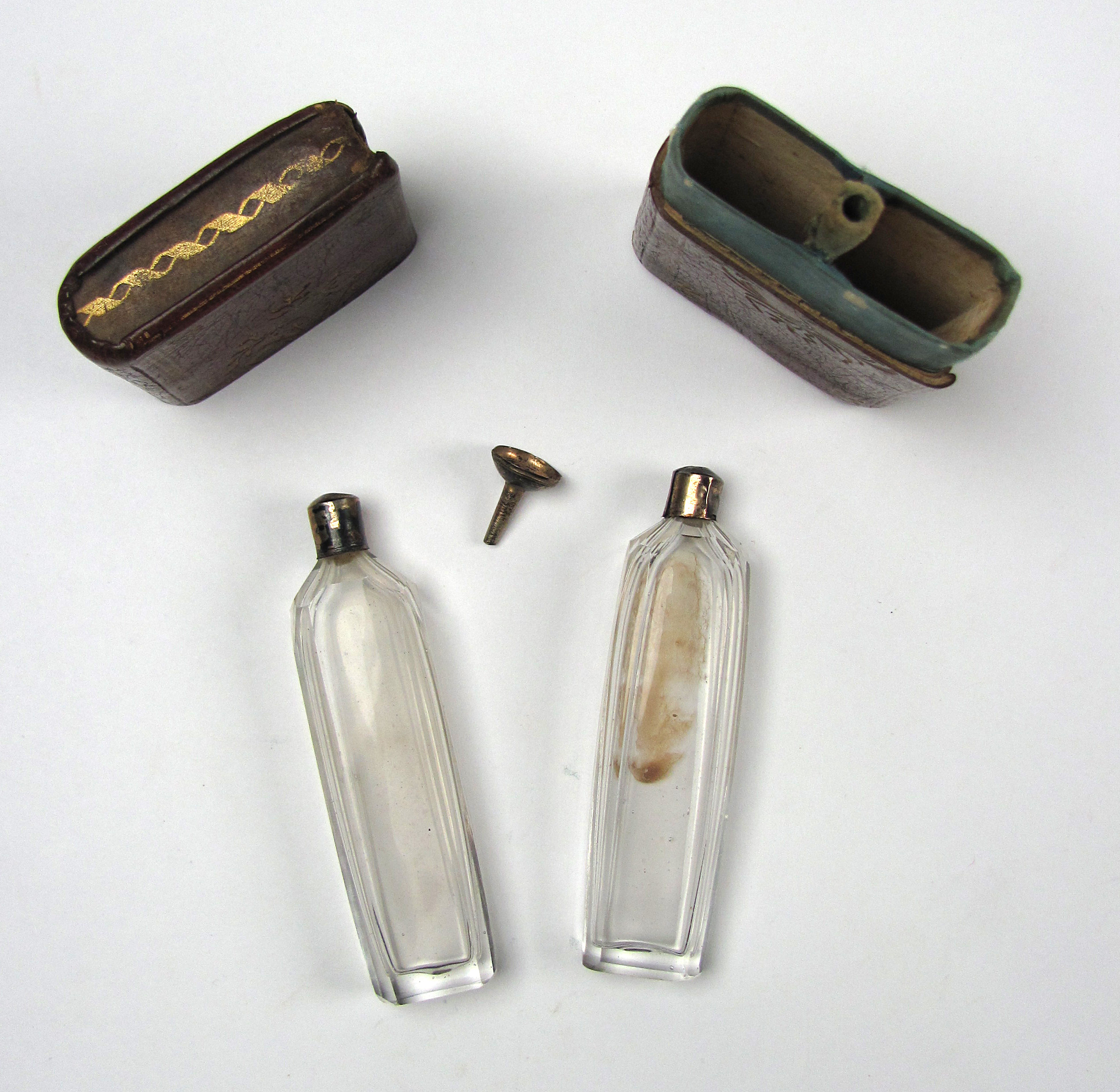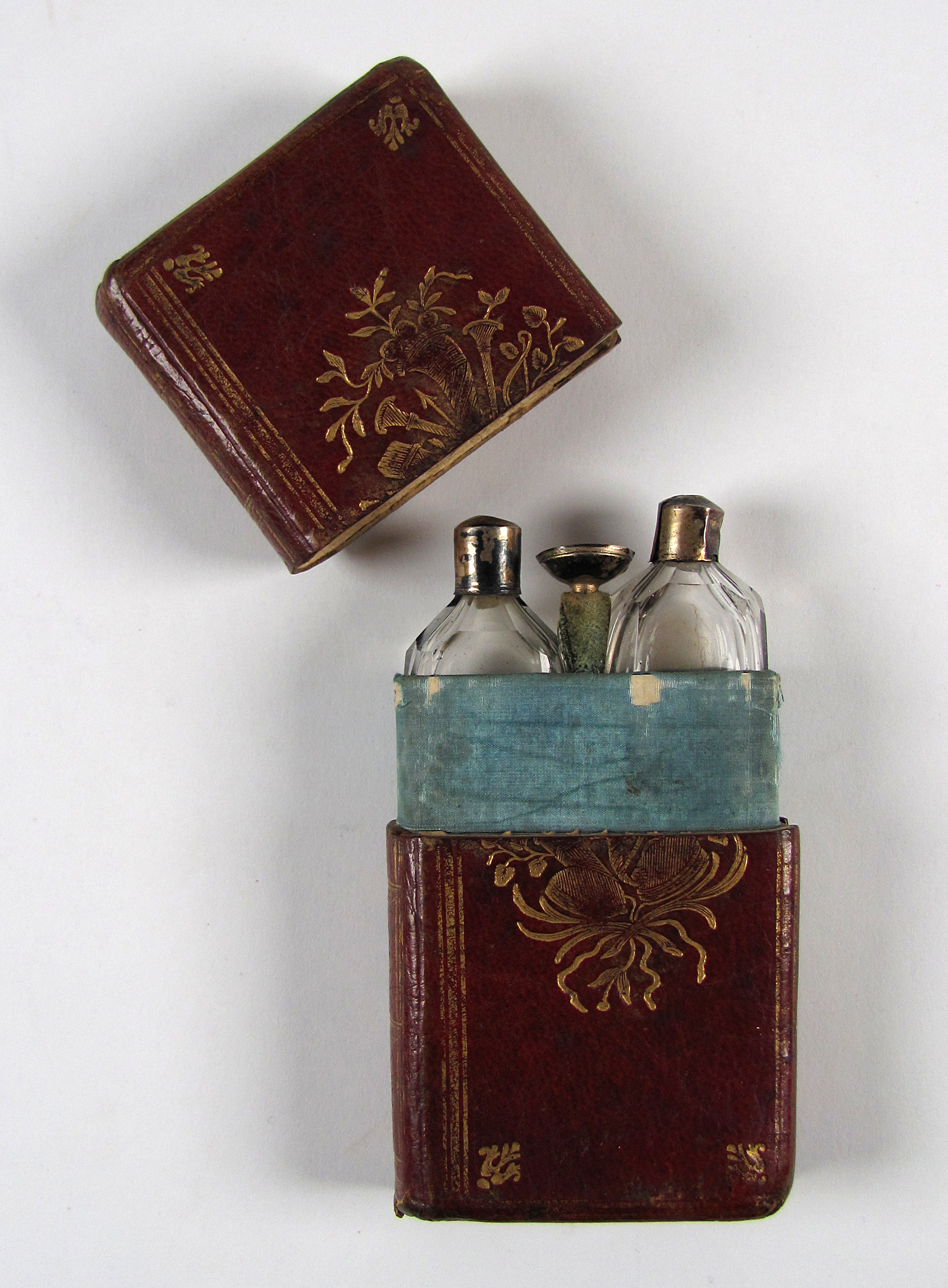 Hübsch gearbeitetes und seltenes Etui für Glasflakons, in denen entweder Parfum oder Riechsalz transportiert und aufbewahrt wurde.– Mit leichten Gebrauchsspuren, und von guter Gesamterhaltung. Ein Glasstöpsel beschädigt und nicht mehr abnehmbar.