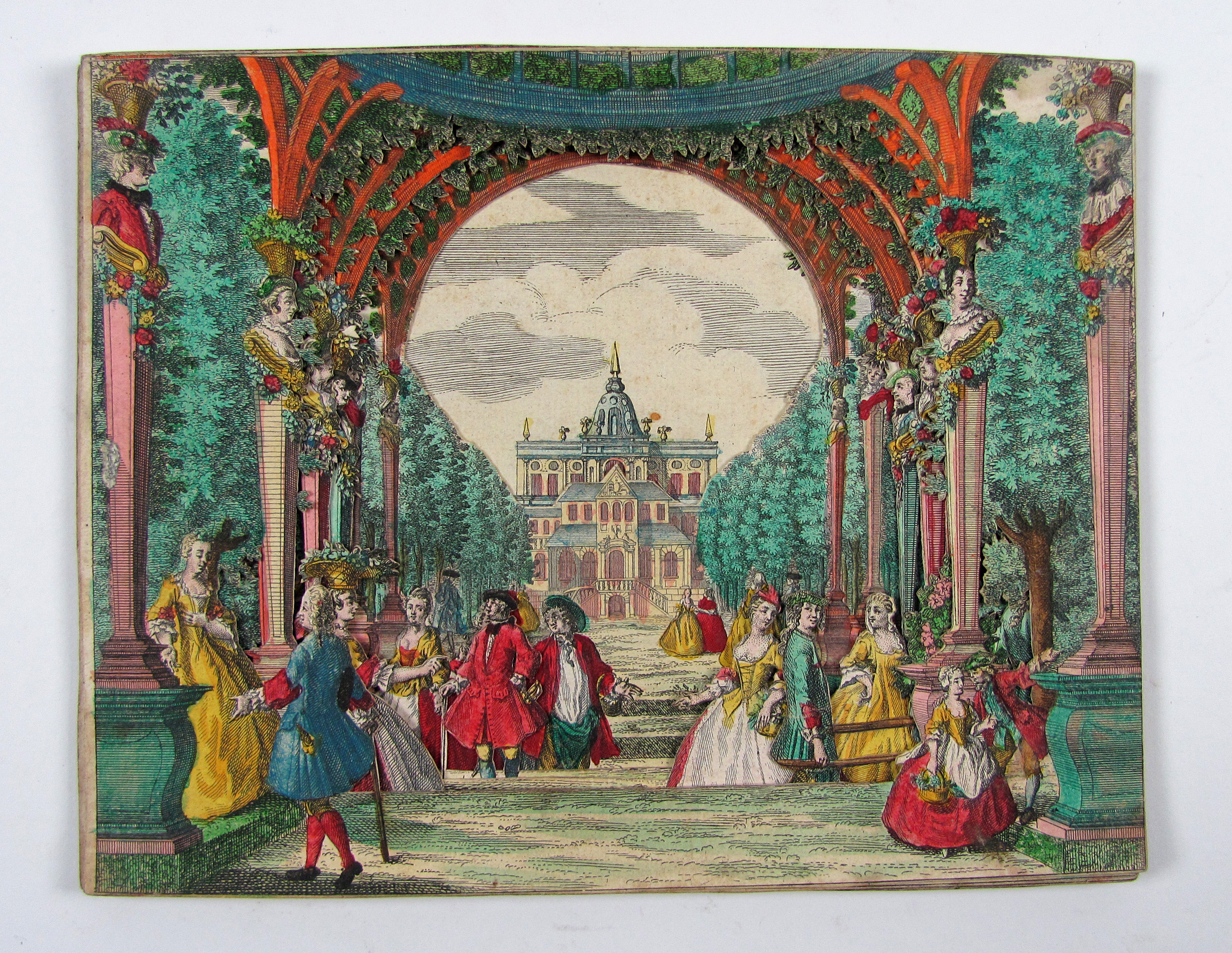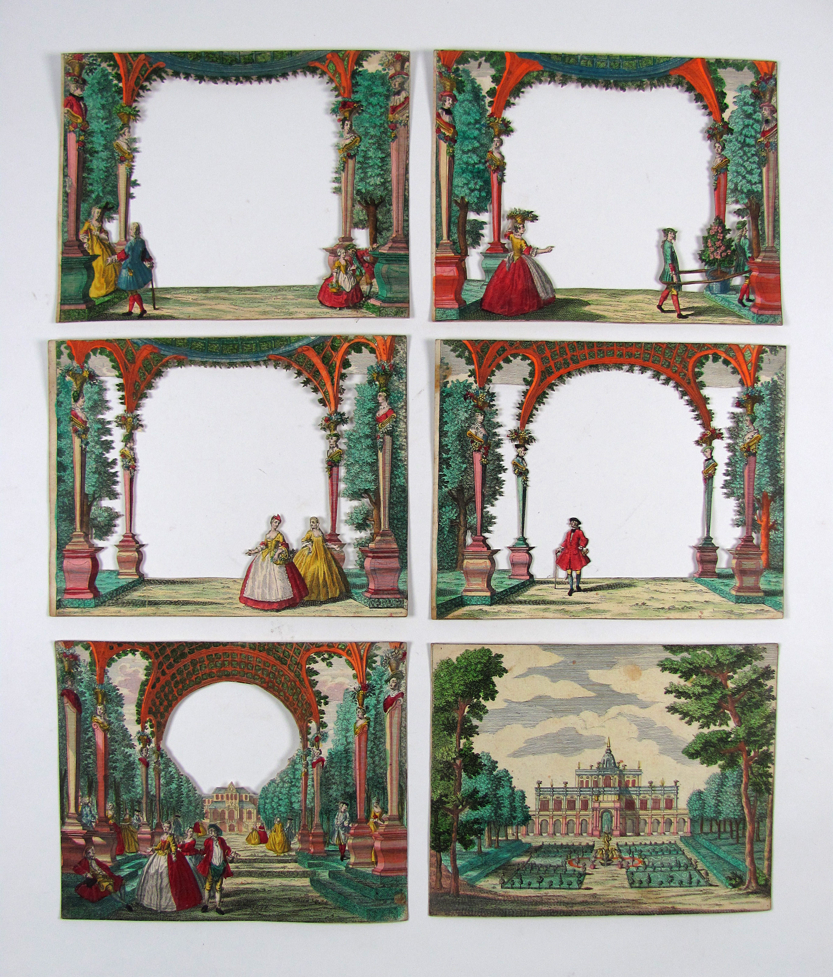 Die hübschen Kupferstichserien waren für eine räumlich gestaffelte Aufstellung mit oder ohne Guckkasten vorgesehen. Dazu wurden sie noch vor dem Verkauf auf einen Karton montiert, sehr sorgfältig ausgeschnitten und koloriert. Das Resultat sind zauberhafte, dreidimensionale Szenerien, die mit vielen Details das alltägliche Leben, die vornehme Gesellschaft, fremde Länder, Kuriositäten oder Bibelgeschichten darstellen. Gestochen wurden die Blätter von Martin Engelbrecht nach den Zeichnungen von Jeremias Wachsmuth (1711-71) und Johann David Nesselthaler (1717-66). Naturgemäß sind die fragilen Papierkunstwerke oft beschädigt oder unvollständig, gute Exemplare sind deshalb selten und gesucht. Es gab drei verschiedene Formate, hier vorliegend das größte.– Hübsches und tadellos erhaltenes Diorama. Milano Nr. 8 und Abb. S. 41 (inkomplette Serie).– Vgl. Schott, Engelbrecht, S. 145 f. Füsslin u.a, Der Guckkasten S. 46 f. Ganz, Die Welt im Kasten, S. 53 f. Slg. Nekes 84 ff.