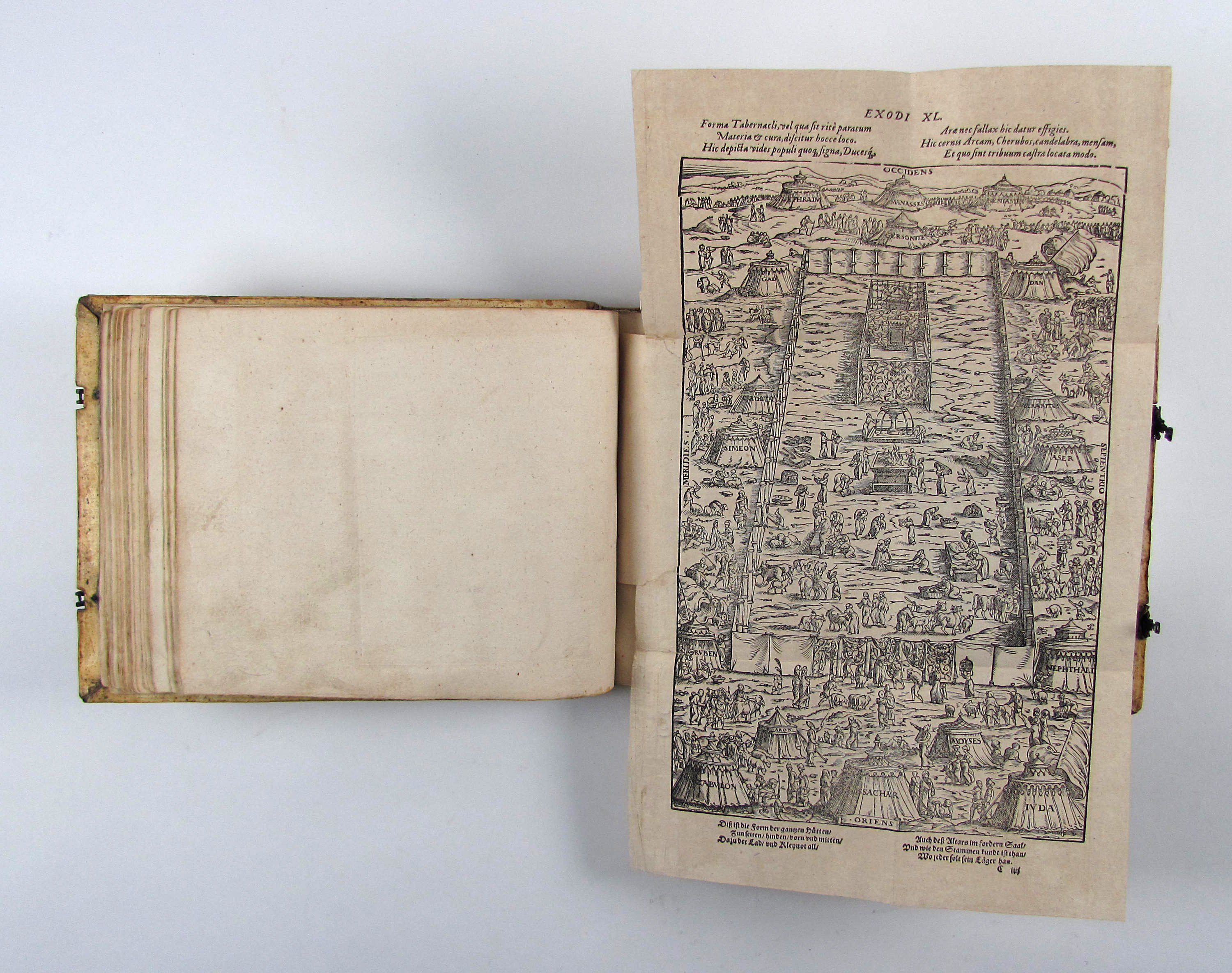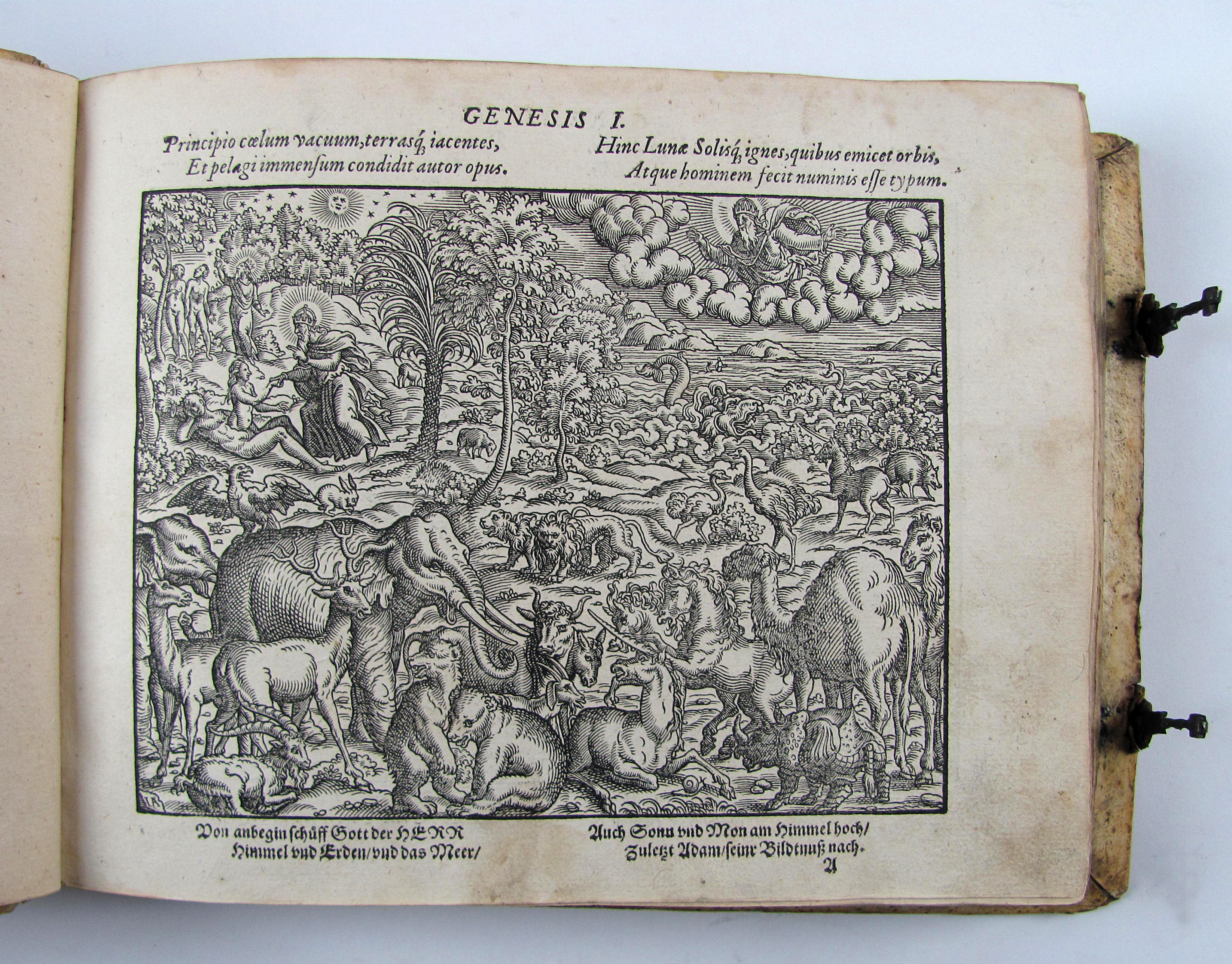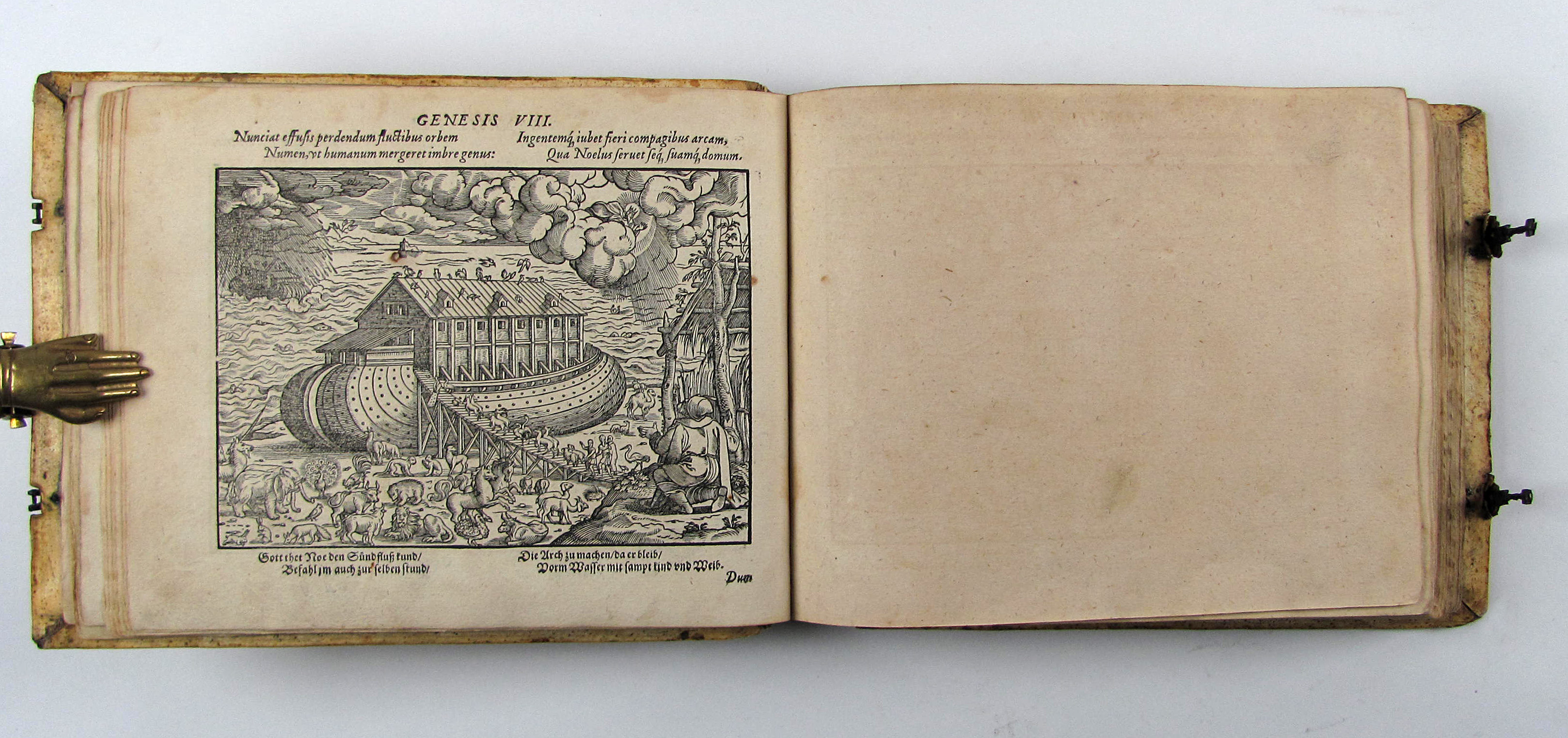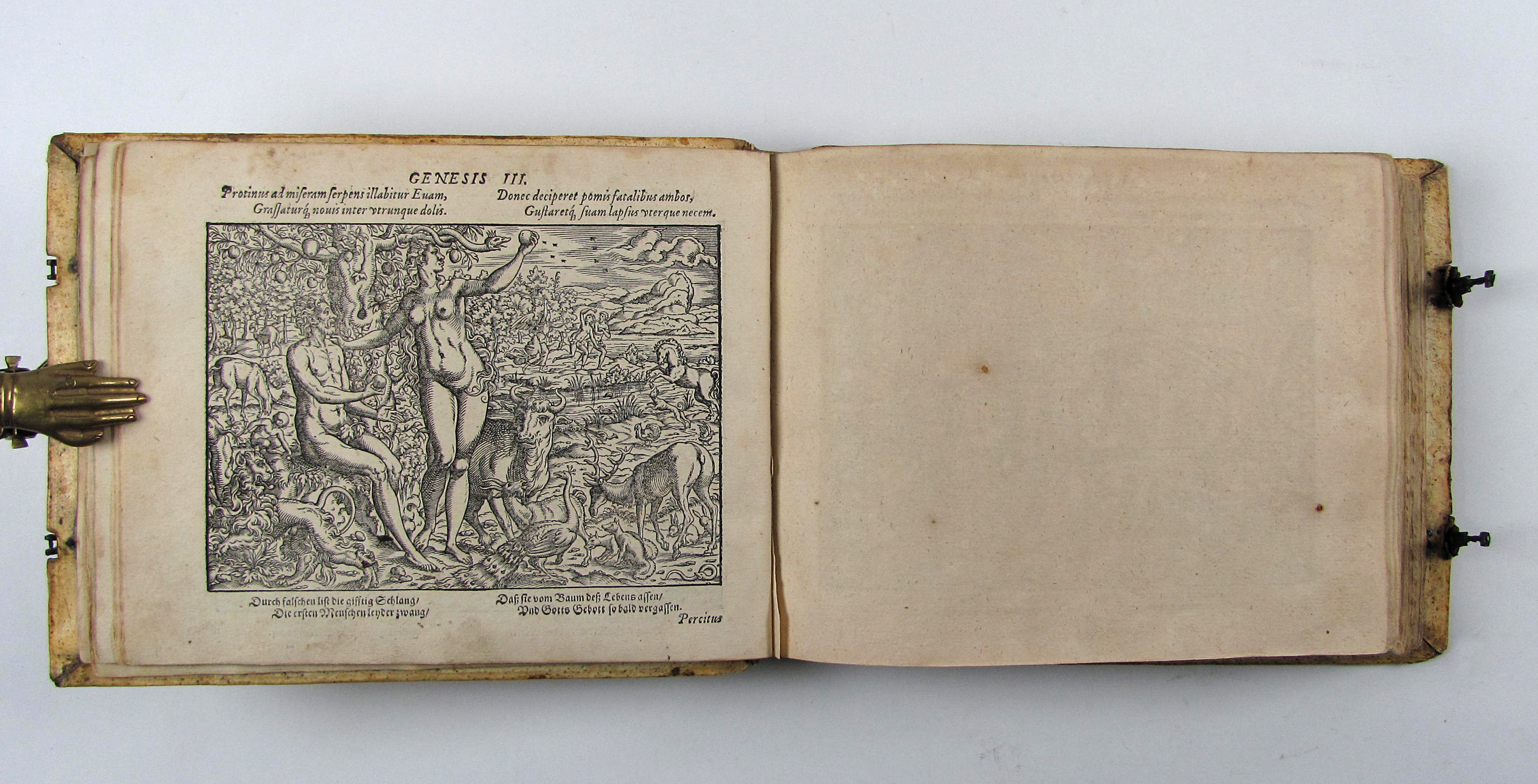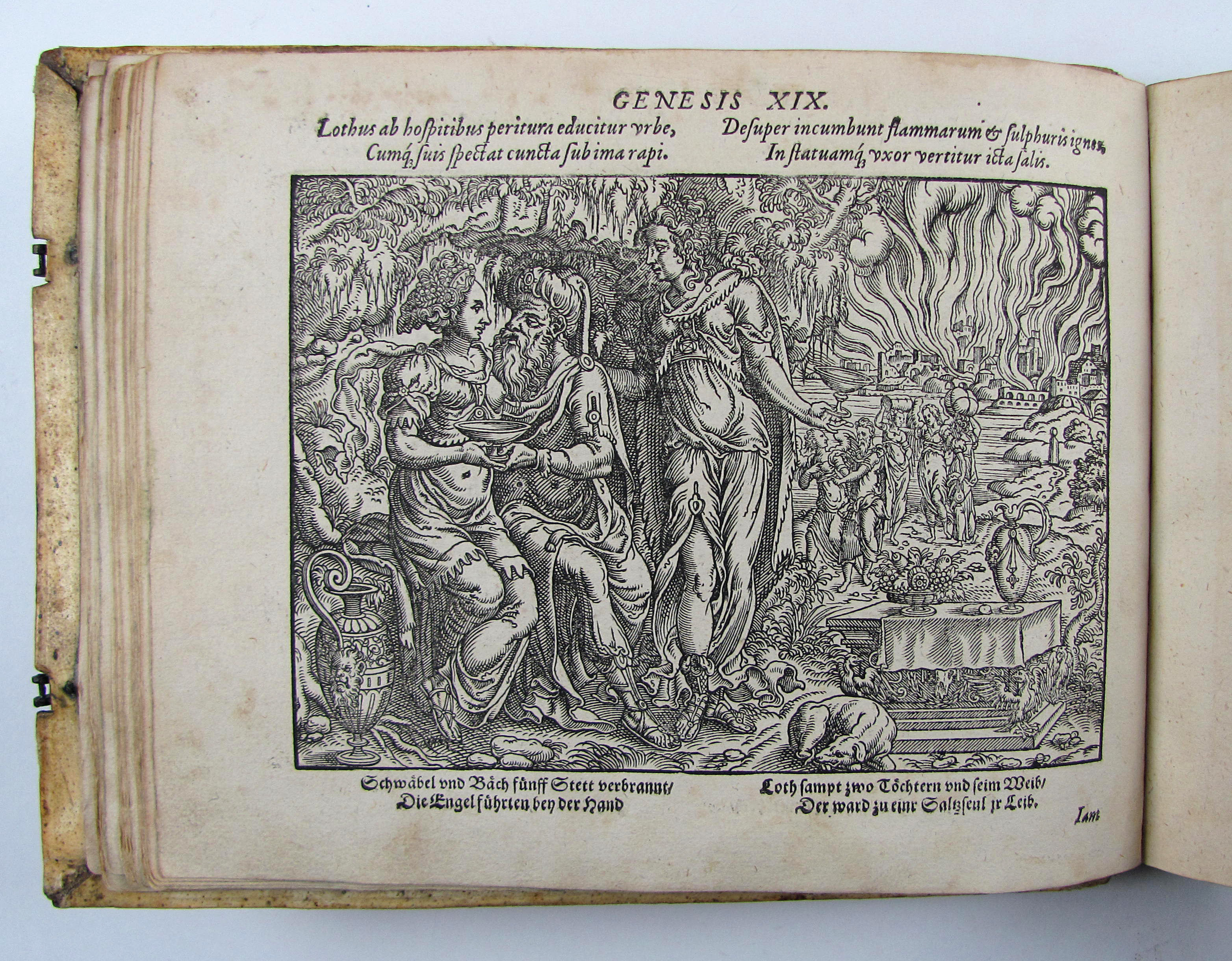 Besonders schönes Exemplar des attraktiven Holzschnittwerks im attraktiven, ersten Einband. Diese schönen, recht großformatigen und künstlerisch bedeutenden Bibelillustrationen erschienen zuerst ein Jahr vorher in der Bibel derselben Verleger. Hier liegt die zweite Separatausgabe ohne Text vor, die erste erschien noch im Jahr des Erstdrucks.– Durch die vielen mitgebundenen leeren Blätter (″durchschossenes Exemplar) erhielt das Buch erst einen Umfang, der diese Art von Einband rechtfertigte und ermöglichte. In einem ebenfalls durchschossenen Exemplar der Anna Amalia Bibliothek dienten die leeren Blätter Platz für Stammbucheinträge. Vergleichsexemplaren fehlen oft die seltenen Falttafeln, so z.B. dem obigen Exemplar die zweite Falttafel, dem Exemplar der Stabi Bamberg der untere Teil der ersten Falttafelhin und wieder noch die seltenen Falttafeln.– Der Einband wurde von Thomas Krüger in Wittenberg gefertigt. Auf dem Vorderdeckel neben Datierung und Monogrammstempeln zwei Platten mit Doppelbild (Sündenfall, Geburt Christi, Kreuzigung und Auferstehung, Haebler I, 250, XXXI) auf dem Hinterdeckel Justizia und Fortuna, beide monogrammiert „T.K.“ (Haebler I, 251, XII und I, 250, XI).– Titel mit kleinem Stempel und Braunfleck, verso mit Exlibris des 18. Jhdts., Blatt A2 mit kleinem Rostloch, die Falttafeln mit Hinterlegungen von Einrissen, ein leeres Blatt mit hs. Eintrag von 1596, geringfügig gebräunt oder fleckig, ansonsten sehr gut erhalten.–