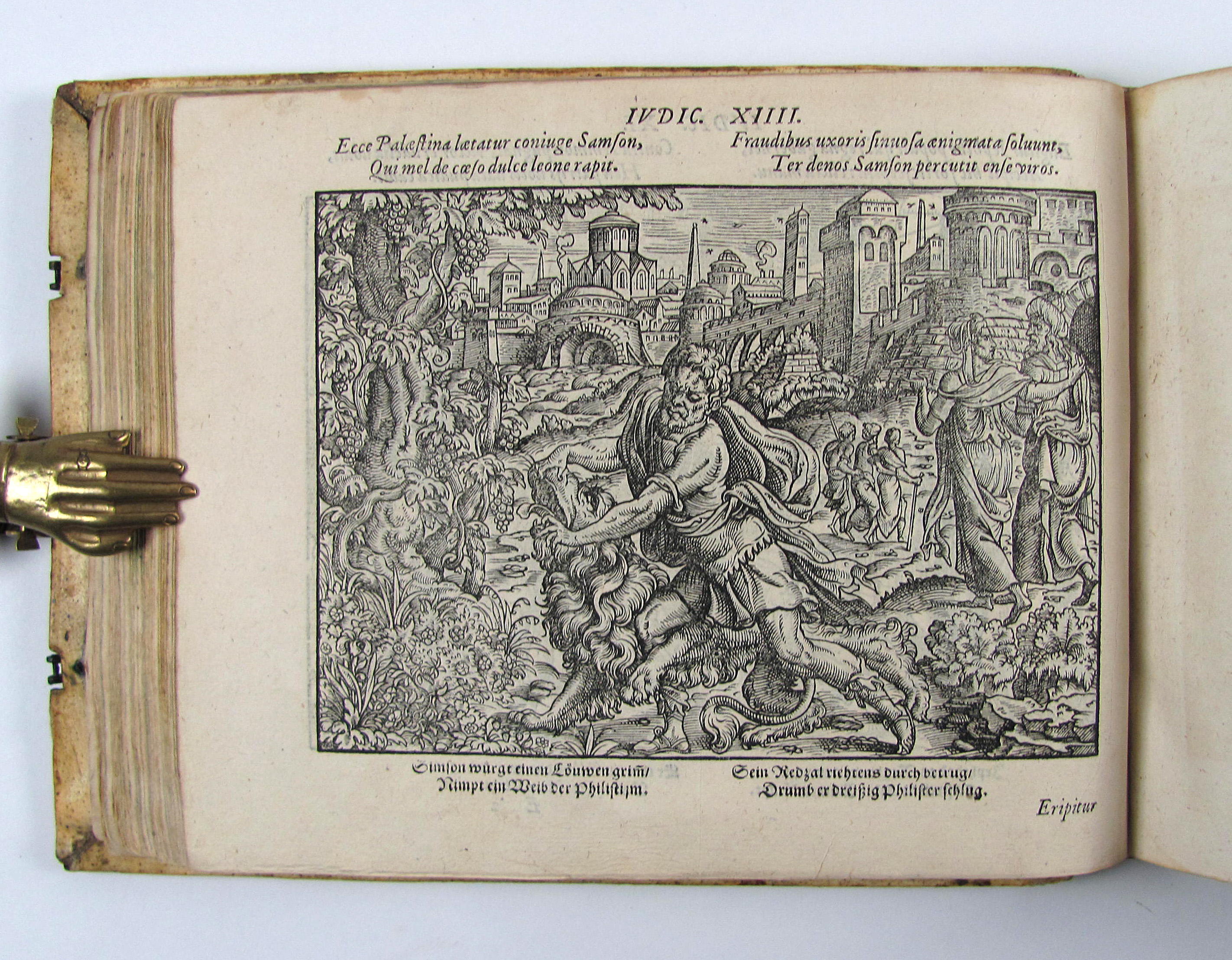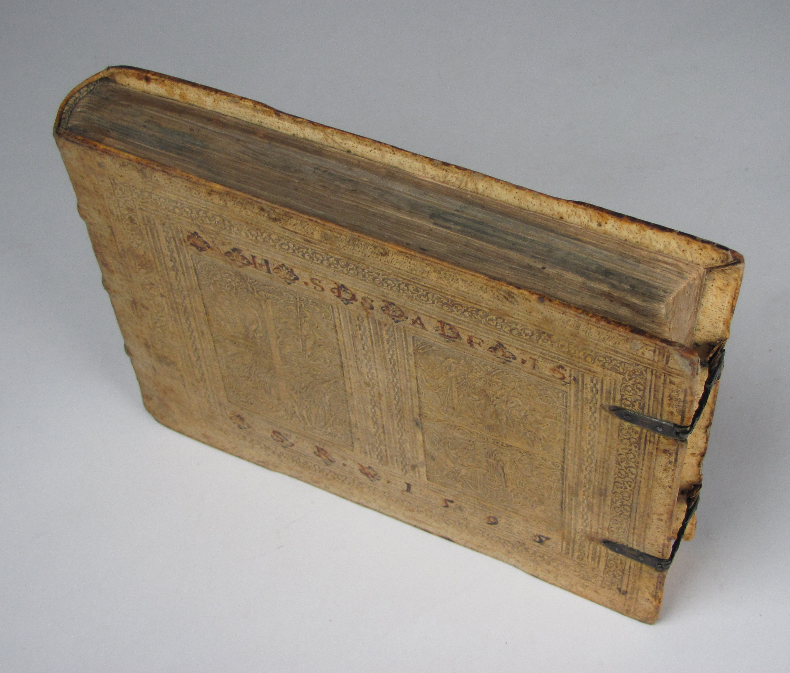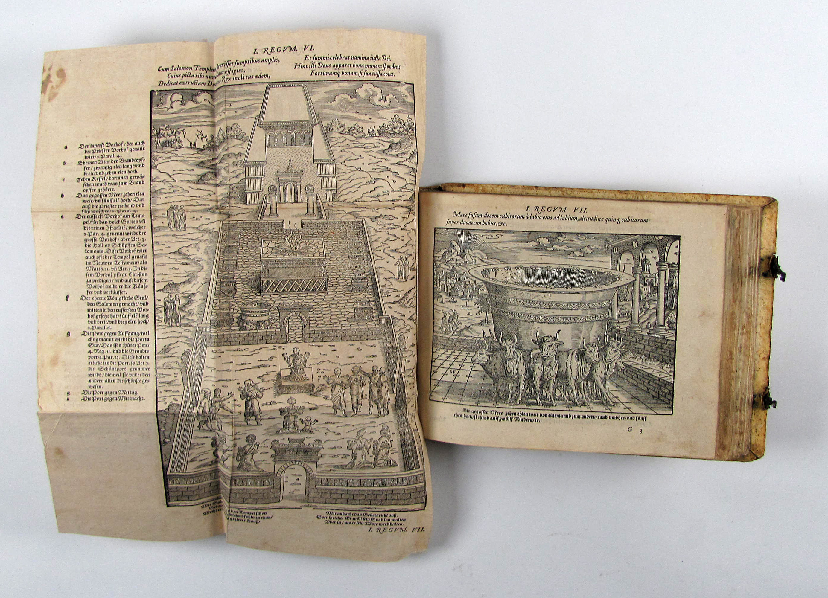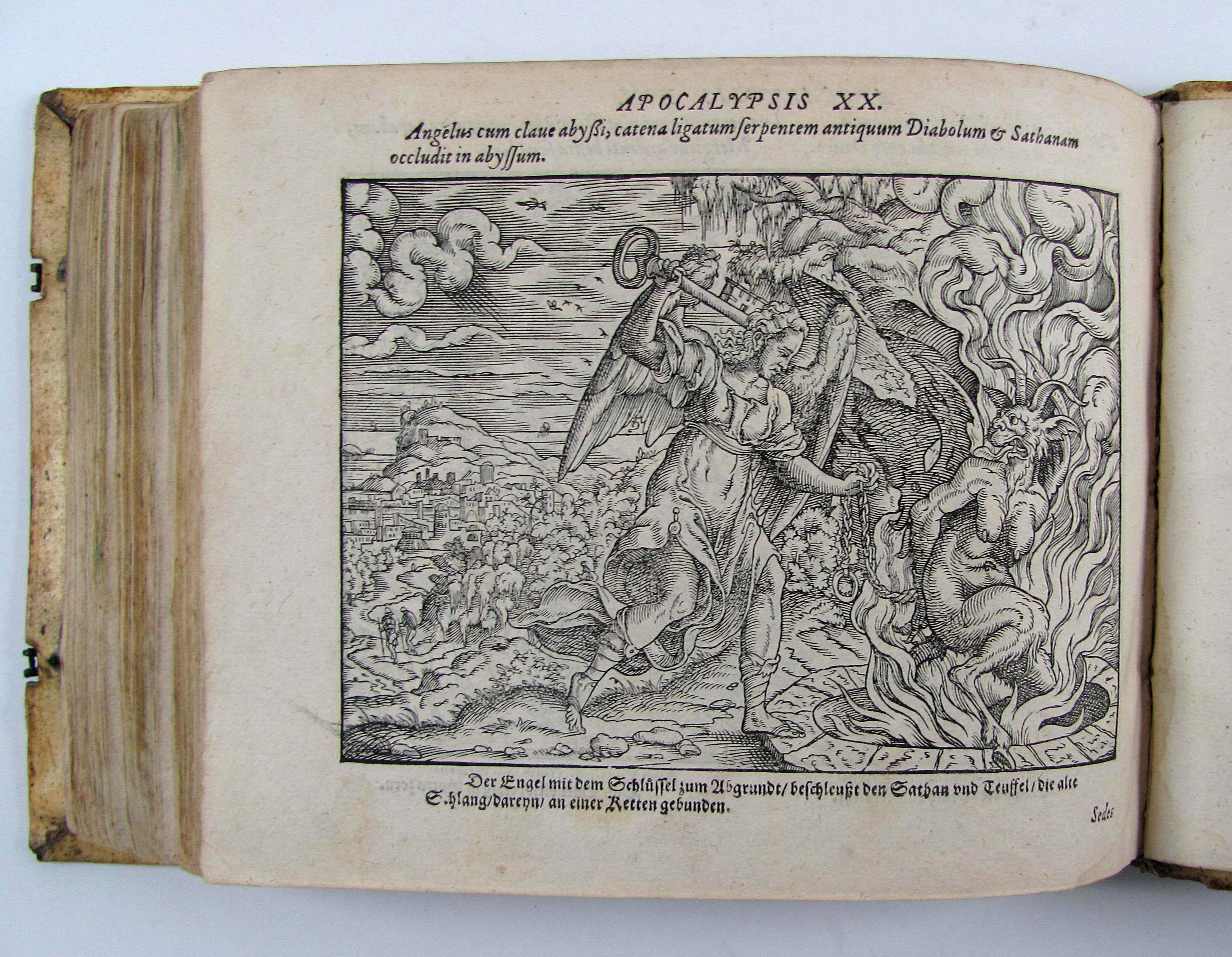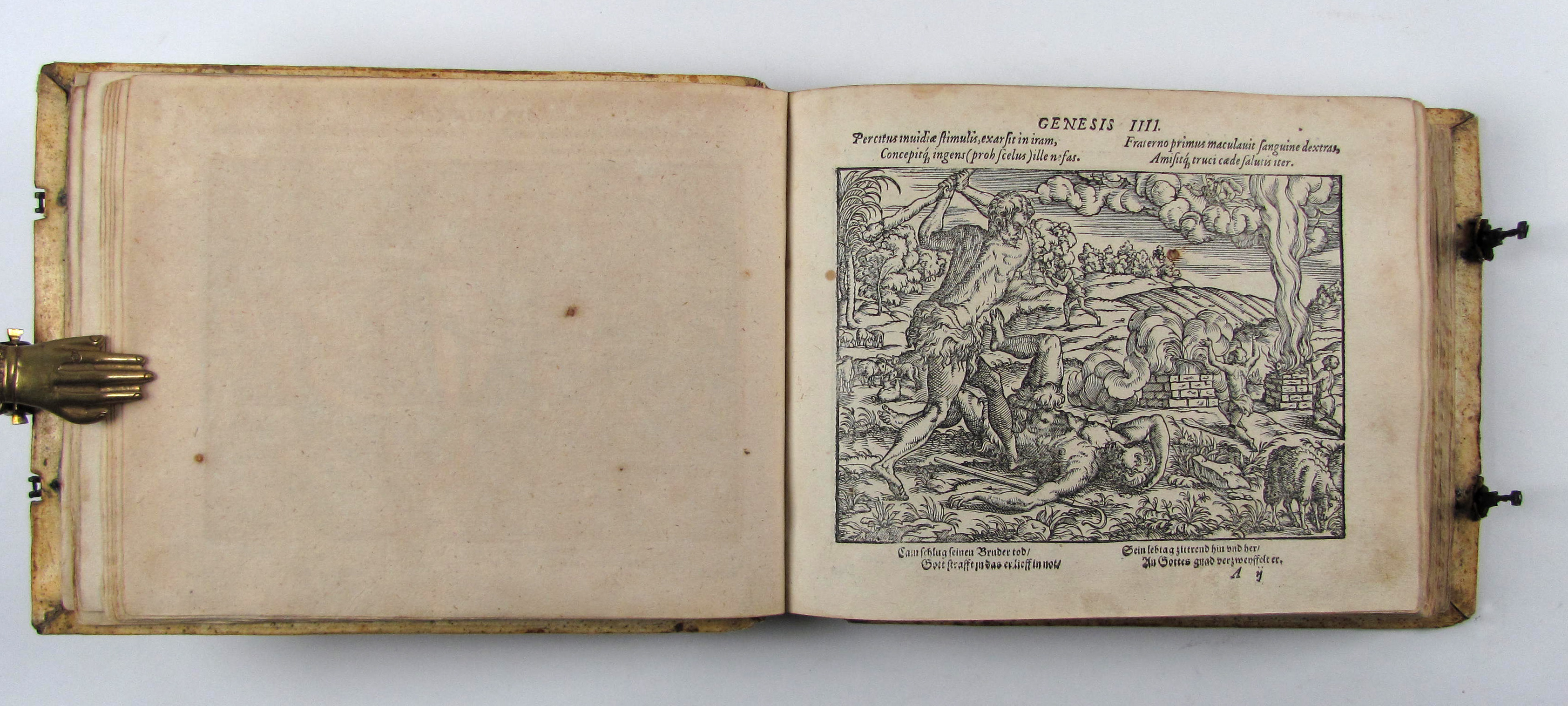 Besonders schönes Exemplar des attraktiven Holzschnittwerks im attraktiven, ersten Einband. Diese schönen, recht großformatigen und künstlerisch bedeutenden Bibelillustrationen erschienen zuerst ein Jahr vorher in der Bibel derselben Verleger. Hier liegt die zweite Separatausgabe ohne Text vor, die erste erschien noch im Jahr des Erstdrucks.– Durch die vielen mitgebundenen leeren Blätter (″durchschossenes Exemplar) erhielt das Buch erst einen Umfang, der diese Art von Einband rechtfertigte und ermöglichte. In einem ebenfalls durchschossenen Exemplar der Anna Amalia Bibliothek dienten die leeren Blätter Platz für Stammbucheinträge. Vergleichsexemplaren fehlen oft die seltenen Falttafeln, so z.B. dem obigen Exemplar die zweite Falttafel, dem Exemplar der Stabi Bamberg der untere Teil der ersten Falttafelhin und wieder noch die seltenen Falttafeln.– Der Einband wurde von Thomas Krüger in Wittenberg gefertigt. Auf dem Vorderdeckel neben Datierung und Monogrammstempeln zwei Platten mit Doppelbild (Sündenfall, Geburt Christi, Kreuzigung und Auferstehung, Haebler I, 250, XXXI) auf dem Hinterdeckel Justizia und Fortuna, beide monogrammiert „T.K.“ (Haebler I, 251, XII und I, 250, XI).– Titel mit kleinem Stempel und Braunfleck, verso mit Exlibris des 18. Jhdts., Blatt A2 mit kleinem Rostloch, die Falttafeln mit Hinterlegungen von Einrissen, ein leeres Blatt mit hs. Eintrag von 1596, geringfügig gebräunt oder fleckig, ansonsten sehr gut erhalten.–