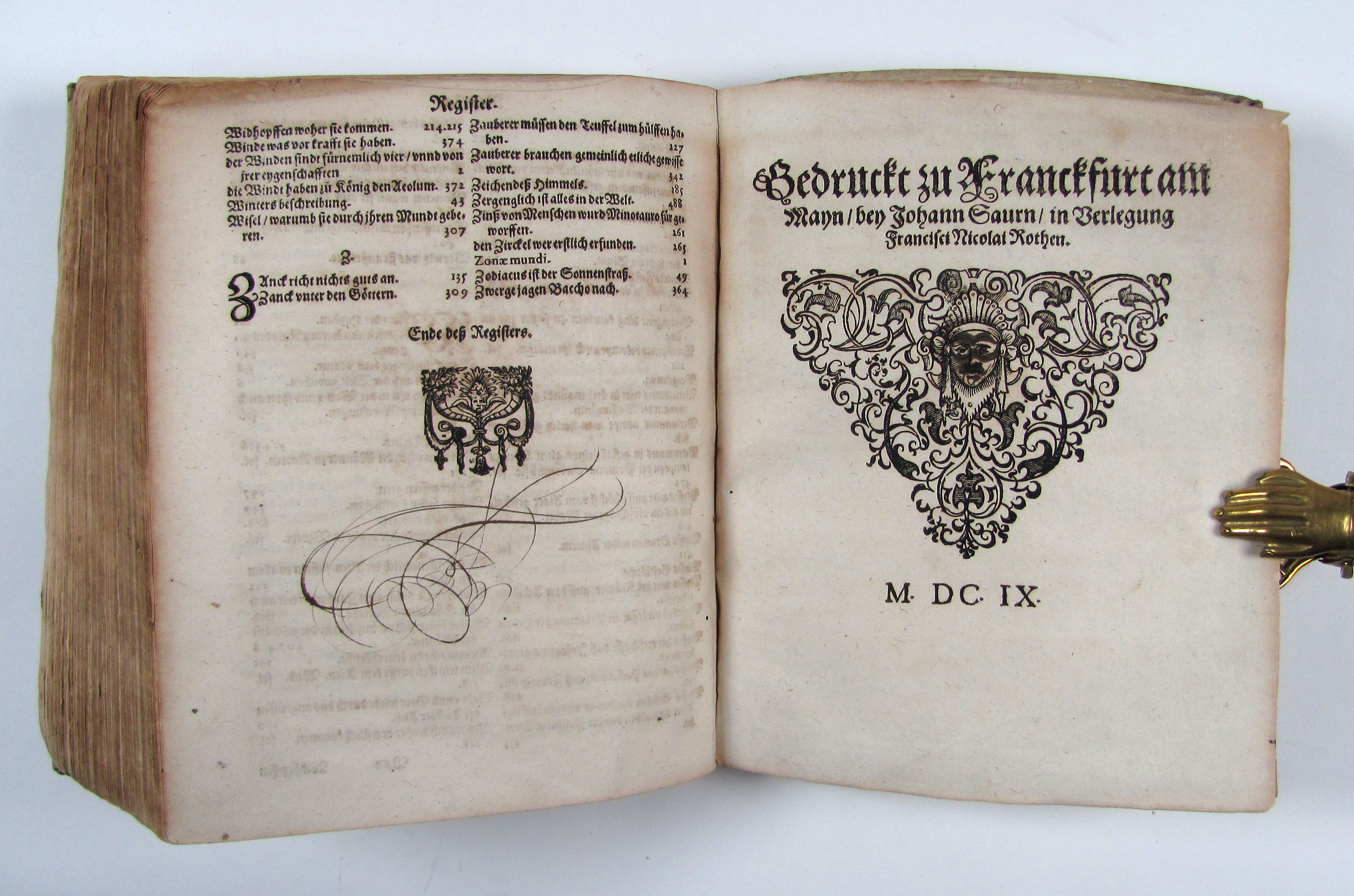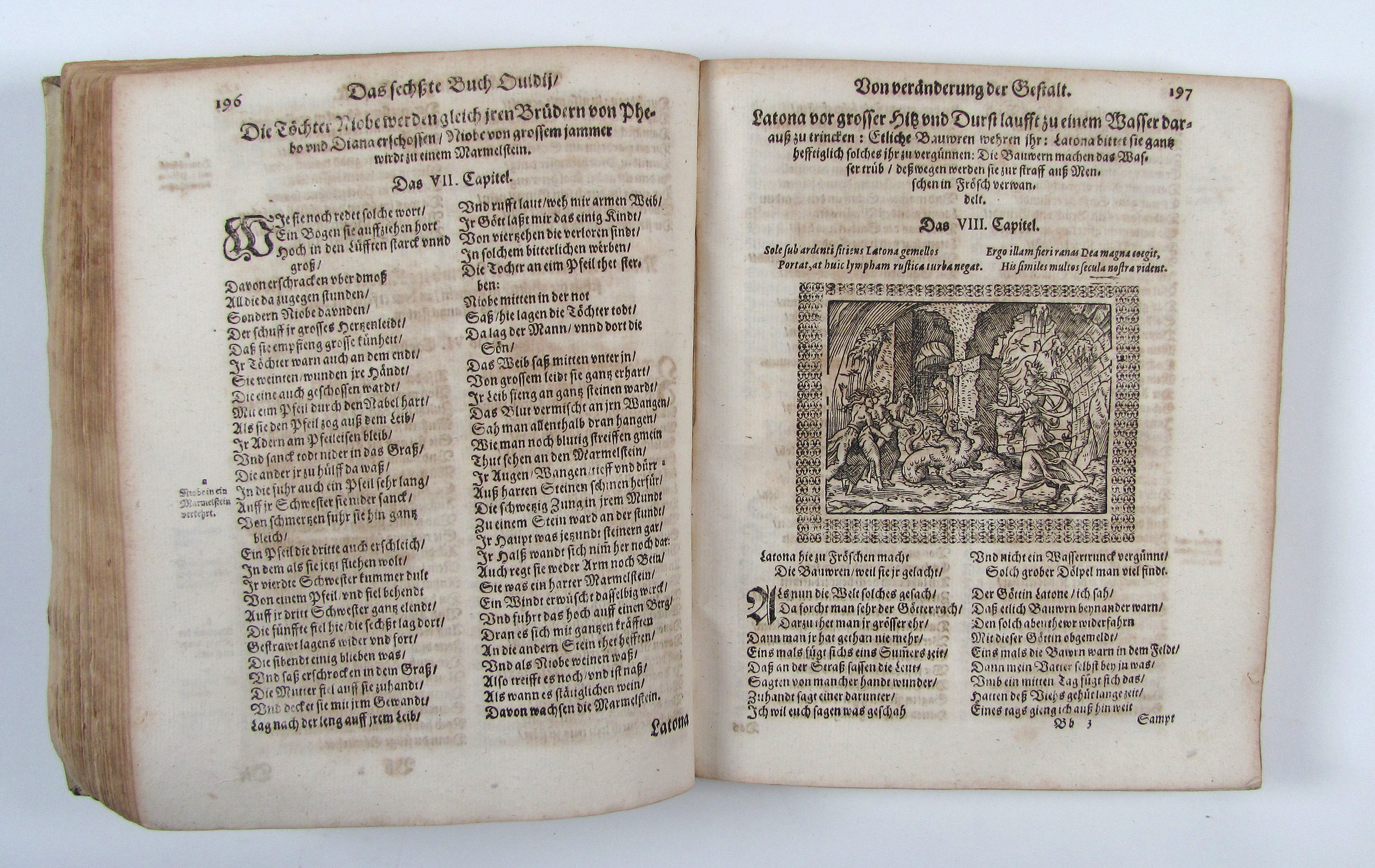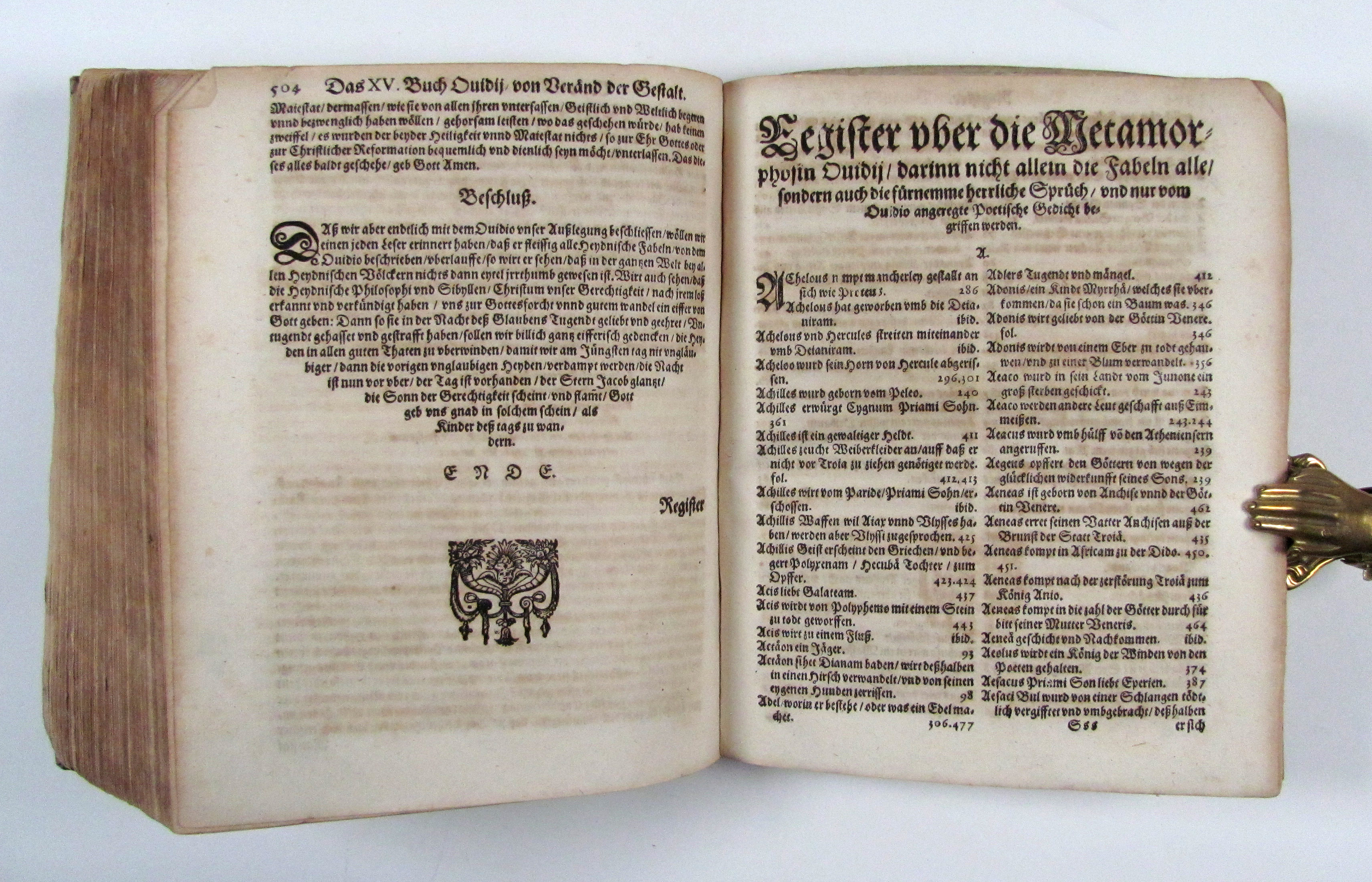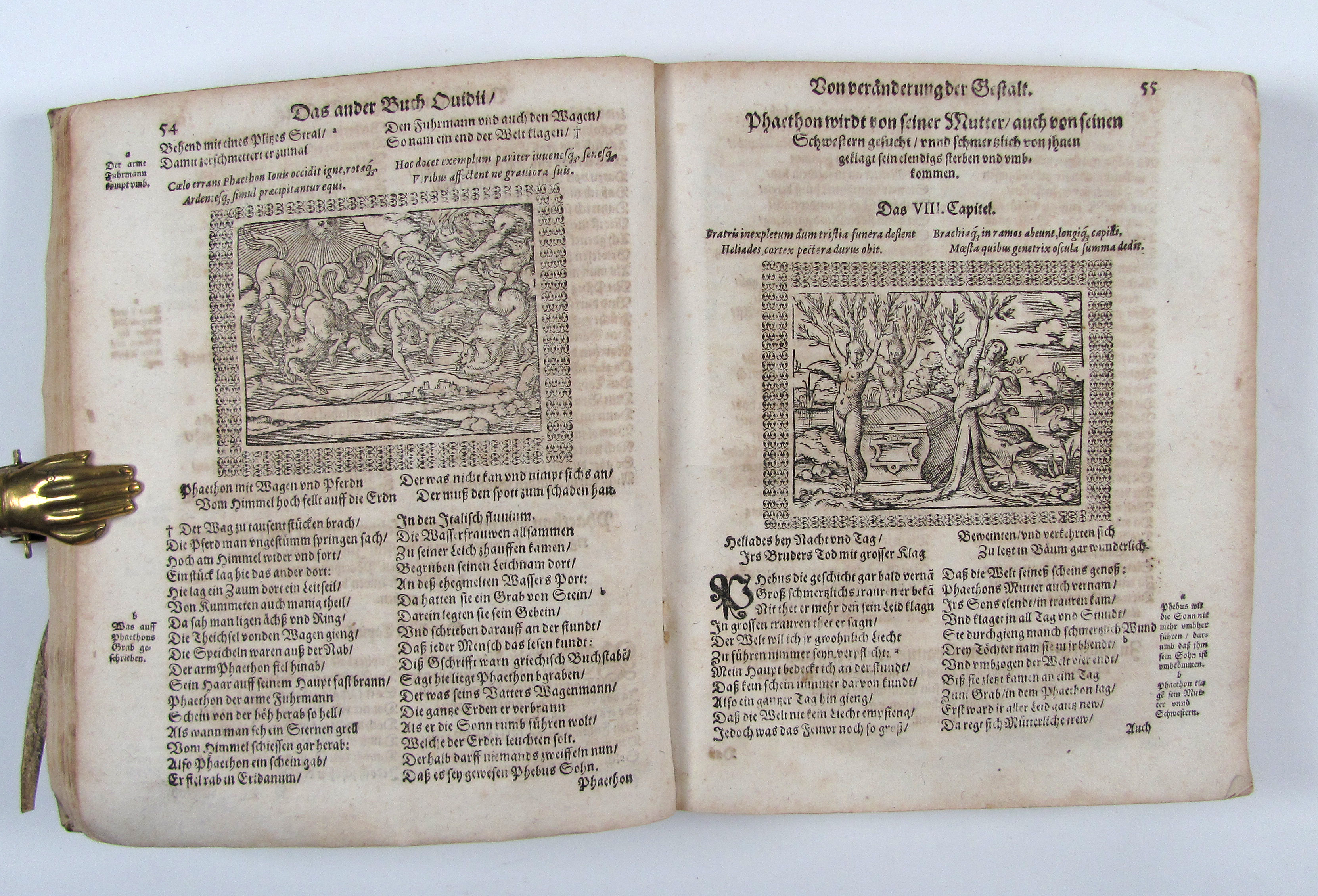 Deutsche Bearbeitung von Jörg Wickram nach einer mittelalterlichen Übersetzung von Albrecht von Halberstadt, herausgegeben von Lorich.– Nach Goedeke die 5. Ausgabe.– Die Holzschnitte meist in guten Abzügen, Titelblatt ausgeschnitten und aufgezogen, mit Stempeln und hs. Besitzvermerken, leicht gebräunt.– Goed. II, 462, 7e. Jantz 273.
