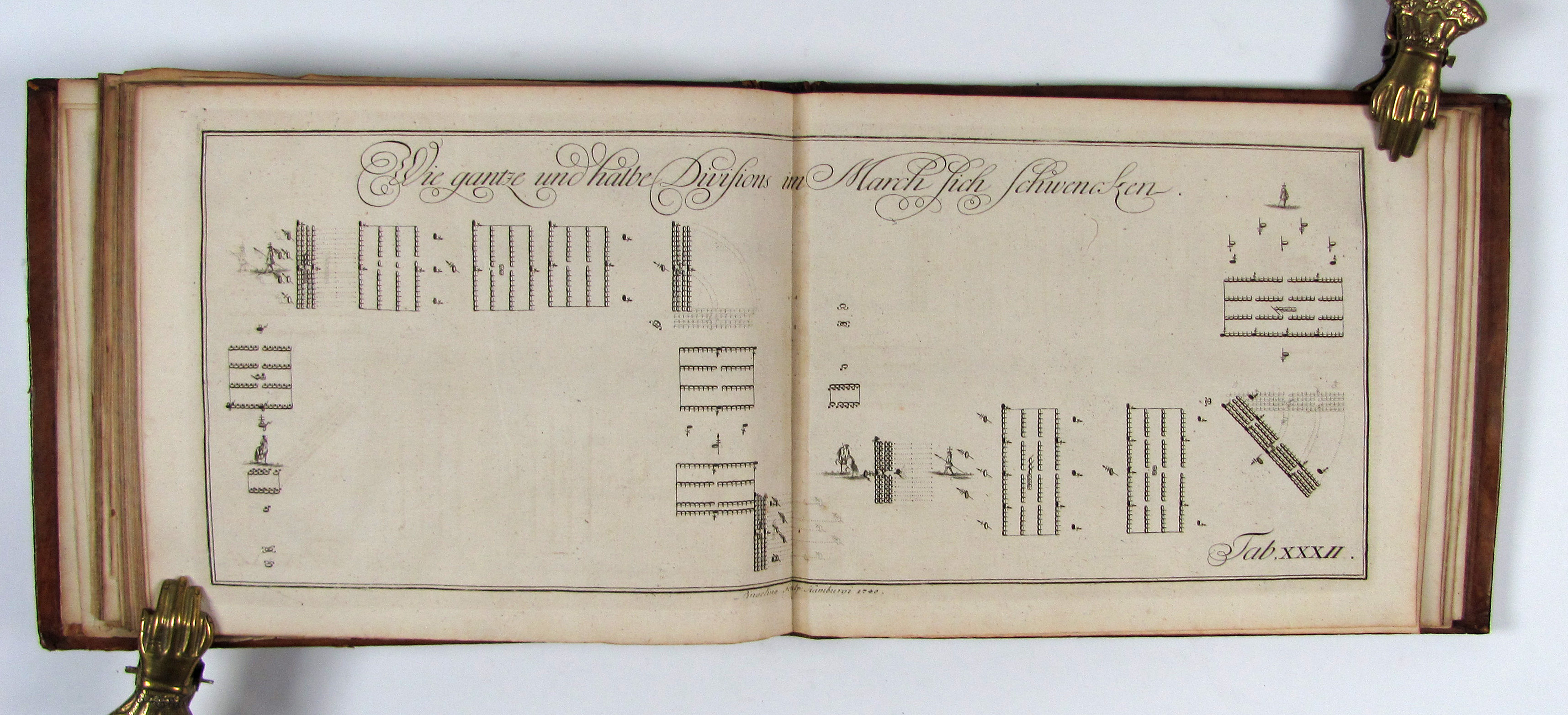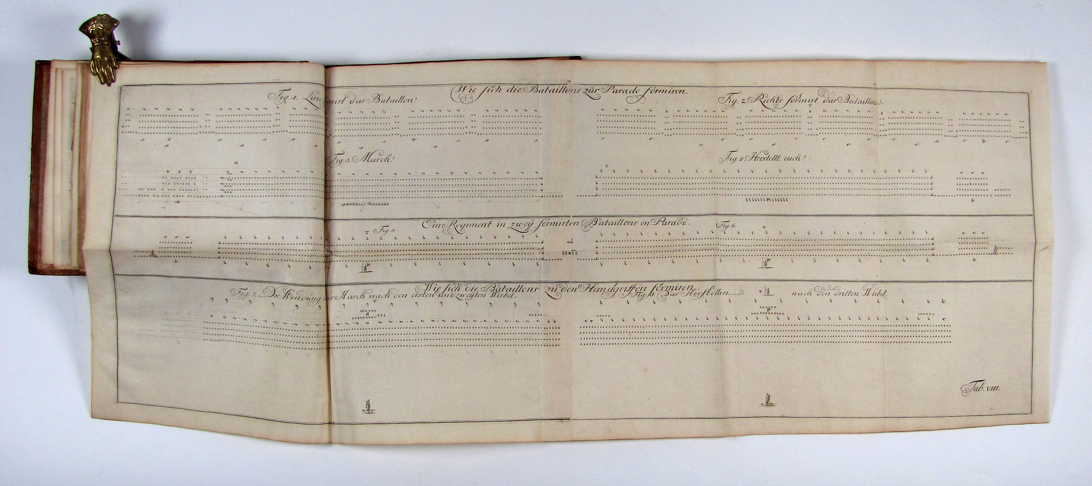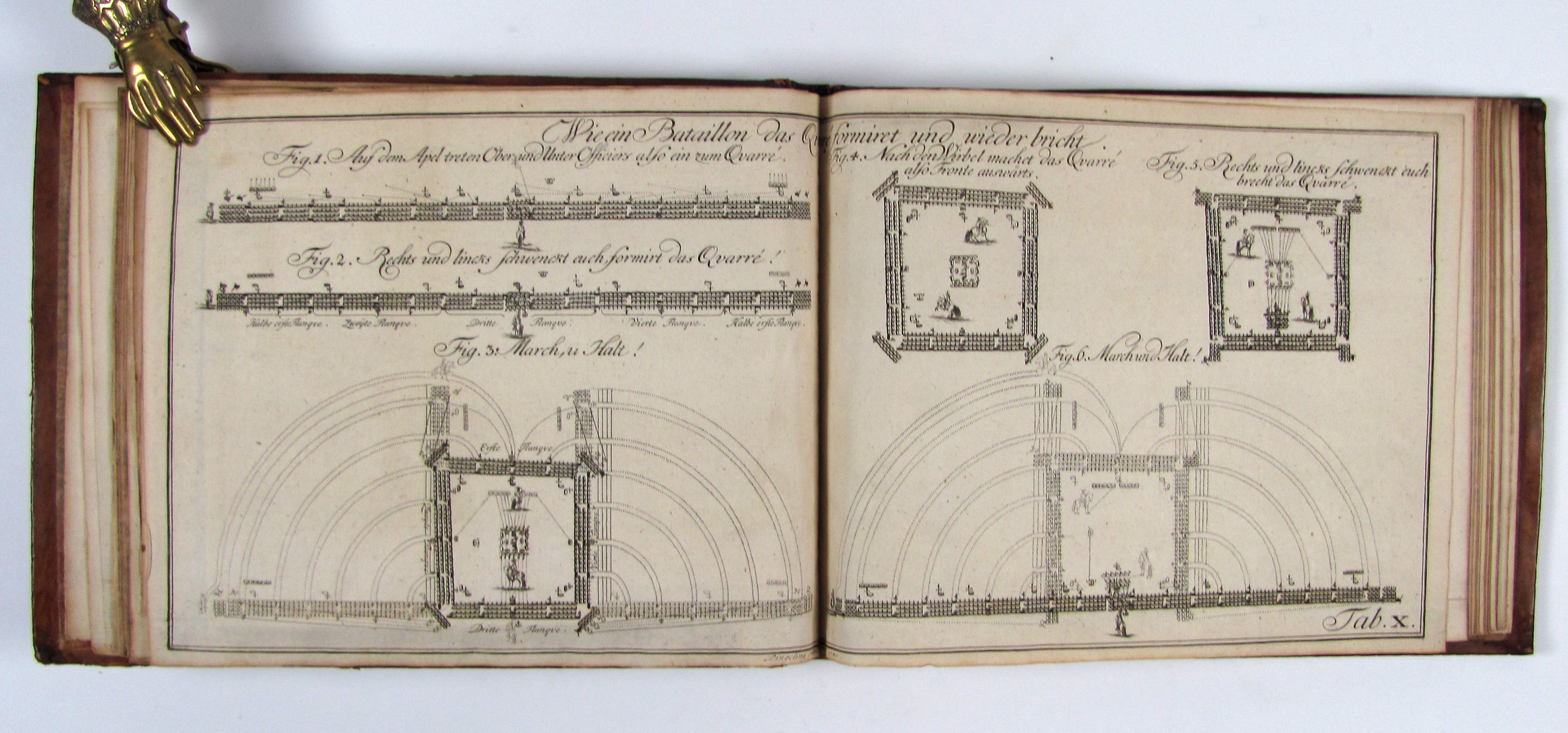 Die Tafeln (davon zwei mehrf. gefalt.) zeigen präzise, schematische Darstellungen der Truppenanordnungen nach den Exerzierreglementen für die dänische (also auch holsteinische) Infanterie. Diese erschienen in Kopenhagen 1704, Glückstadt, 1729 und Oldenburg, 1739.– Vgl. Jähns II, 1679.