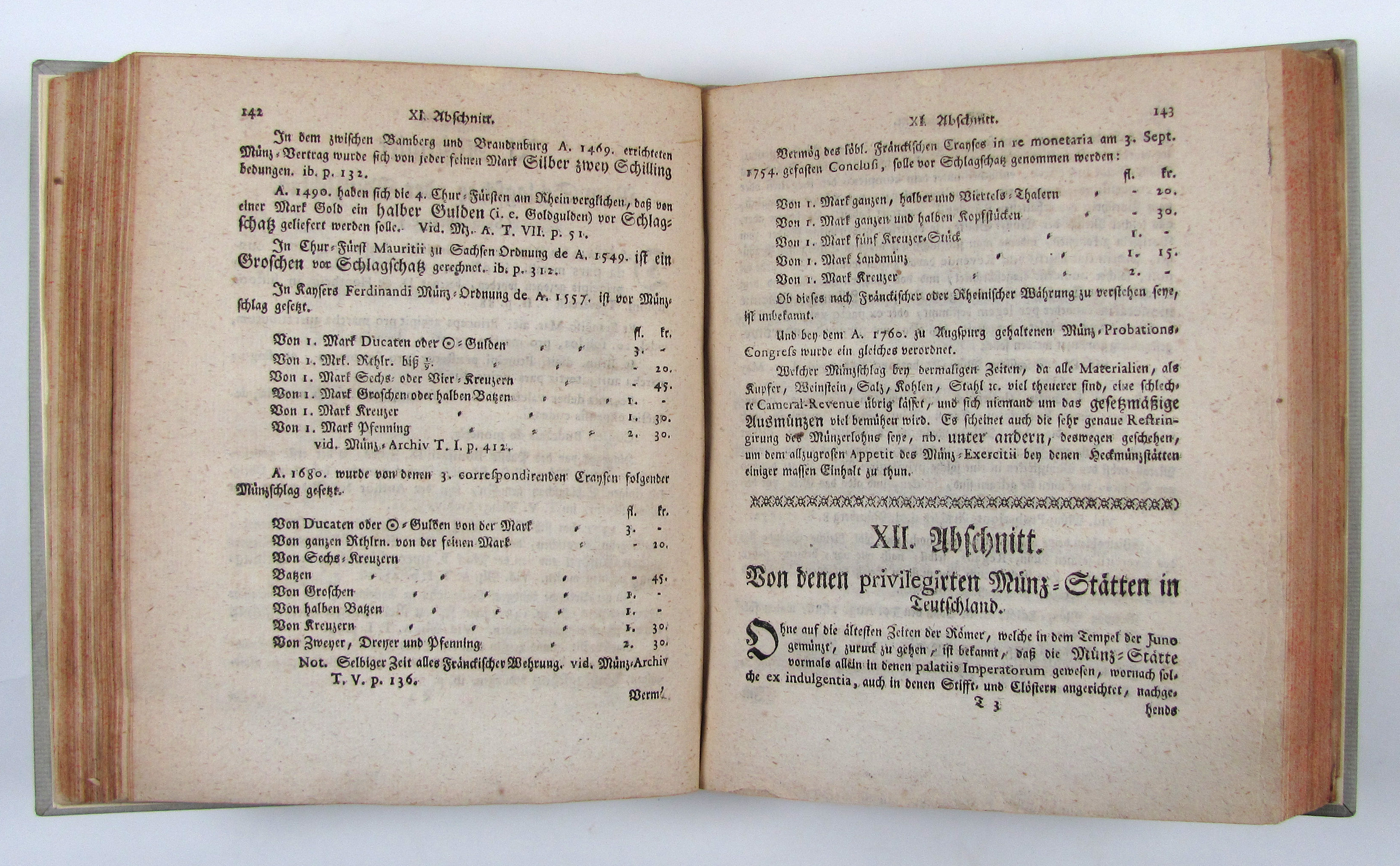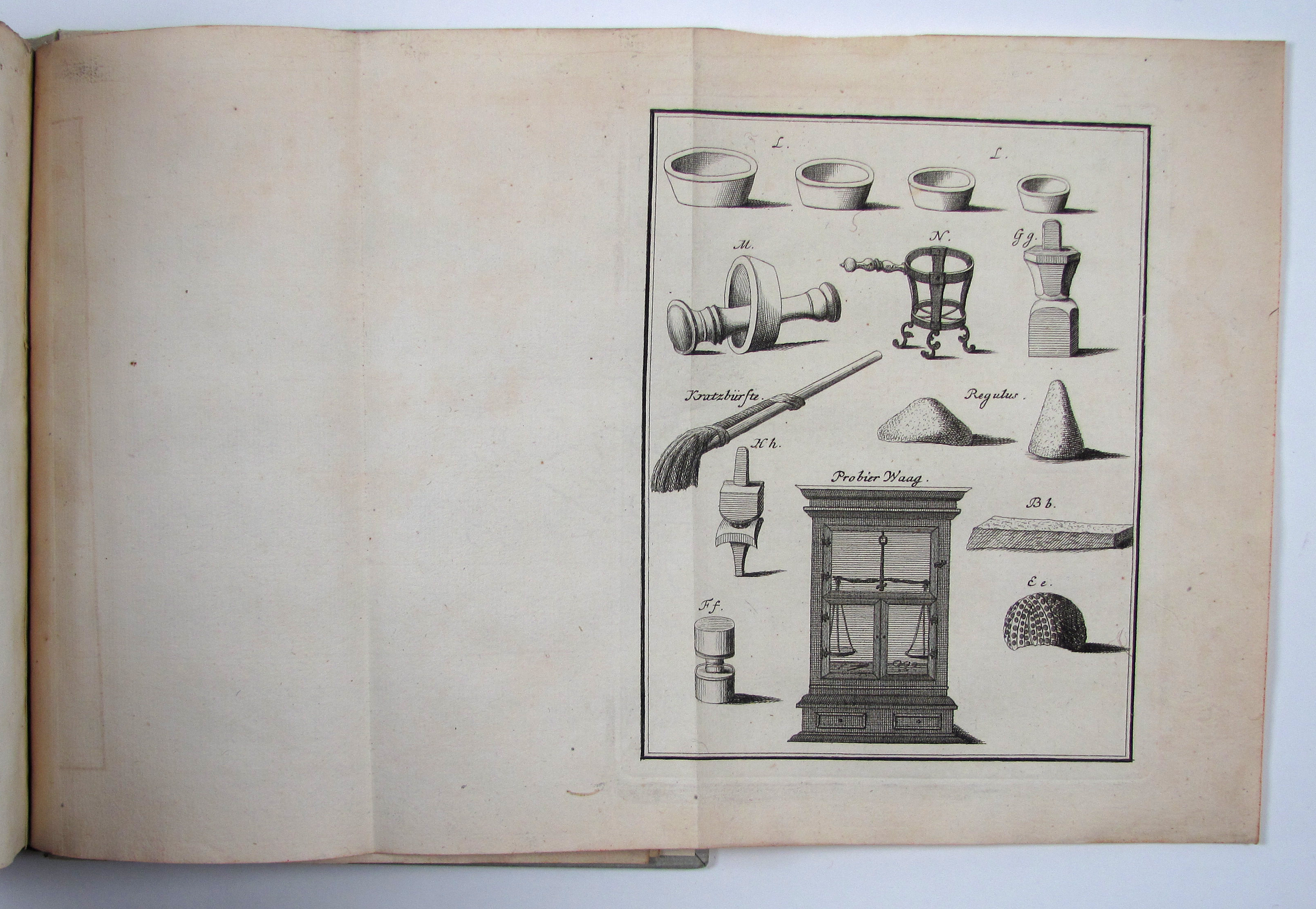 BEIGEBUNDEN: DERS., Tariffa über den feinen Gehalt das Goldes und Silbers, nach Karat und Grän, dann Loth und Grän, von einem halben Grän an, biß auf 24 Karat oder 16 Loth innerlicher Qualitaet und von 1 Pfenning Gewicht, biß auf 500 Mark Gewicht, äusserlicher Quantitaet. (Ebda), 1761. 157 nn. Bll.– Obwohl der zweite Teil vor dem Ersten zum Druck kam, wird er wohl nie separat vertrieben worden sein. Zwar verzeichnet Graesse ihn als eine eigenständige Publikation, aber sowohl die Kustode am Ende des ersten Teils wie auch der Titel sprechen gegen diese Auffassung. Es gibt aber Exemplare ohne den zweiten Teil.– Die Tafeln zeigen Schmelzöfen, Prägen u.a. Stellenw. etw. gebräunt, 2 Tafeln mit Läsuren im weißen Rand. Lipsius-L. 187. Graesse III, 285. Holzmann-B. II, 5612.