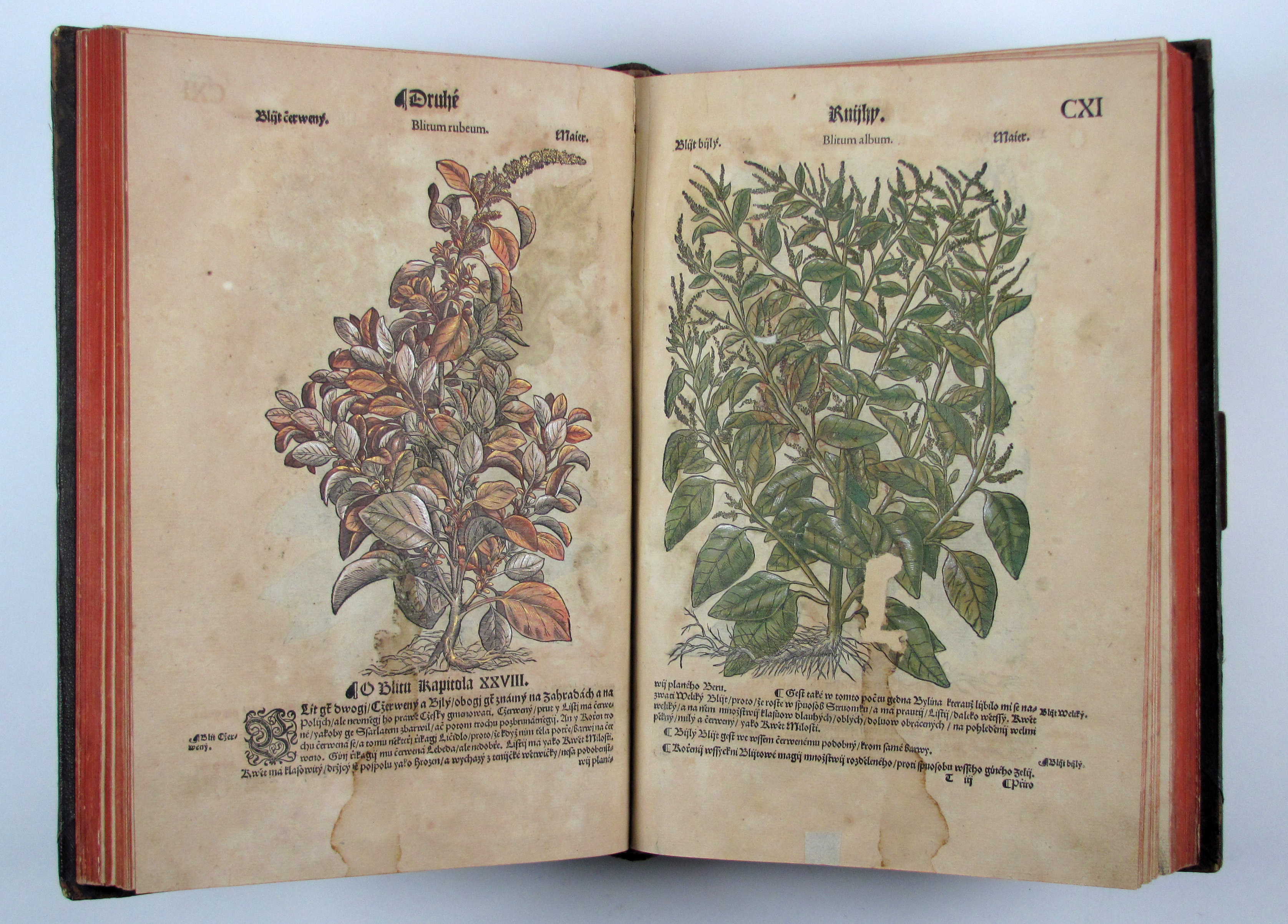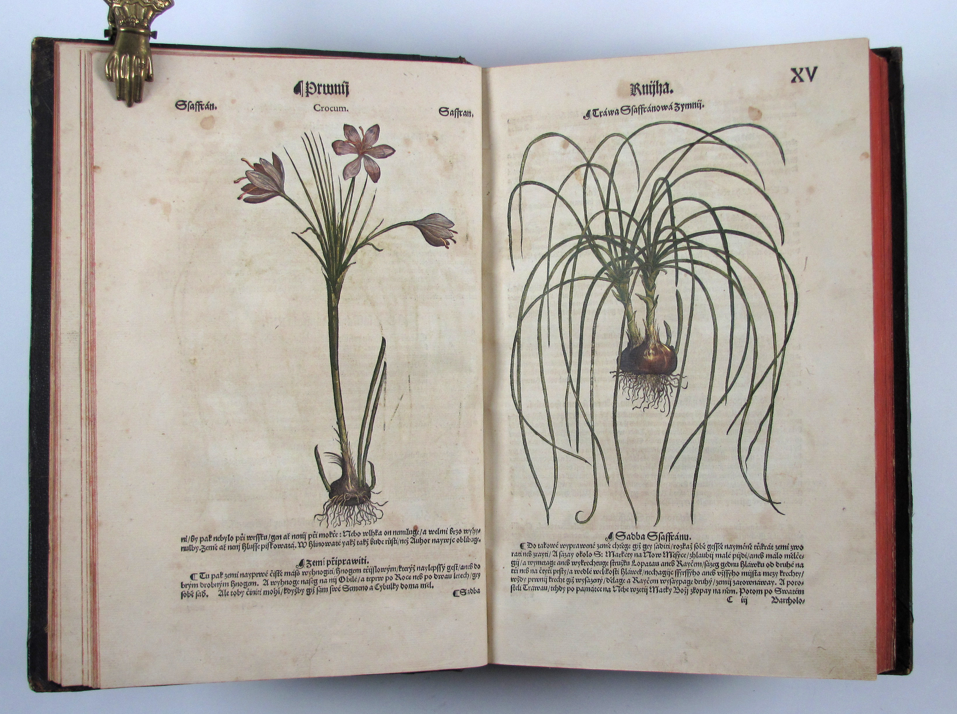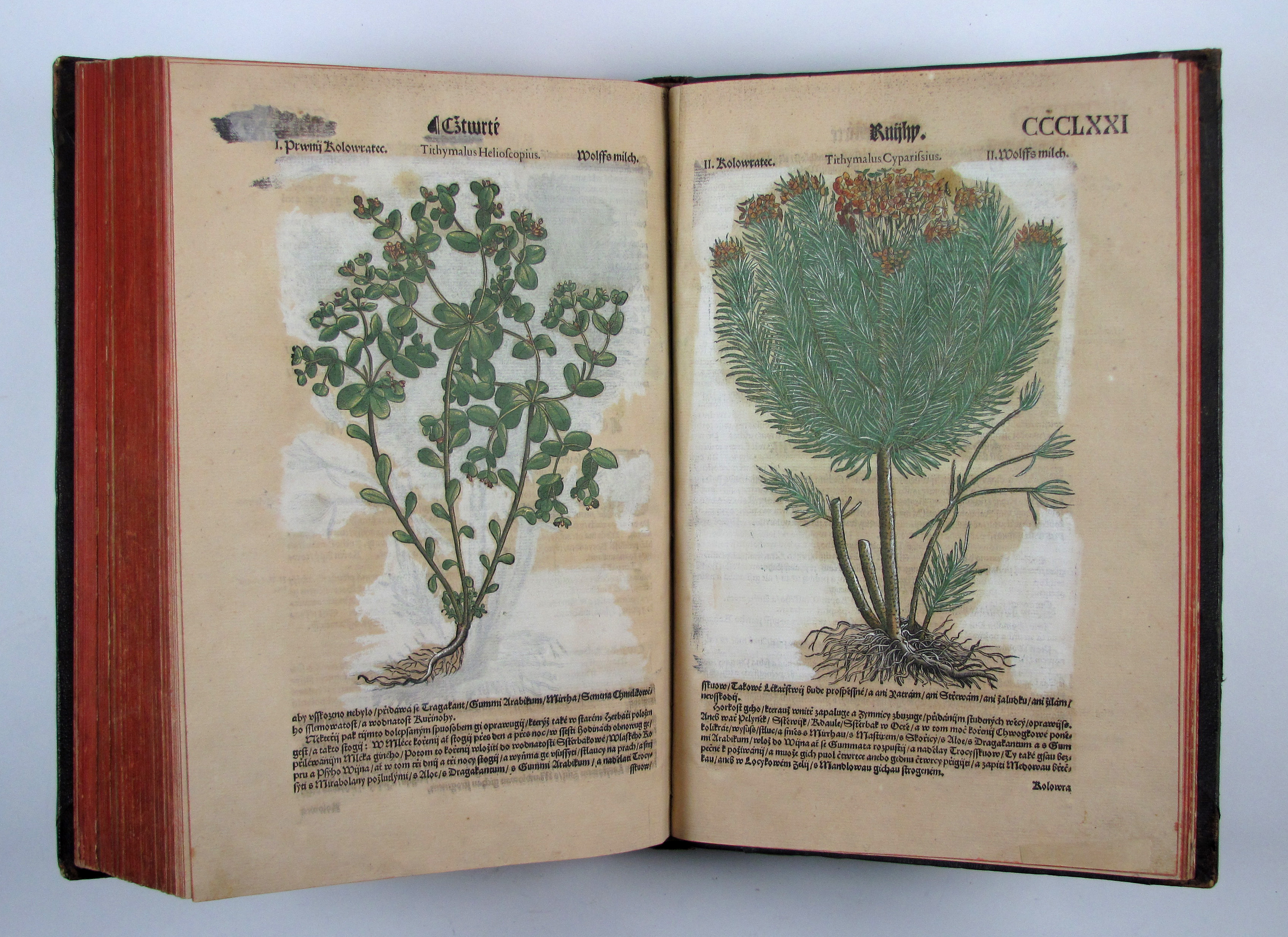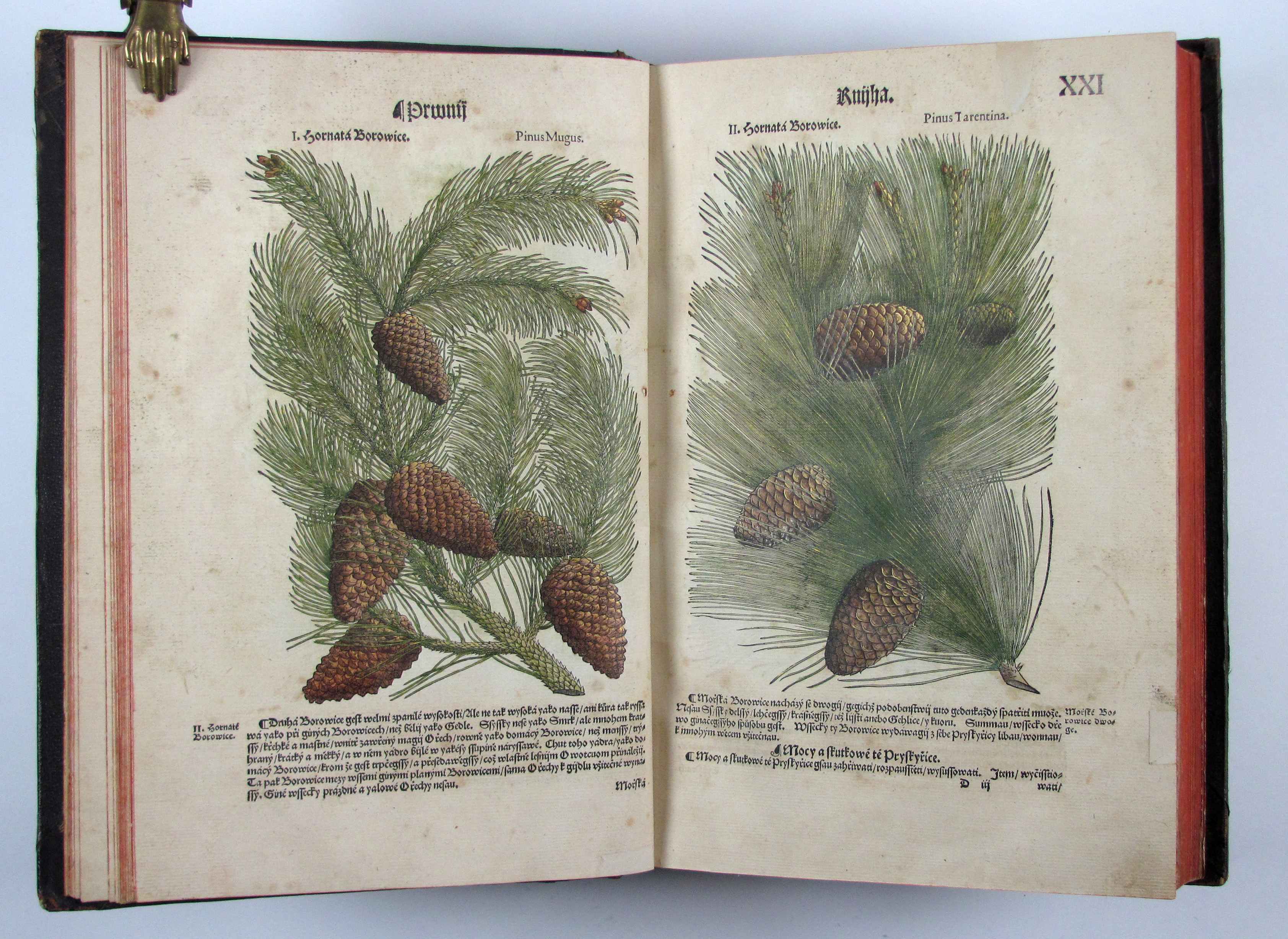 Seltene erste böhmische Ausgabe in tschechischer Sprache, die erste Ausgabe mit den großen Holzschnitten von Giorgio Liberale und Wolfgang Meyerpeck. Der Herausgeber Th. Hagek (1525-1600) war praktischer Arzt, zweitweise Professor der Mathematik am Carolinum, später Leibarzt der Kaiser Maximilian II und Rudolph II.– Im folgenden Jahr erschien, ebenfalls bei Melanchtrich, das Kräuterbuch in deutscher Sprache mit über 800 Holzschnitten, eine nochmals erweiterte Serie von 932 Schnitten fand im Dioscoridis-Kommentar von 1565 Verwendung.– Herausragend am vorliegenden Exemplar das einmalige, durchgehend reich mit Gold und Silber gehöhte, sorgfältige Prachtkolorit. Kolorierte Exemplare aller Matthiolus-Ausgaben mit den großformatigen Holzschnitten sind von großer Seltenheit.– Am Anfang fehlt der Titel und die Vorrede mit 2 Portraits und Wappenholzschnitten im Text, der Teil mit den Pflanzen bis auf 7 Blatt komplett, am Schluß 3 (von 6) Holzschnitte mit Destillier-Öfen, danach fehlt das Register. Einige Anränderungen, hinterlegte Ein- und Ausrisse, tls. gebräunt und fleckig, vereinzelt der Abklatsch unschön mit dünnem Deckweiß beseitigt. Insgesamt trotz der Erhaltungsmängel und Unvollständigkeit durch die Seltenheit der Ausgabe und das Kolorit ein begehrenswertes Exemplar.– Nissen 1314. Pritzel 5992. Vgl. Hunt 91 Anmerkung.
