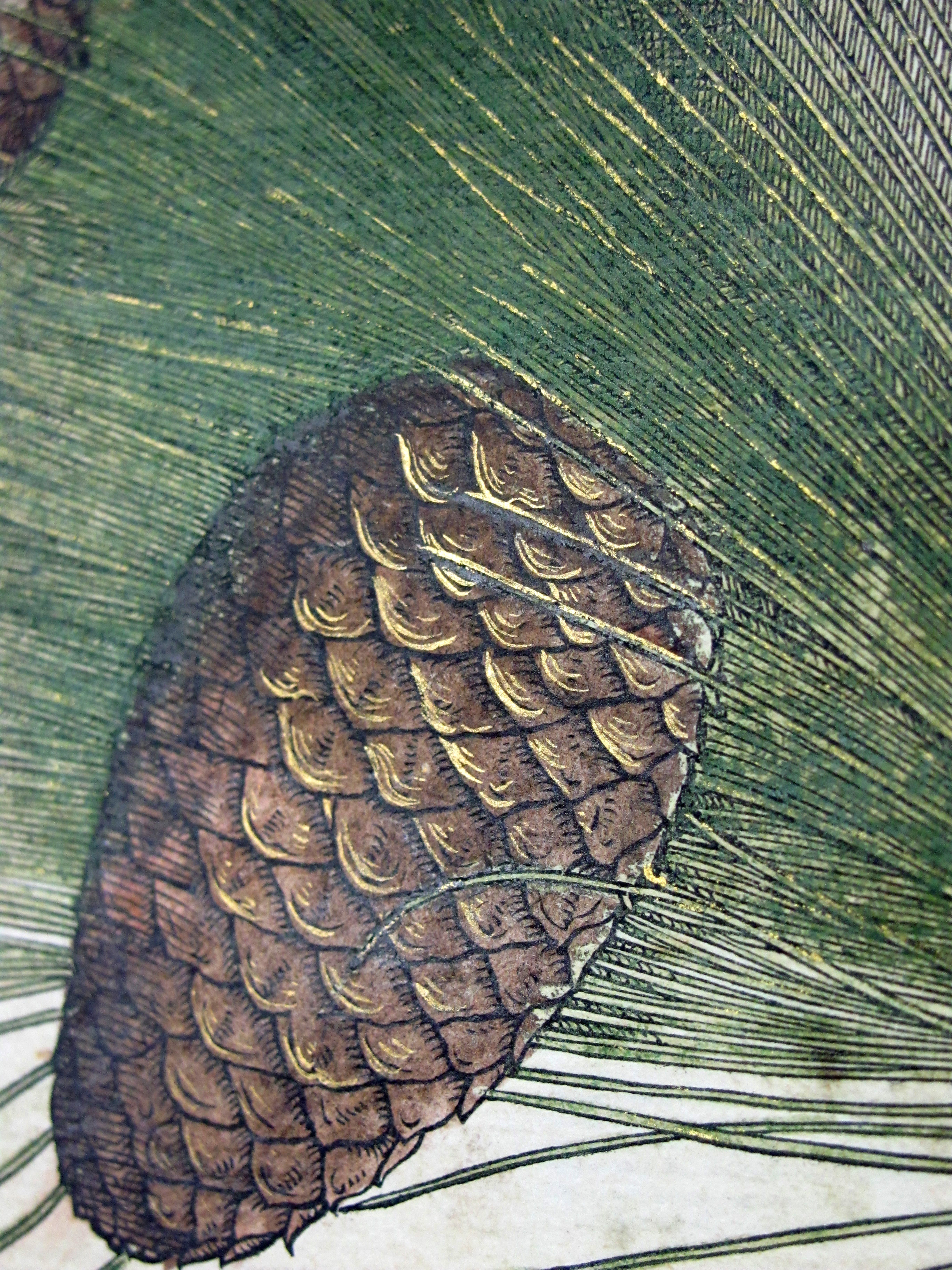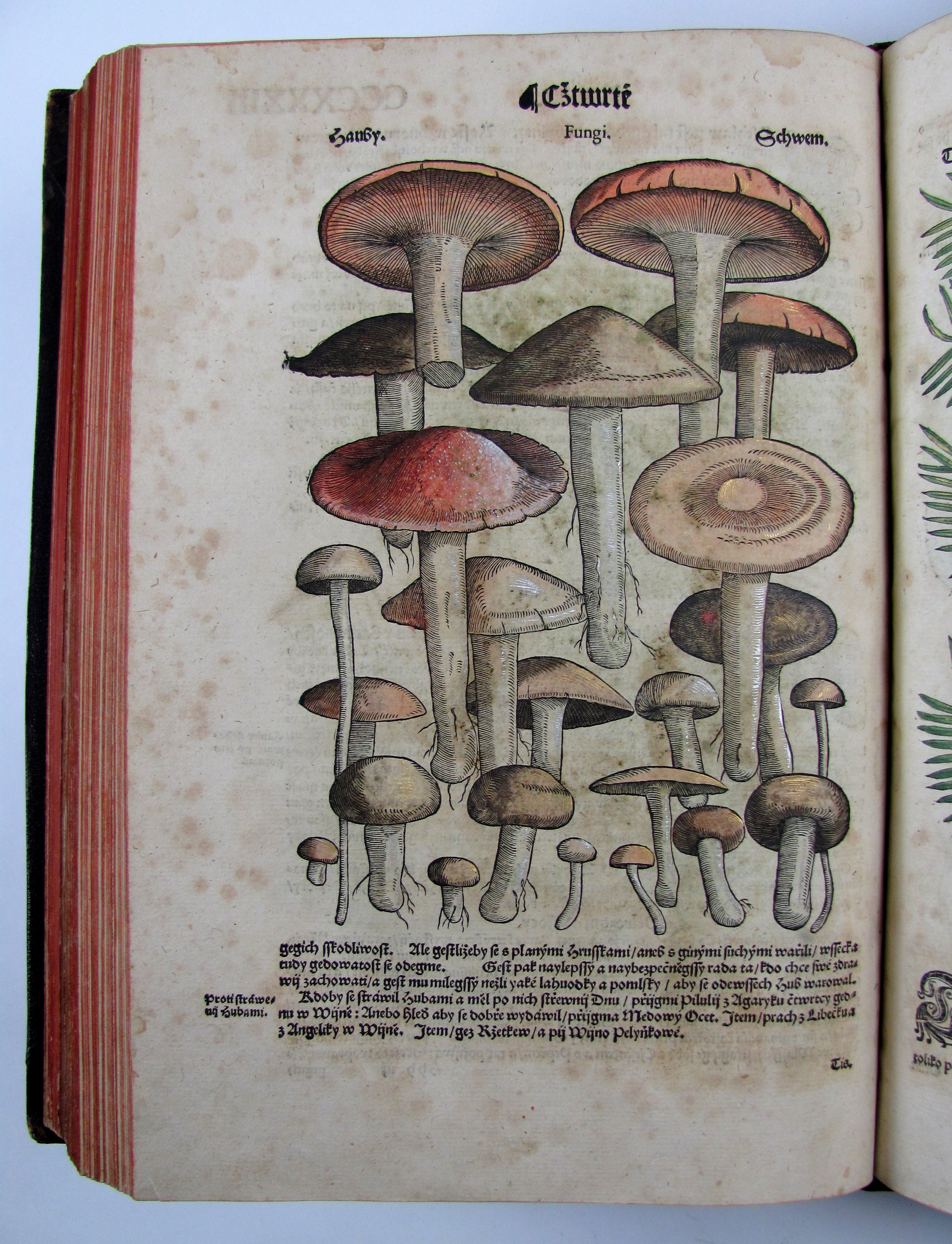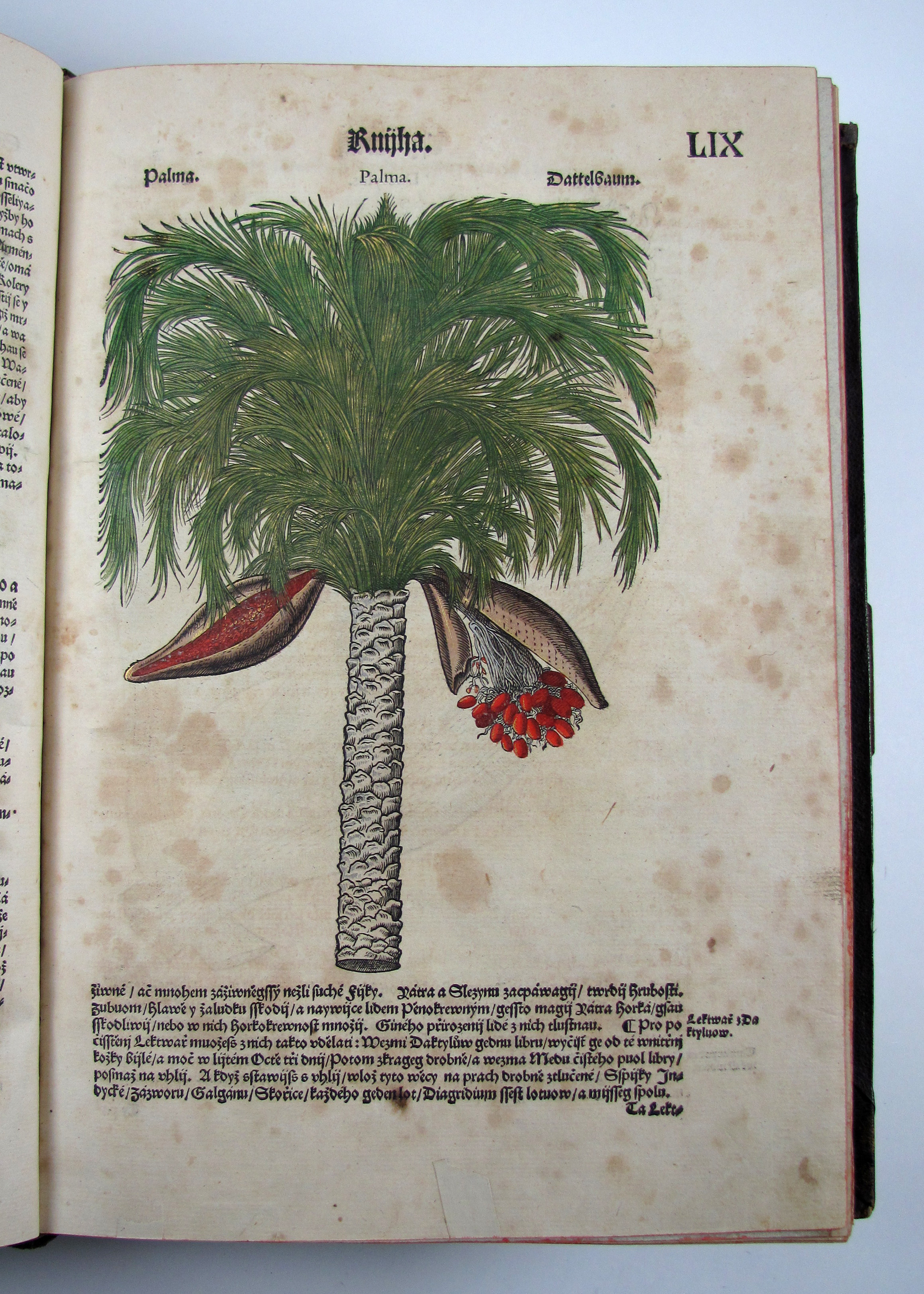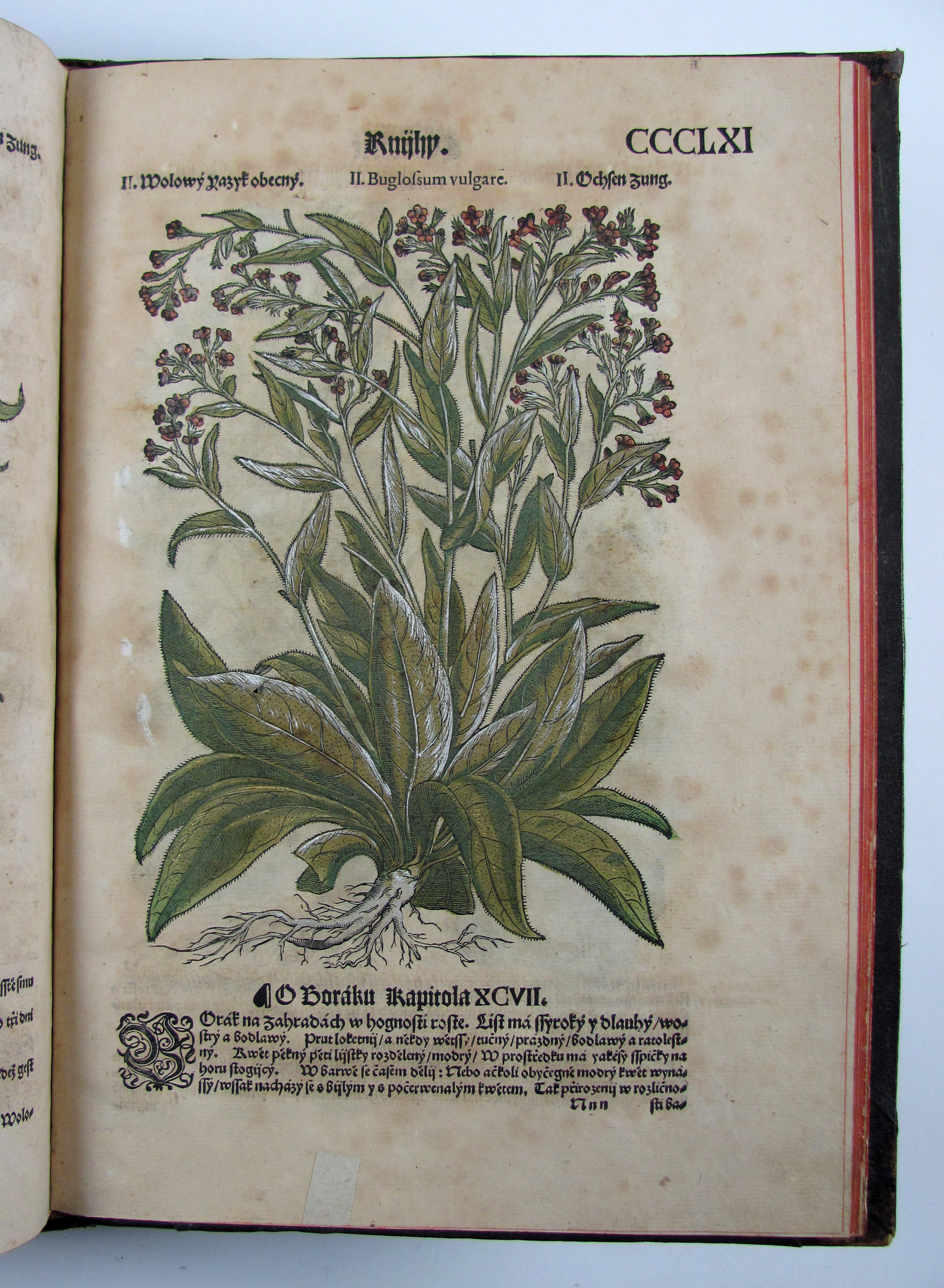 Seltene erste böhmische Ausgabe in tschechischer Sprache, die erste Ausgabe mit den großen Holzschnitten von Giorgio Liberale und Wolfgang Meyerpeck. Der Herausgeber Th. Hagek (1525-1600) war praktischer Arzt, zweitweise Professor der Mathematik am Carolinum, später Leibarzt der Kaiser Maximilian II und Rudolph II.– Im folgenden Jahr erschien, ebenfalls bei Melanchtrich, das Kräuterbuch in deutscher Sprache mit über 800 Holzschnitten, eine nochmals erweiterte Serie von 932 Schnitten fand im Dioscoridis-Kommentar von 1565 Verwendung.– Herausragend am vorliegenden Exemplar das einmalige, durchgehend reich mit Gold und Silber gehöhte, sorgfältige Prachtkolorit. Kolorierte Exemplare aller Matthiolus-Ausgaben mit den großformatigen Holzschnitten sind von großer Seltenheit.– Am Anfang fehlt der Titel und die Vorrede mit 2 Portraits und Wappenholzschnitten im Text, der Teil mit den Pflanzen bis auf 7 Blatt komplett, am Schluß 3 (von 6) Holzschnitte mit Destillier-Öfen, danach fehlt das Register. Einige Anränderungen, hinterlegte Ein- und Ausrisse, tls. gebräunt und fleckig, vereinzelt der Abklatsch unschön mit dünnem Deckweiß beseitigt. Insgesamt trotz der Erhaltungsmängel und Unvollständigkeit durch die Seltenheit der Ausgabe und das Kolorit ein begehrenswertes Exemplar.– Nissen 1314. Pritzel 5992. Vgl. Hunt 91 Anmerkung.