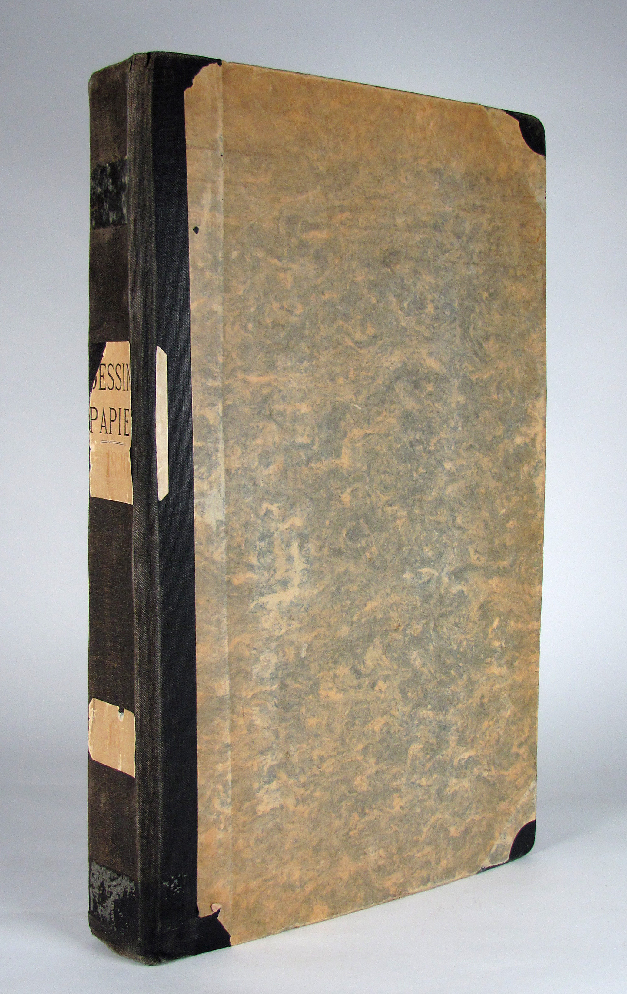 Ein großartiges, sehr umfangreiches und farbenfrohes Stoffmusterbuch mit einer unglaublichen Anzahl und Vielfalt an äußerst sorgfältig gestalteten Originalentwürfen. Flüchtig betrachtet entsteht durch die minutiös ausgeführten Entwürfe zunächst der Eindruck von gedruckten oder zumindest mit Schablonen erstellten Mustern, tatsächlich sind die Entwürfe durchgehend freihand gezeichnet. Sie zeigen eine große Bandbreite verschiedener ornamentaler, geometrischer und floraler Muster in leuchtenden Farben und wurden für Stoffe aller denkbaren Verwendungszwecke erstellt.– Das Elsaß war in der ersten Hälfte des 19. Jahrhunderts ein Zentrum der Textilindustrie, einige Blätter in etwas kleinerem Format tragen die handschriftliche Bezeichnung einer für mich nicht weiter zu eruierenden Firma „Jodon & Cie. bzw Richemond et J(odon)“ und sind mit 1842 bzw. 1844 datiert. Drei Blätter (5, 12 und 80) mit je einem kleinem Muster eines gewebten Stoffes. – Das Album mit den üblichen Gebrauchsspuren, dem Band sind immer wieder Musterentnommen worden, teils durch Ablösung, tls. durch Ausschnitte der Trägerblätter, vereinzelt kleine Wasserränder im Trägerpapier, nur einige weniger Muster mit Feuchtigkeitsspuren.