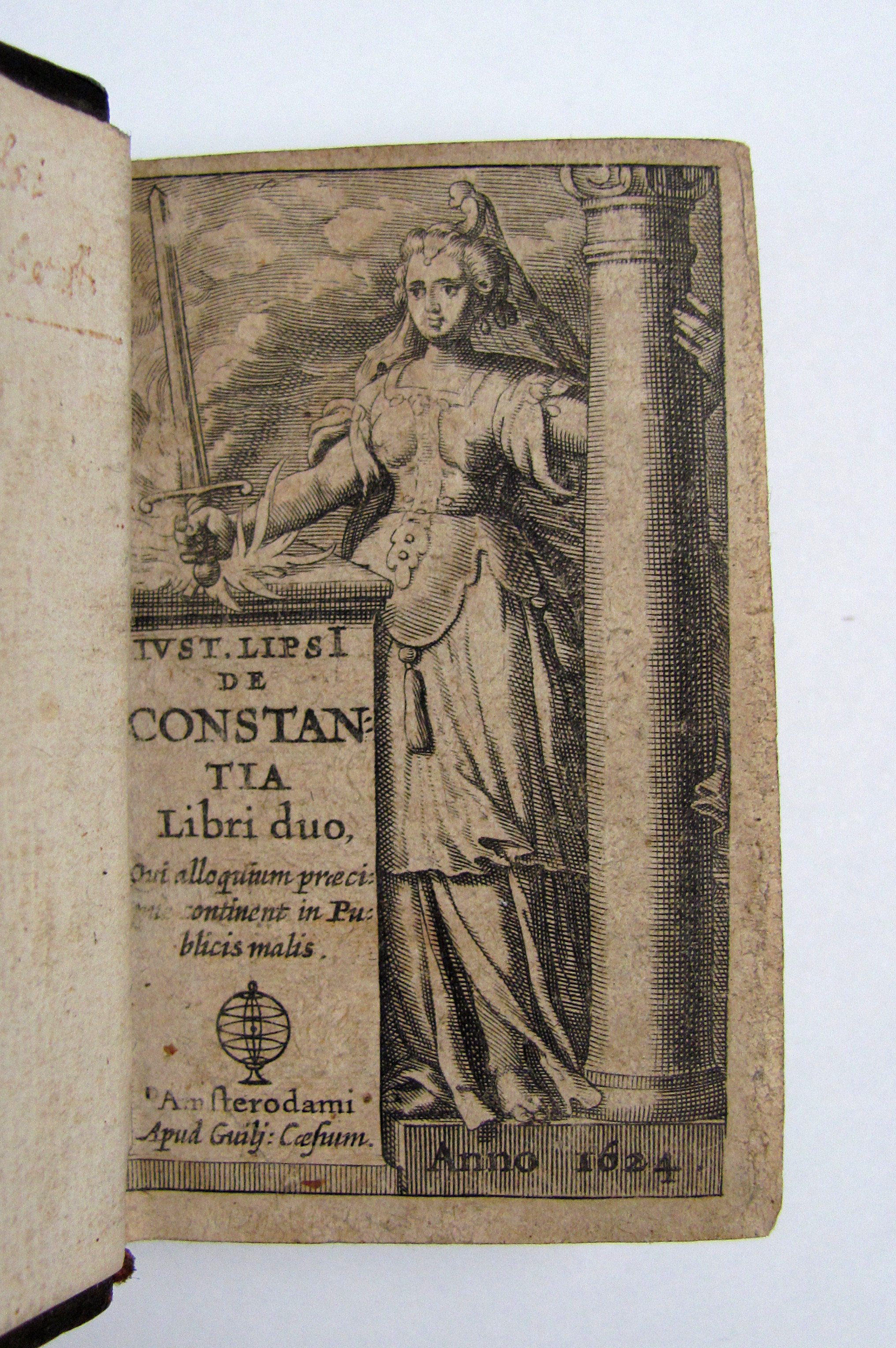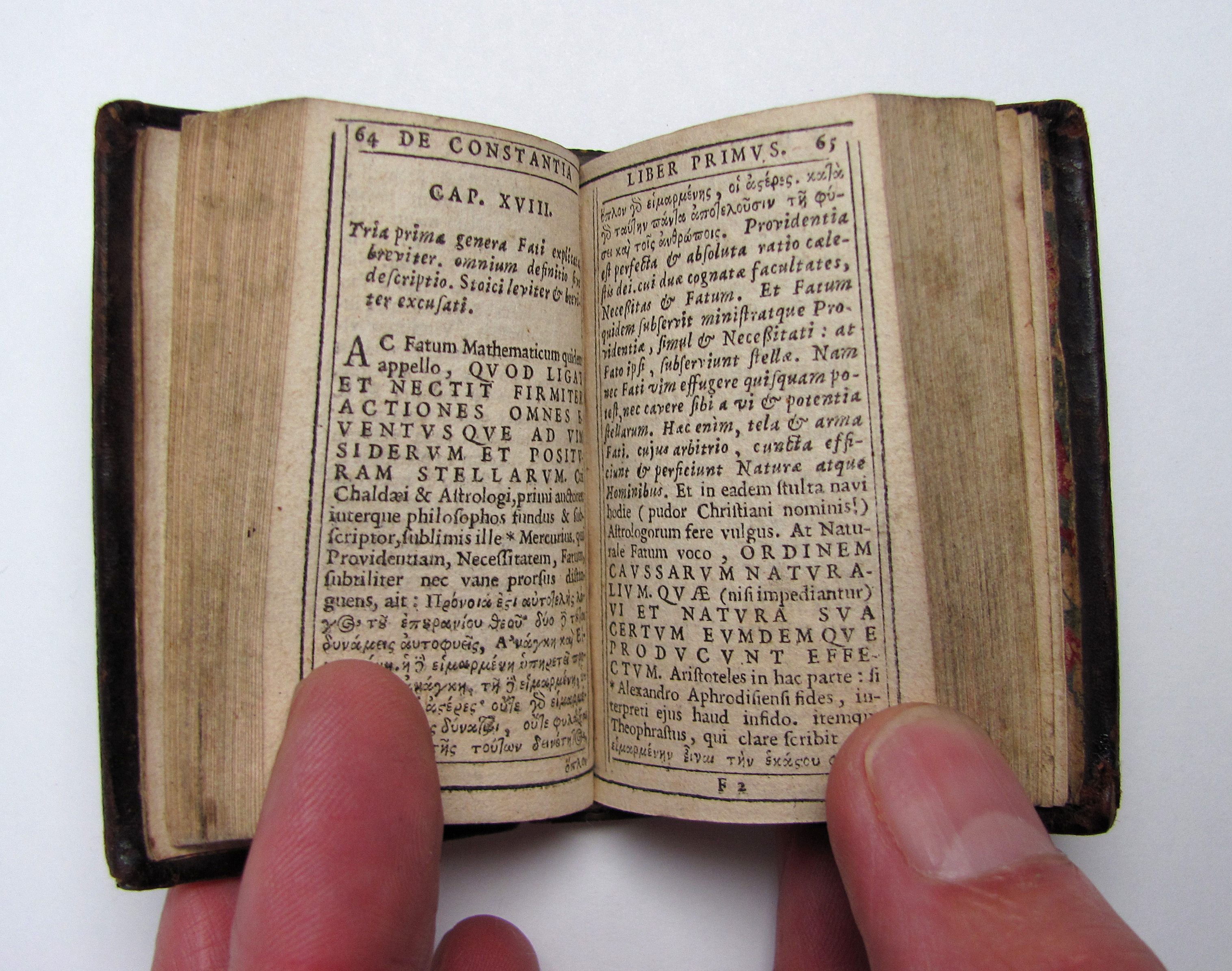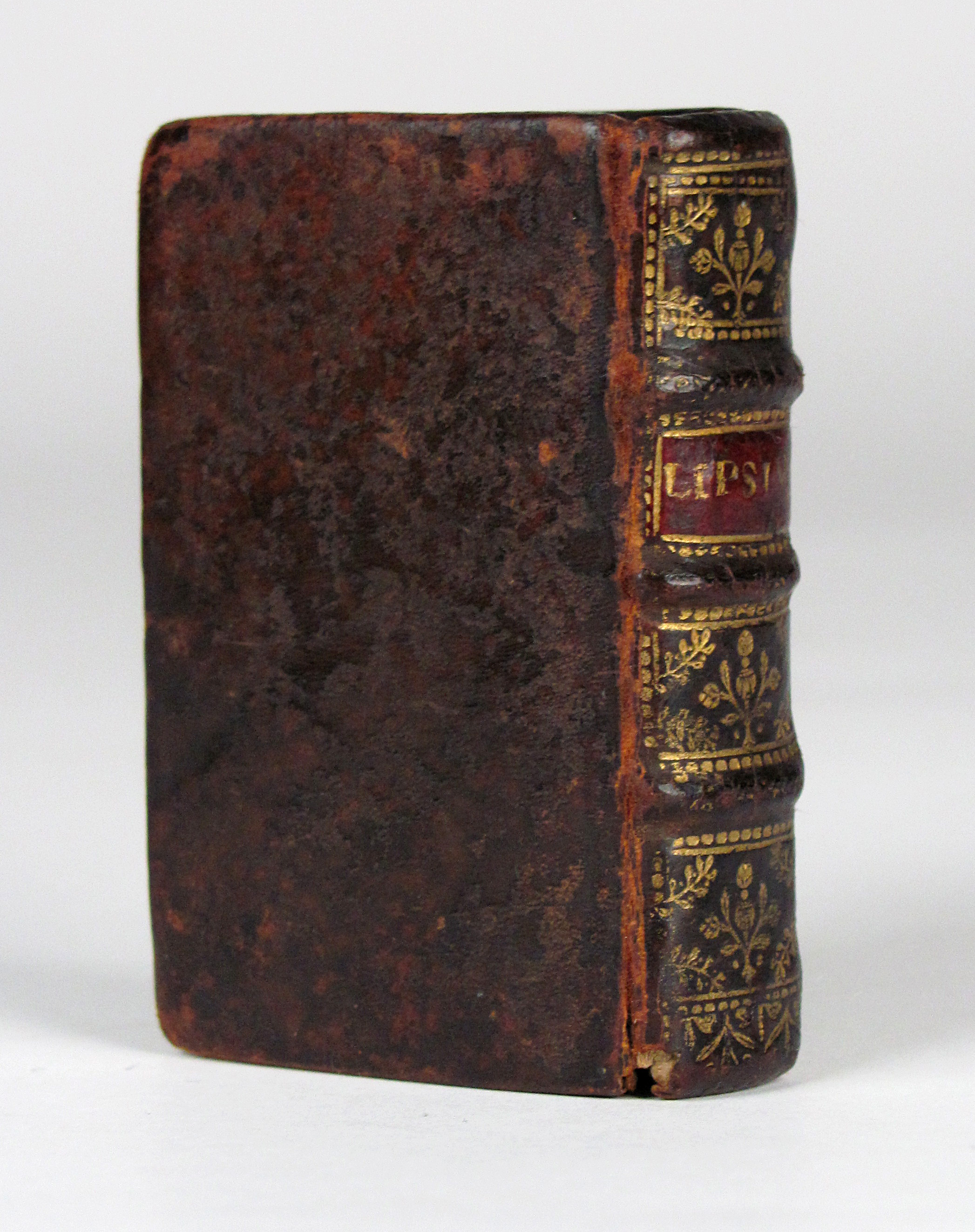 Schönes Exemplar des sehr seltenen, frühen und typographisch hochwertigen Miniaturbuches.– Lipsius (1547 – 1606) war ein flämischer Philosoph und Philologe. Sein heutiger Ruf beruht vor allem auf seiner Tätigkeit als Lateinphilologe und seinen kritischen Ausgaben von Tacitus und Seneca. „Über die Beständigkeit“ ist wahrscheinlich das berühmteste seiner philosophischen Werke, die darauf abzielten, den antiken Stoizismus in einer mit dem Christentum vereinbaren Form wiederzubeleben. Das Werk erschien erstmals 1584 und wurde in kleinformatigen Ausgaben u.a. von Plantin 1605, 1613 und später vom Maire, 1628 und Janssonius, 1631 veröffentlicht. Die vorliegende Ausgabe ist im Format die kleinste.– Von guter Gesamterhaltung.– Welsh, Bibliographie, 4423.– Nicht bei Welsh (History), Bondy und Nauroy.