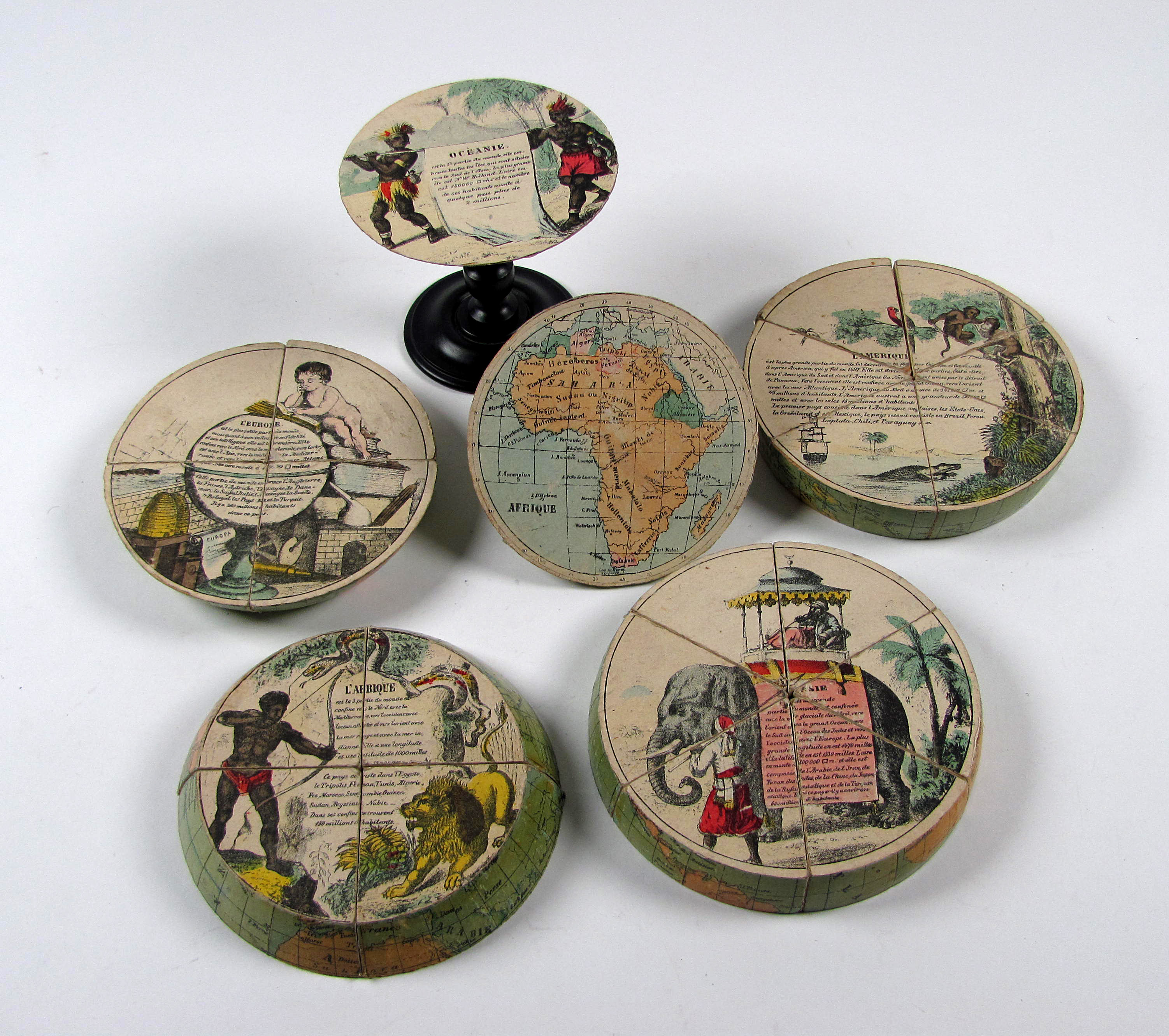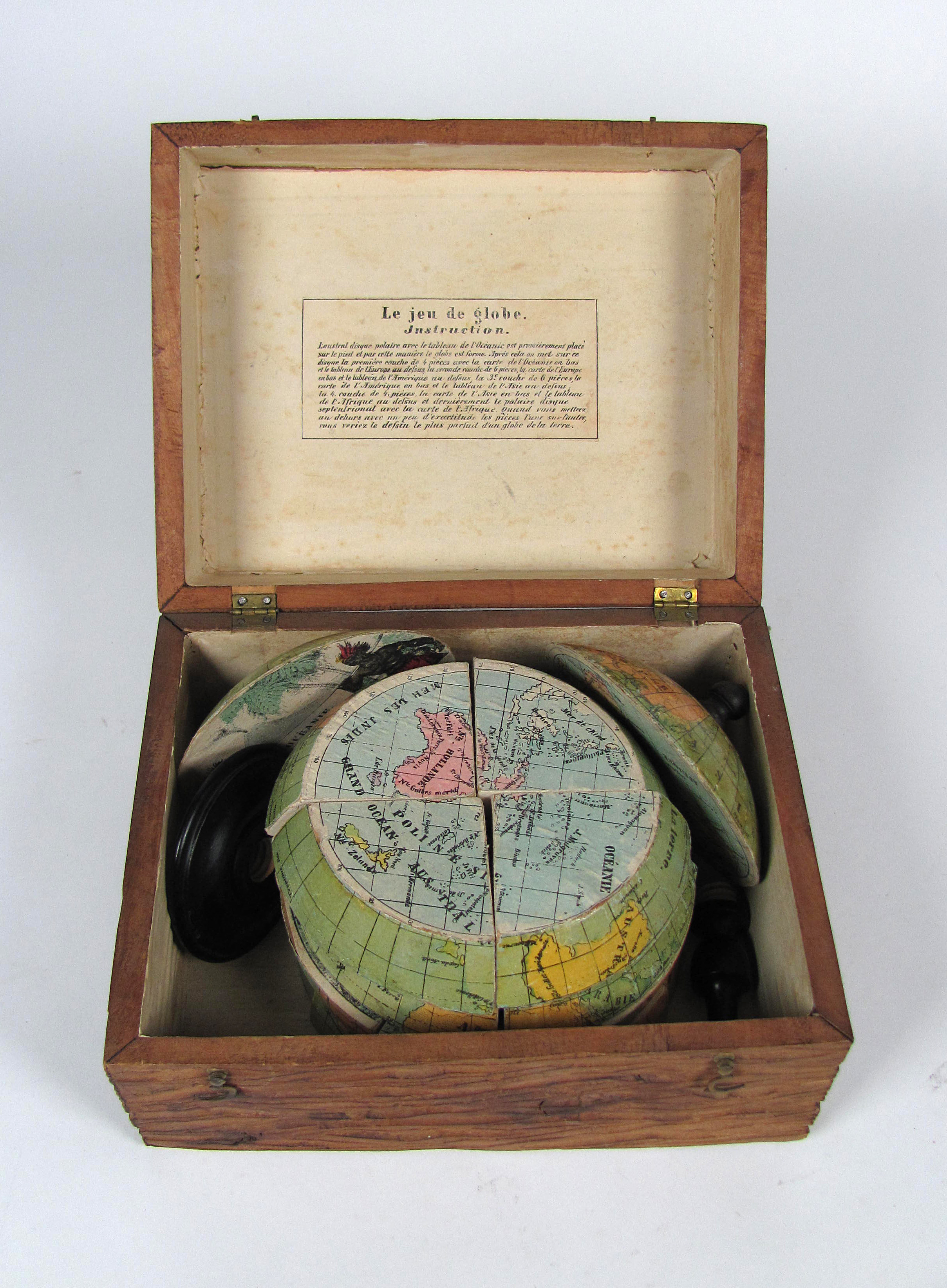 Sehr seltenes pädagogisches Puzzle in Globenform, durch die innere, versteckte Illustration äußerst reizvoll.– Für ein derartiges Spiel von hervorragendem Gesamtzustand. Oft fehlen bei diesem seltenen Spiel einzelne Teile oder der empfindliche Bezug der Teile ist großflächig schadhaft, weil abgespielt. Hier nur sehr wenige minimale Fehlstellen und Bräunung des Schutzfirnis an der Außenseite.– Es existiert eine deutsche Ausgabe „Weltkugelspiel“ mit 38 Teilen und eine zweite, einfache französische Ausgabe mit 16 Teilen.– Vergl. N. Gockerell, Das Spielzeug. In: Das Bayerische Nationalmuseum 1855-2005, S. 574. Historisches Museum Basel, Inv. 1982.619.