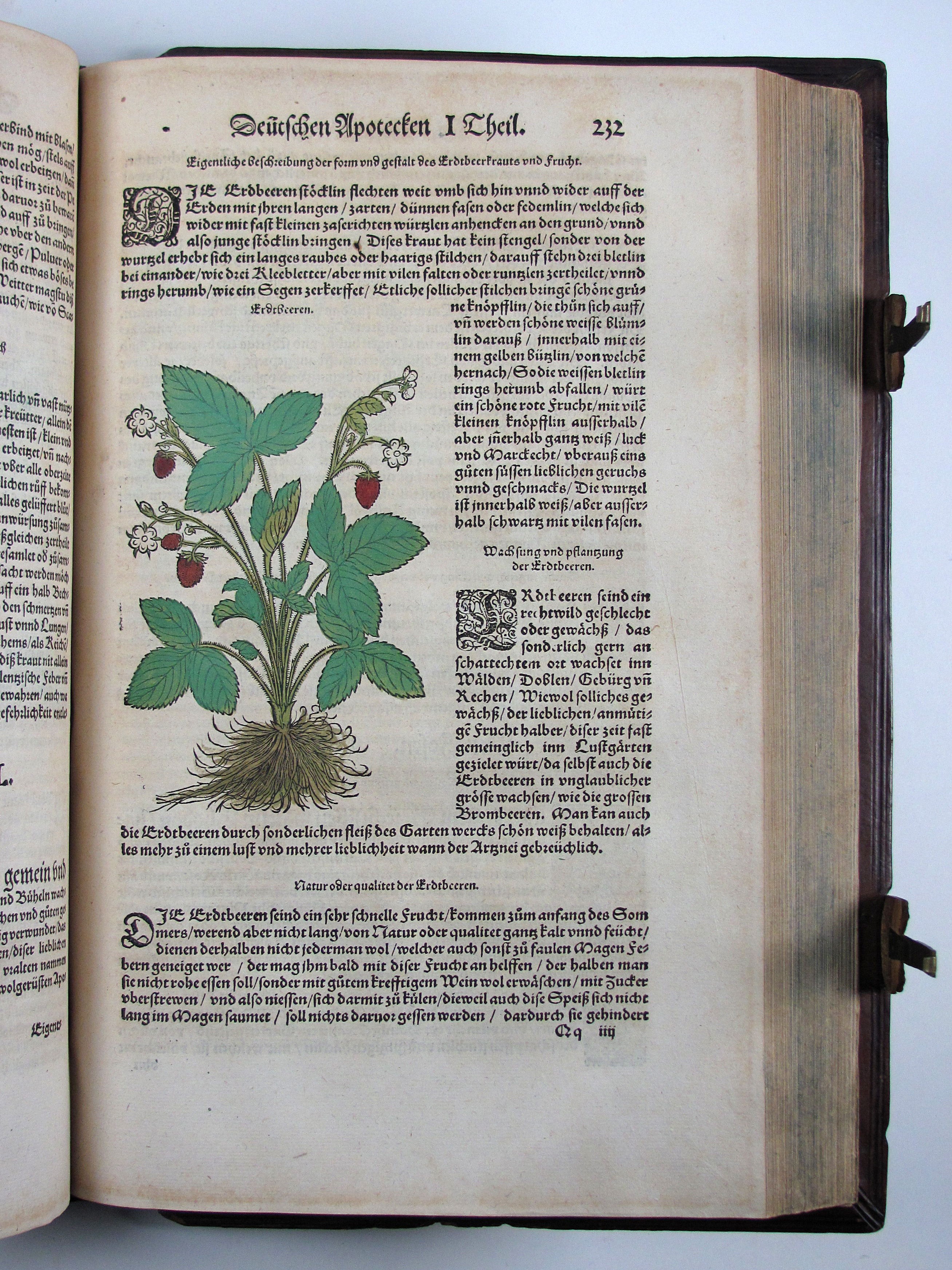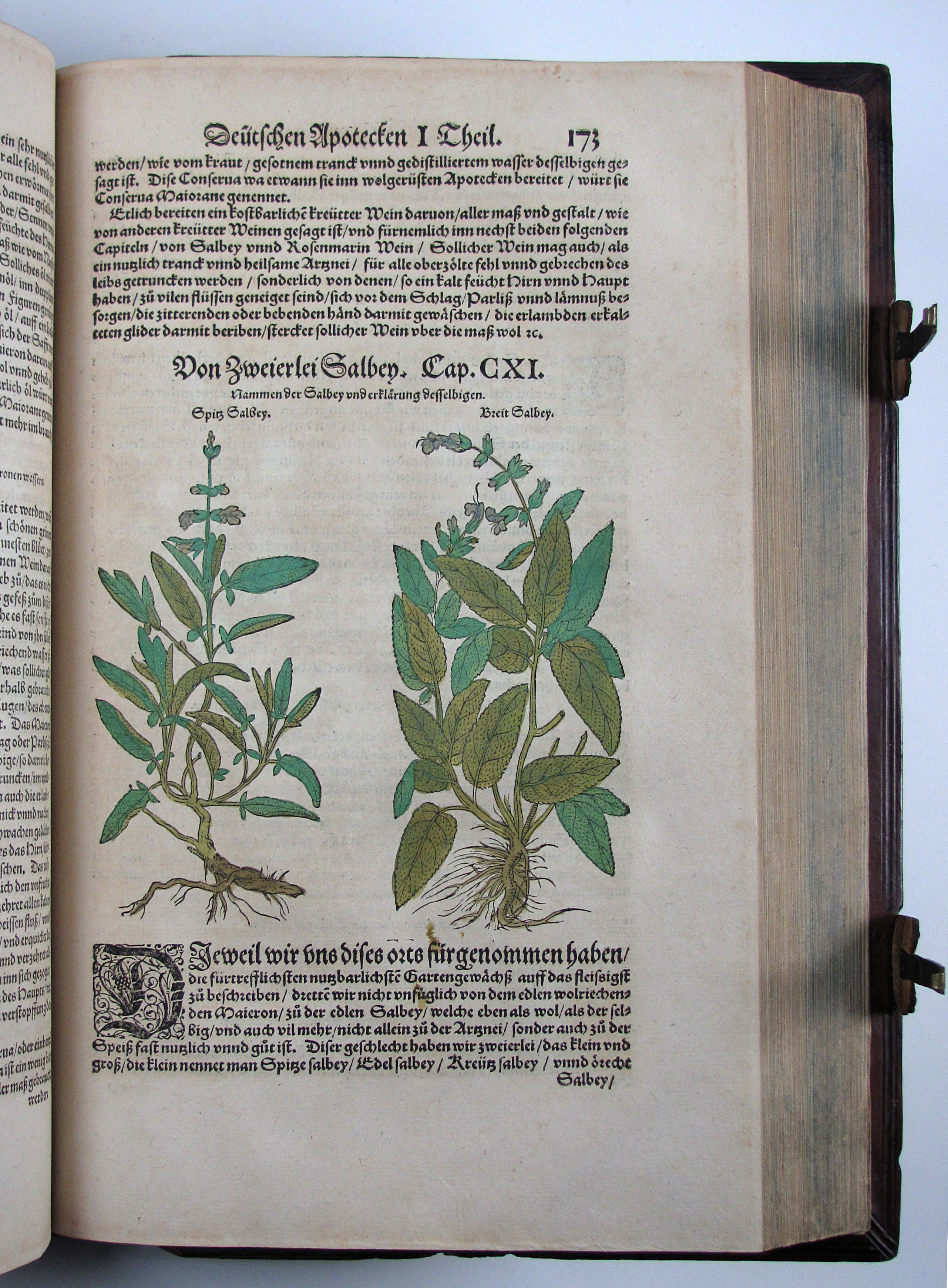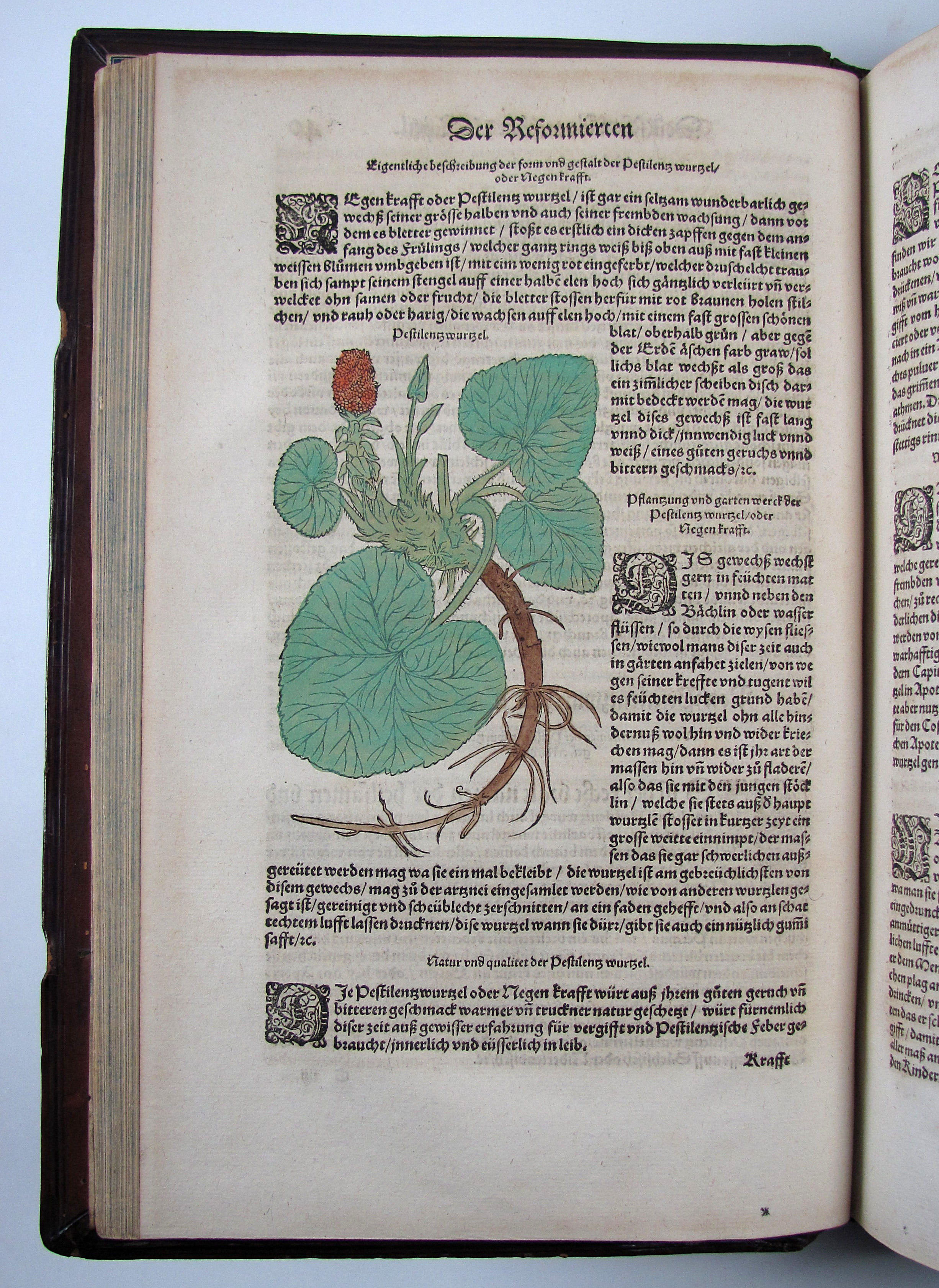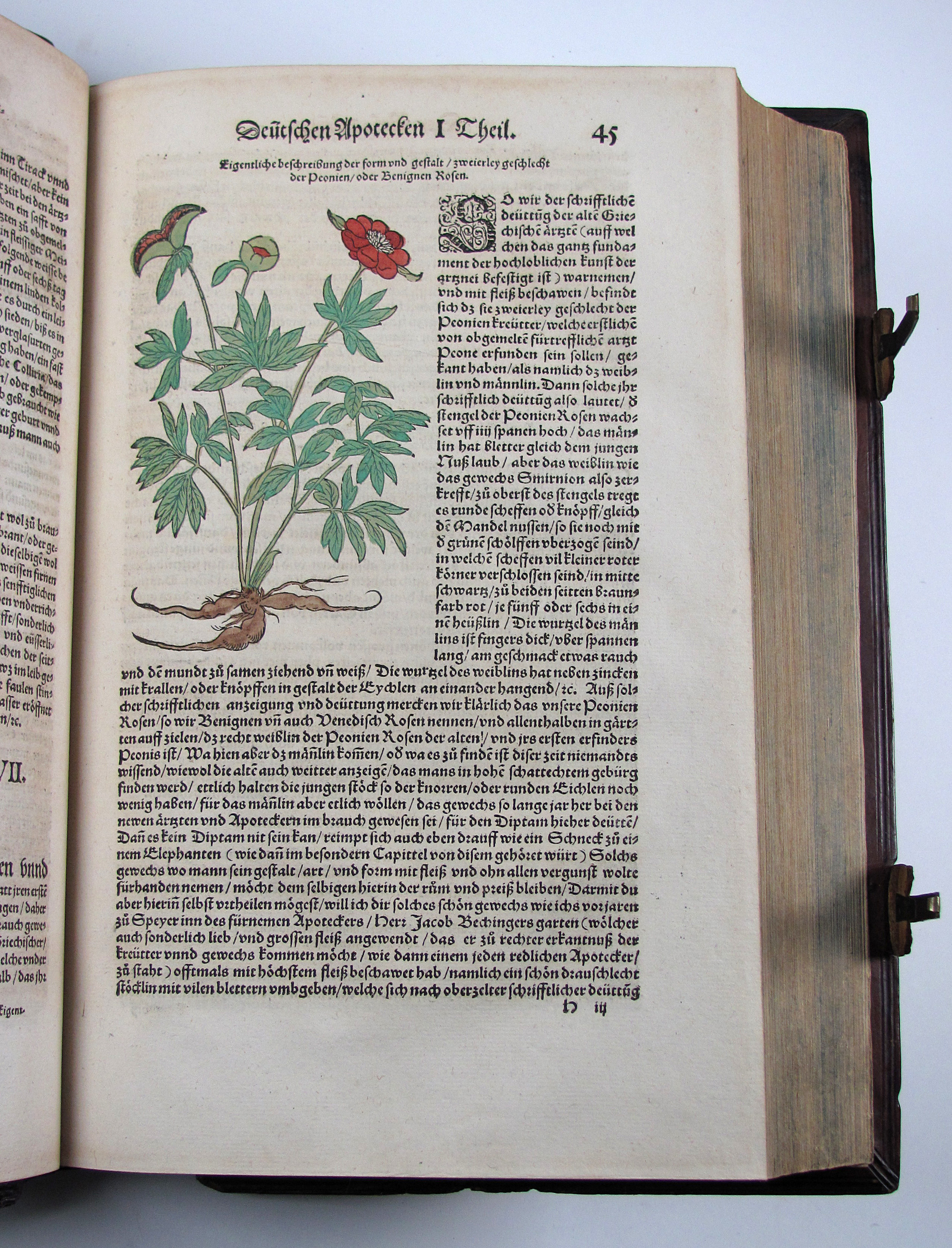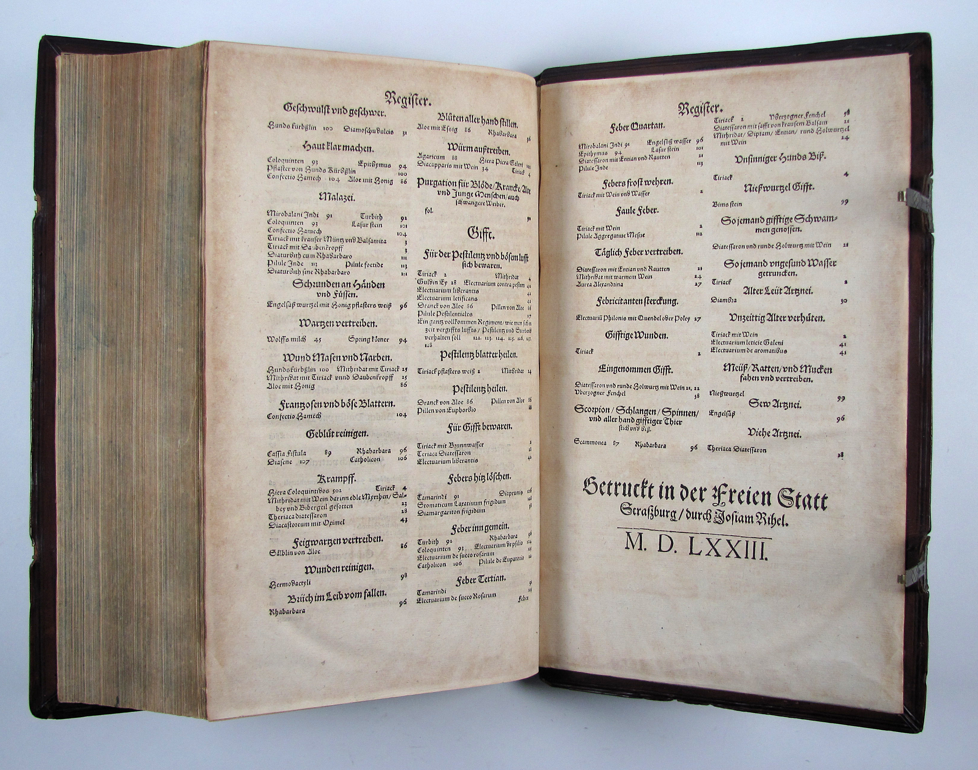 Einzige unter diesem Titel, posthum erschienene Ausgabe. Hunt nimmt an, daß der Herausgeber das Werk aus dem nachgelassenen Material Ryffs und den bis dahin erschienenen Schriften zusammengestellt und somit selber eigentlich ein neues Werk geschaffen hat.– Die Holzschnitte gehen auf Kandels Illustrationen zu Bock’s Kreuterbuch. Ryff wurde von Zeitgenossen, namentlich von Gessner und Fuchs, des Plagiats beschuldigt, stellten seine Schriften doch Kompilationen von bereits vorhandenem Material dar. In der Praxis war er nach Stationen in Nürnberg und Straßburg, wo er Nachfolger des Hieronymus Braunschweig gewesen sein soll, vor allem in Mainz erfolgreich. Dort schaffte er sich durch sein Wirken einen guten Ruf als Mediziner und Apotheker.– Exemplar in differziertem Altkolorit und einem prächtigen Einband der Zeit. Titel mit Wasserfleck, ansonsten innen wie außen von vorzüglicher Erhaltung. Provenienz: Juan Carlos Ahumada (Christies, New York, 1992).– Hunt I, 114. Nissen BBI 1707. Heilmann 192.