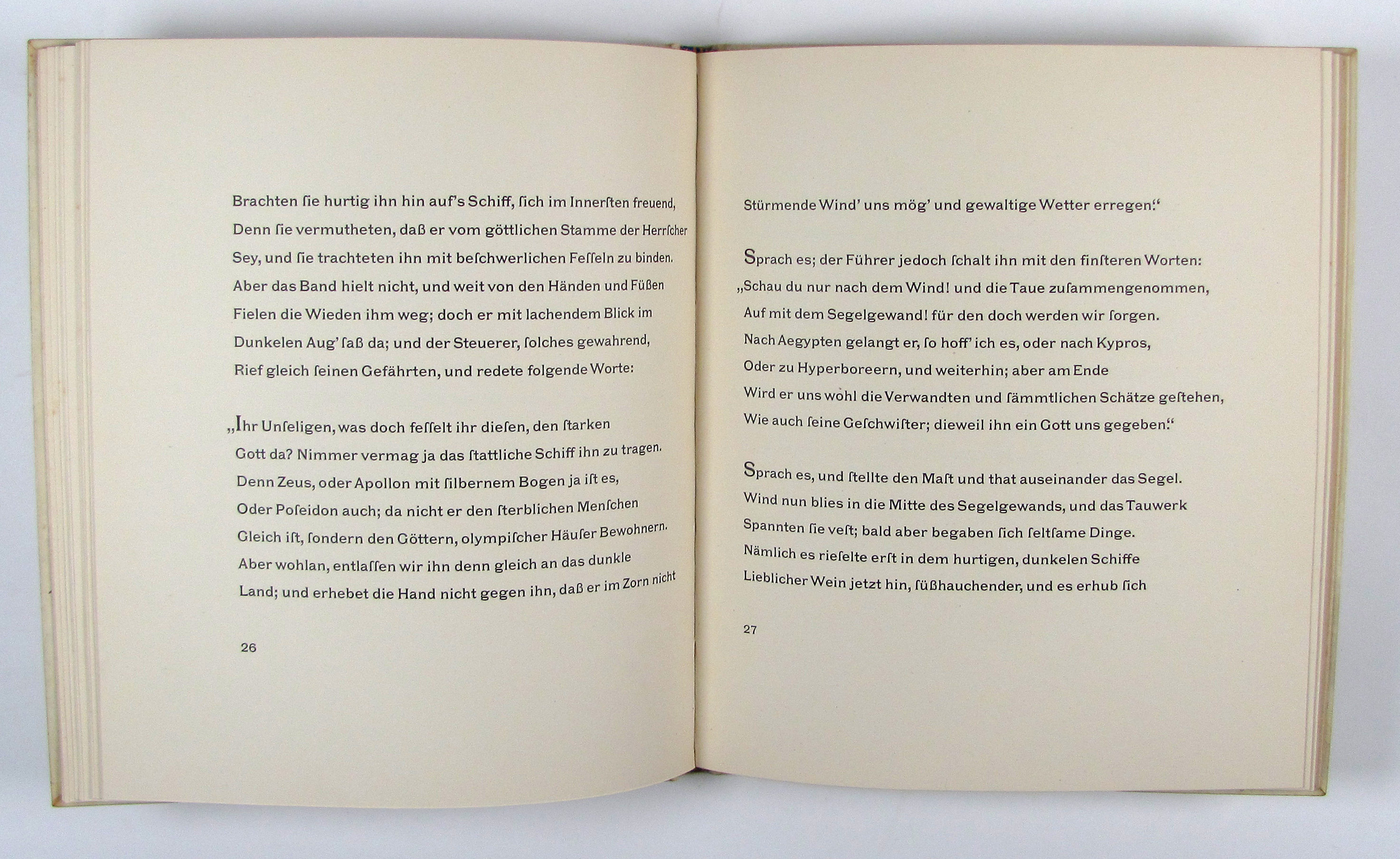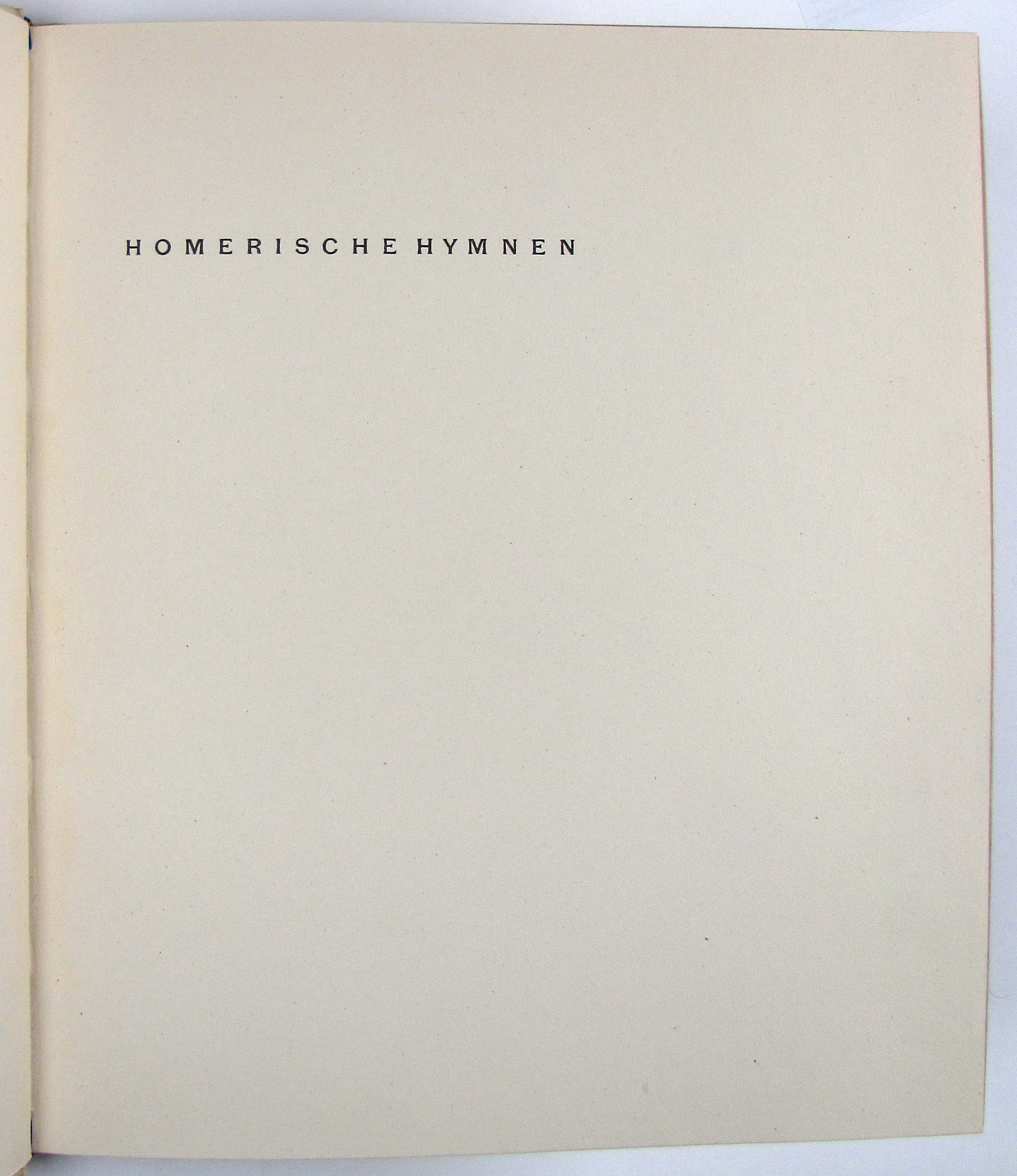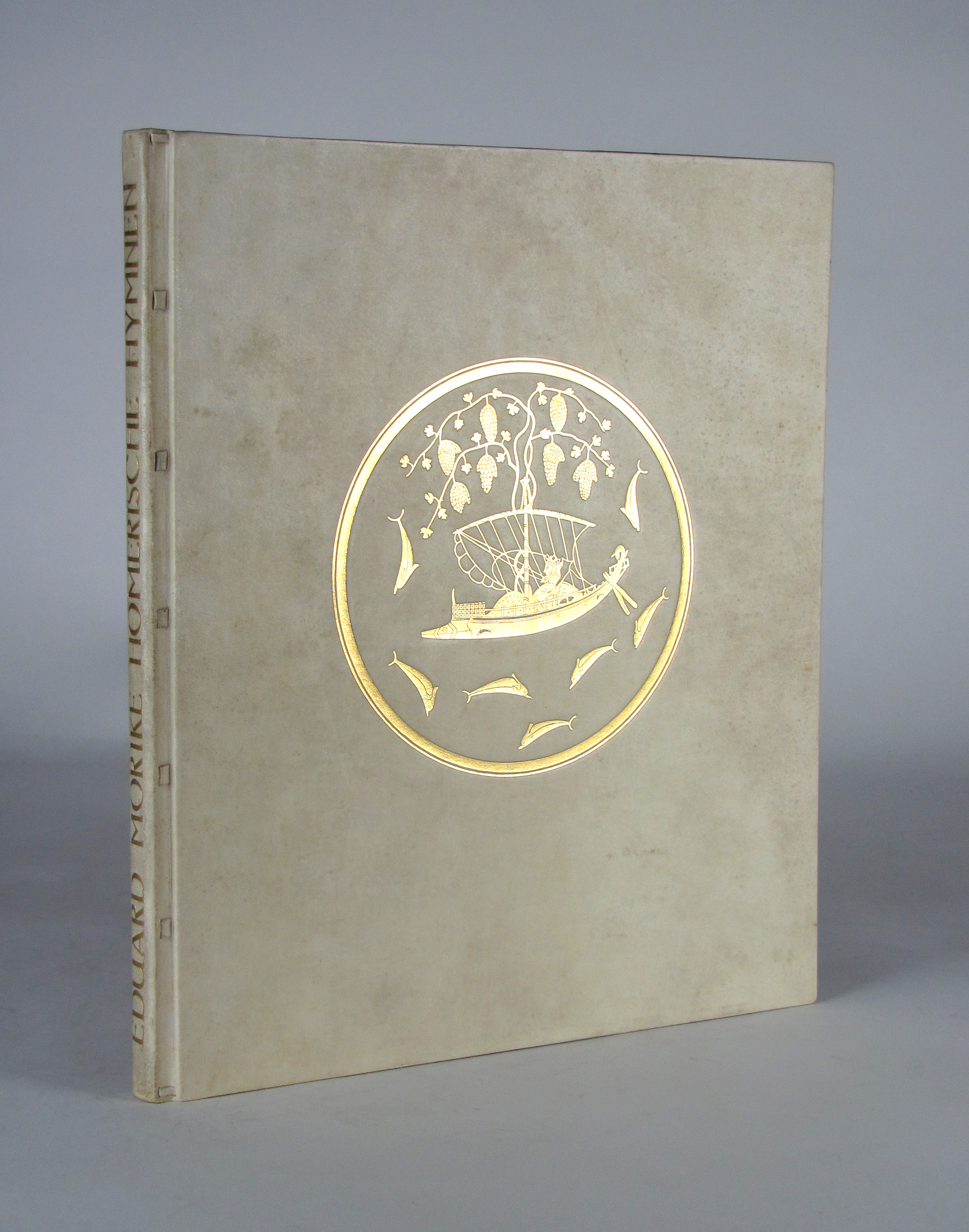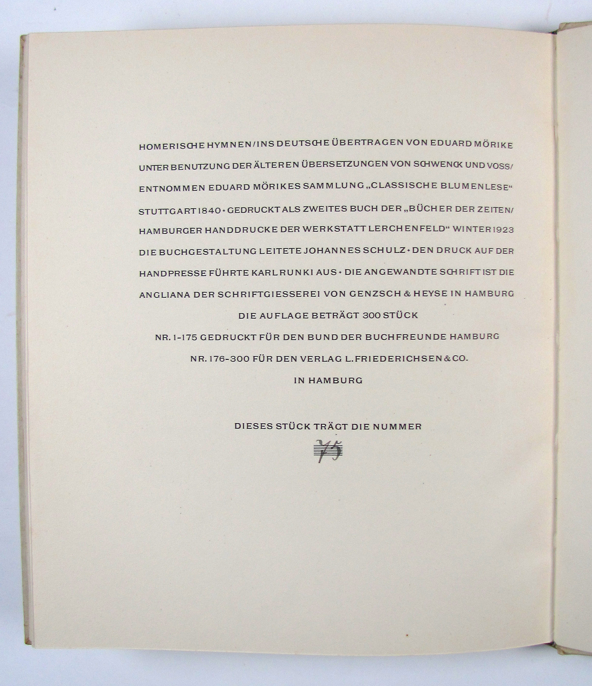 Nr. 75 von 300 Exemplaren.– 2. Buch der „Bücher der Zeiten/ Hamburger Handdrucke der Werkstatt Lerchenfeld“.– Die Buchgestaltung von Johannes Schulz, gedruckt auf der Handpresse von Karl Runki mit der Schrift Angliana der Schriftgießerei Genzsch & Heyse in Hamburg.– Tadelloses Exemplar eines der Vorzugsexemplae in Ganzpergamenteinband von Johannes Gerbers. Das Motiv des Vorderdeckels geht auf ein Innenbild einer Schale des Exekias aus Vulci zurück.– Rodenberg 141, 3.