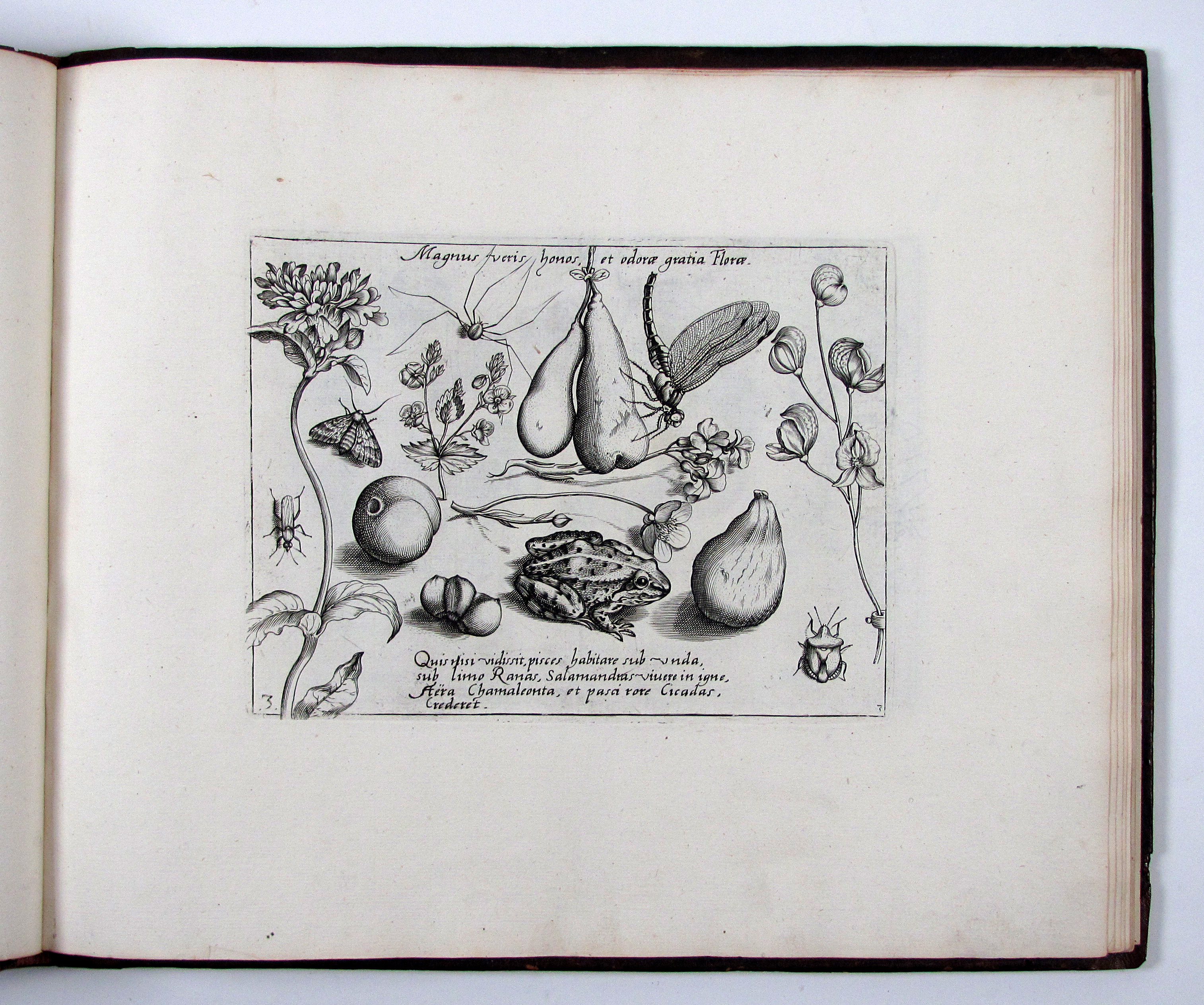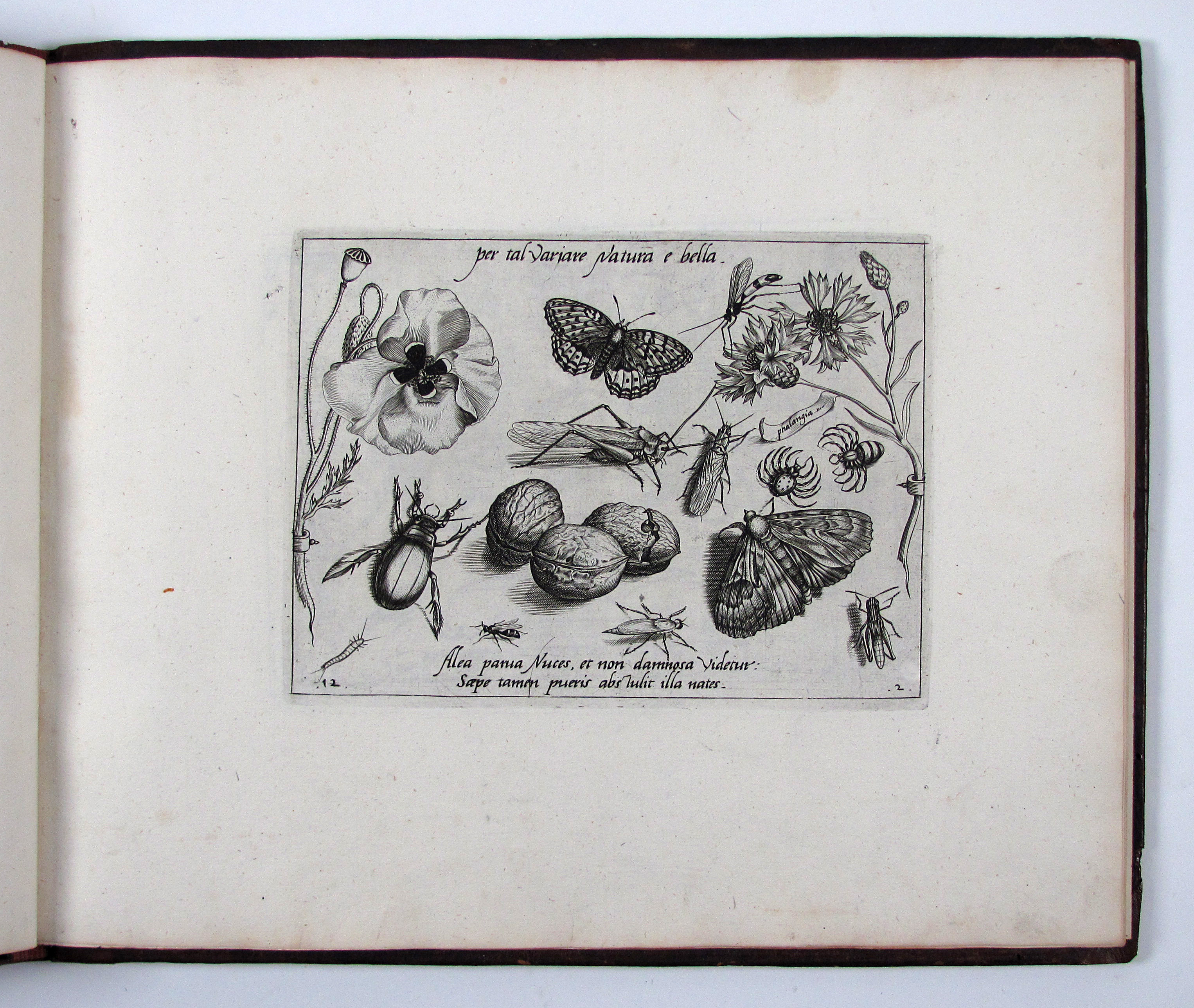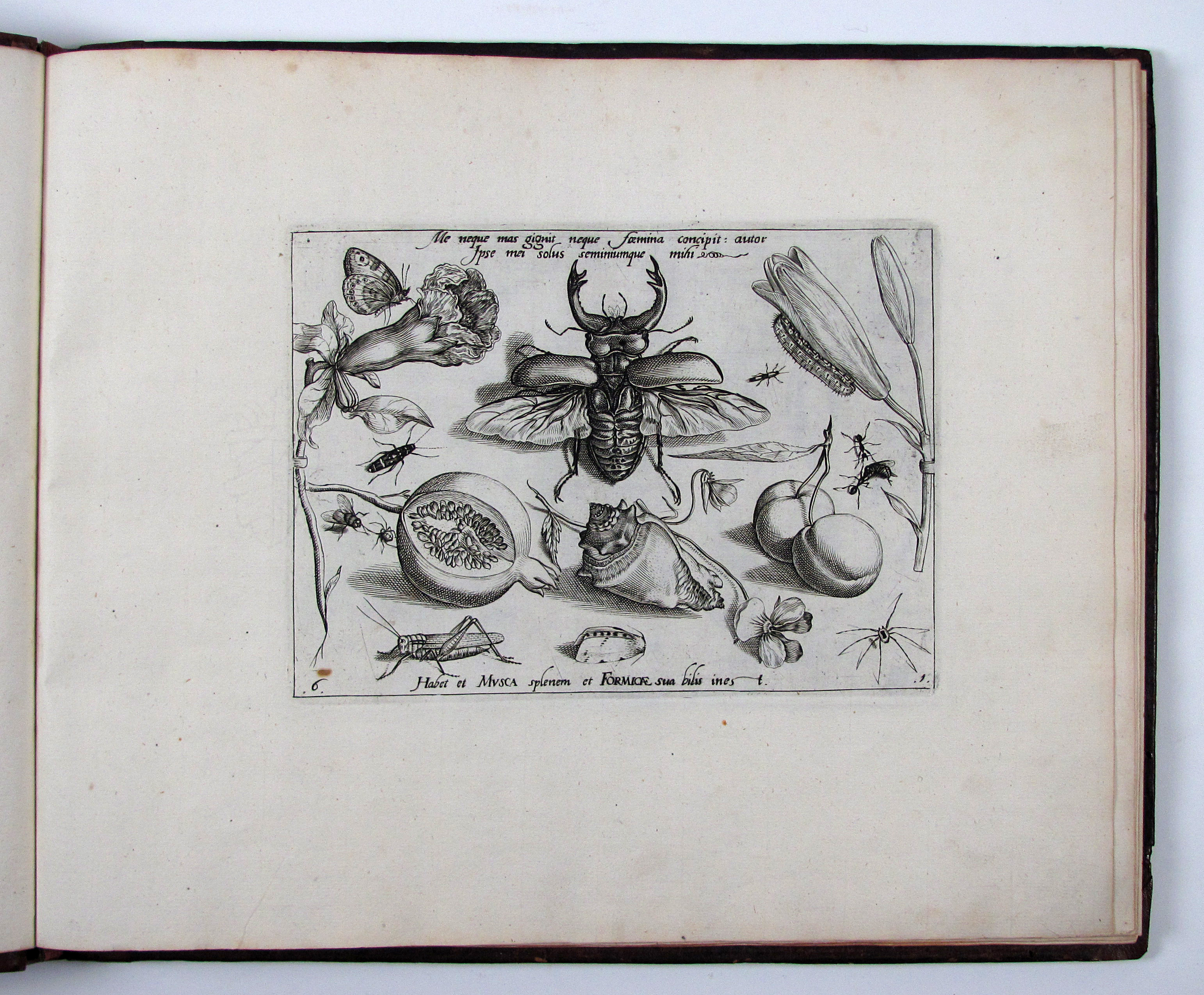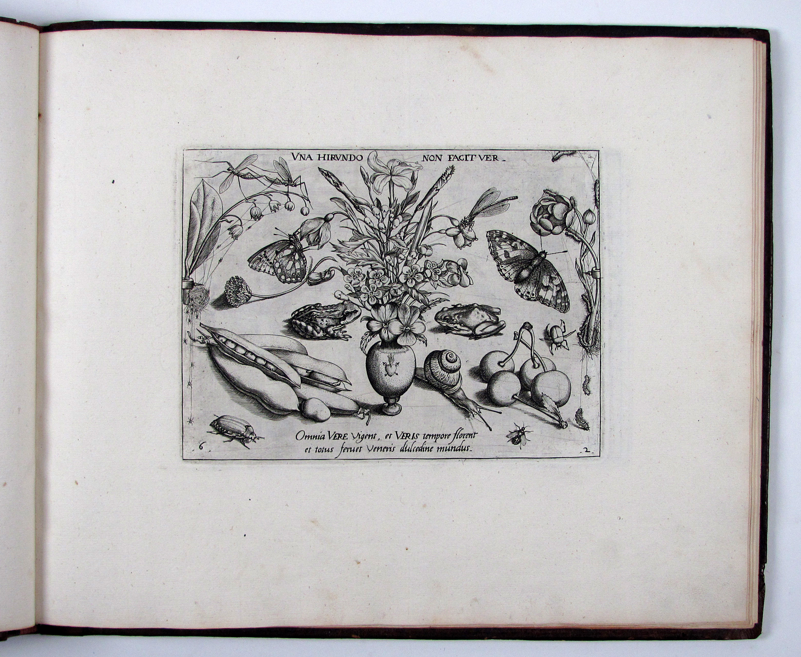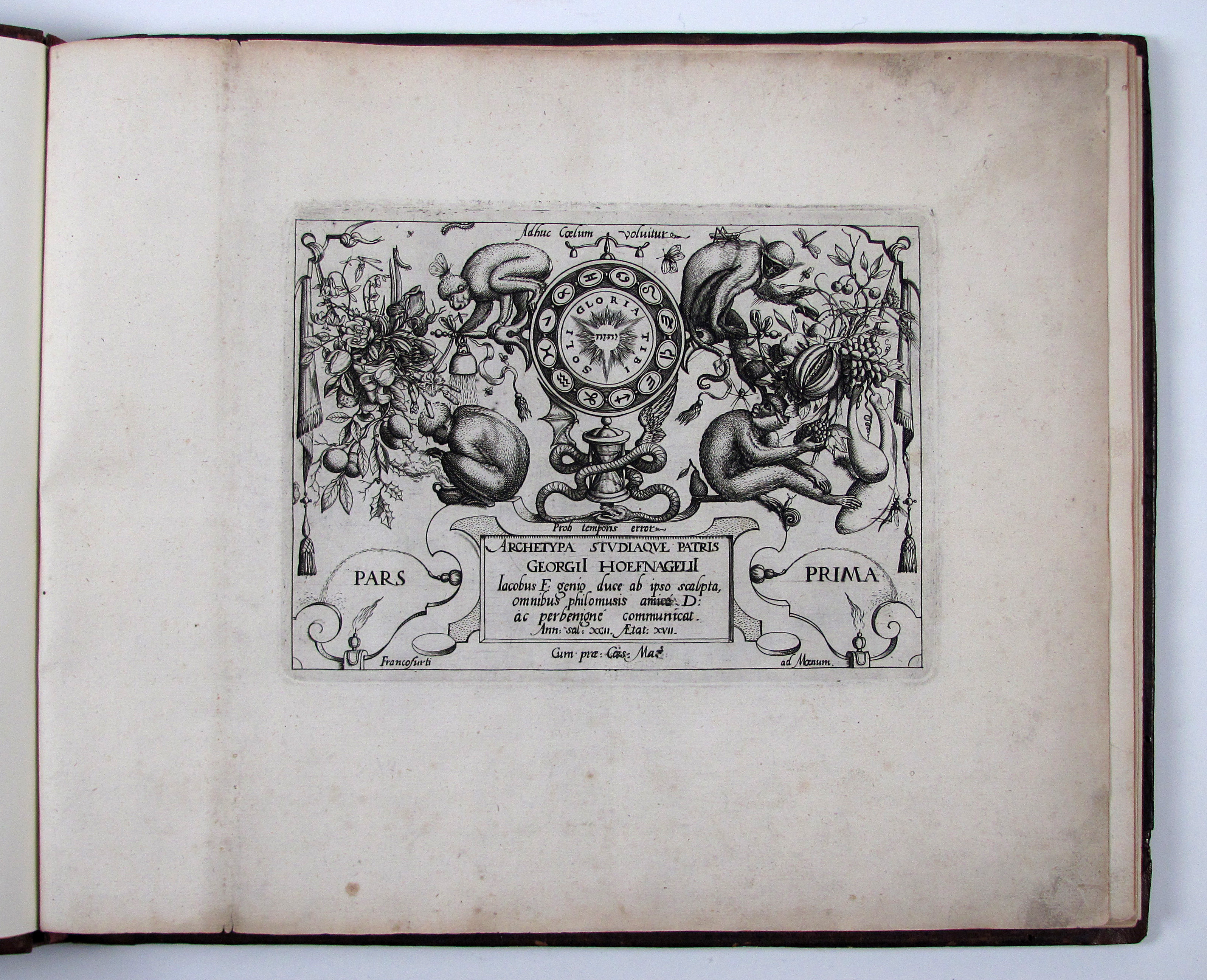 Herausragendes Exemplar der seltenen Erstausgabe, komplett und auf großem Papier, so von größter Seltenheit.– Jacob Hoefnagel (1573-1635) avancierte nach seinem Vater Georg (Joris) Hoefnagel (1542-1600), im Jahr 1602 ebenfalls zum Hof- und Kammermaler von Kaiser Rudolf II in Prag. Vorausgegangen war nicht zuletzt das vorliegende, überaus bedeutende Werk, welches er im Alter von nur 19 Jahren in enger Zusammenarbeit mit seinem Vater schuf und das als eine der Hauptquellen der Stilleben-Malerei des 17. Jahrhunderts gilt. Darüber hinaus ist es eines der ersten Werke überhaupt, in denen Insekten naturalistisch und detailliert abgebildet wurden. Jacob griff dabei auf Bildquellen zurück, die von seinem Vater stammten (Missale Romanum und Mira calligraphiae monumenta) und arrangierte sie zusammen mit Pflanzen, Früchten, Mollusken, Weichtieren und anderen Tieren zu bis dahin noch nicht gekannten, dekorativen Kompositionen. Seine Darstellungen wurden in der Folge von Zeitgenossen und nachfolgenden Künstlergenerationen oft kopiert oder leicht verändert neu interpretiert. Der Einfluss der Folge in kunstgeschichtlicher Hinsicht ist nicht zu überschätzen. Die Tatsache, dass es sich um ein Model-Buch handelt erklärt auch, warum komplette Exemplar im Markt die große Ausnahme bilden. Das Buch wurde als Vorlage benutzt umd dementsprechend oft „verbraucht“. Zusätzlich aufgewertet wird das Exemplar durch die Tatsache, dass die Radierungen auf großem Papier vorliegen, eine Rarität ersten Ranges.– Der Einband offensichtlich nicht original zugehörig (Remboîtage). Titel von Teil 1 und 2 etwas angestaubt, Tafel 2, Teil 1 mit Wasserrand, diese Blätter wurden wahrscheinlich schonen gereinigt. Einige wenige kleine geschlossene Einrisse, wenige Fleckchen im Rand, insgesamt ein sauberes, sehr gut erhaltenes Exemplar. Mit Exlibris D. von Superville auf Spiegel.– Wasserzeichen wie bei Thea Vignau-Wilberg, S. 87, Nr. 5. Hagen I, 371. Horn-Sch. 10472. Kat. der Ornamenstichslg. Berlin 4409. Nissen, ZBI 1954.