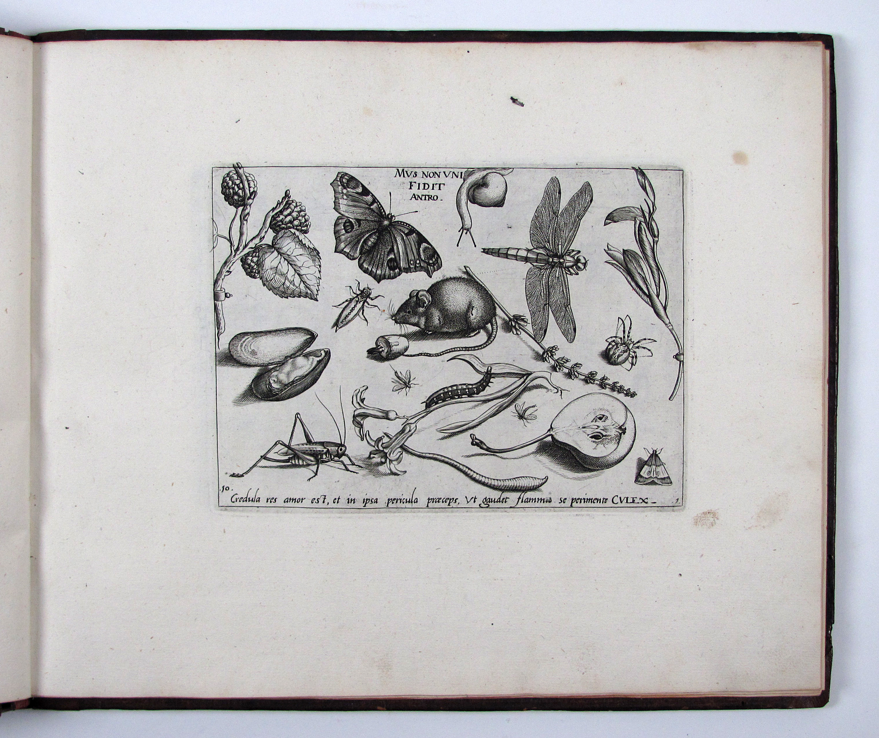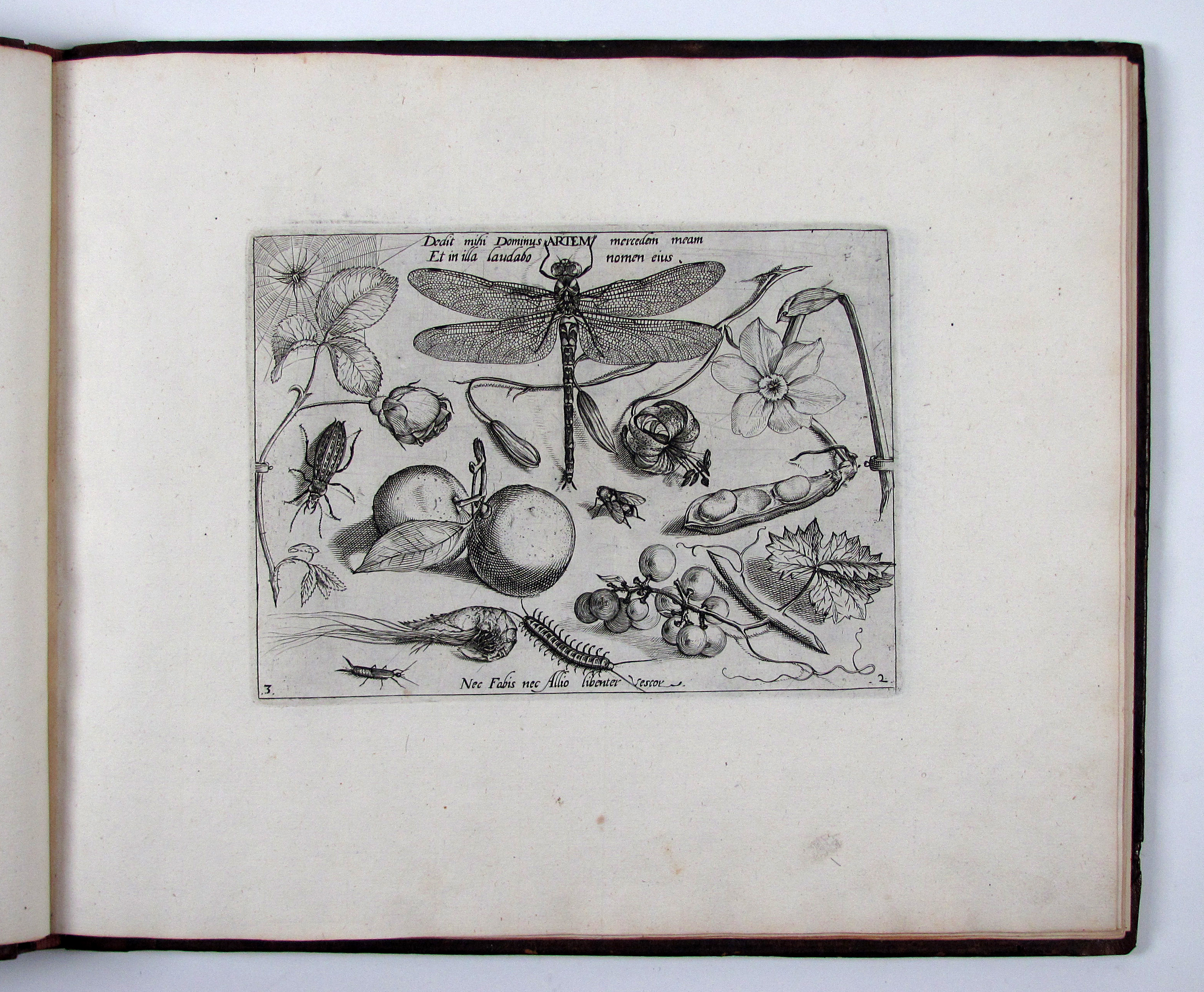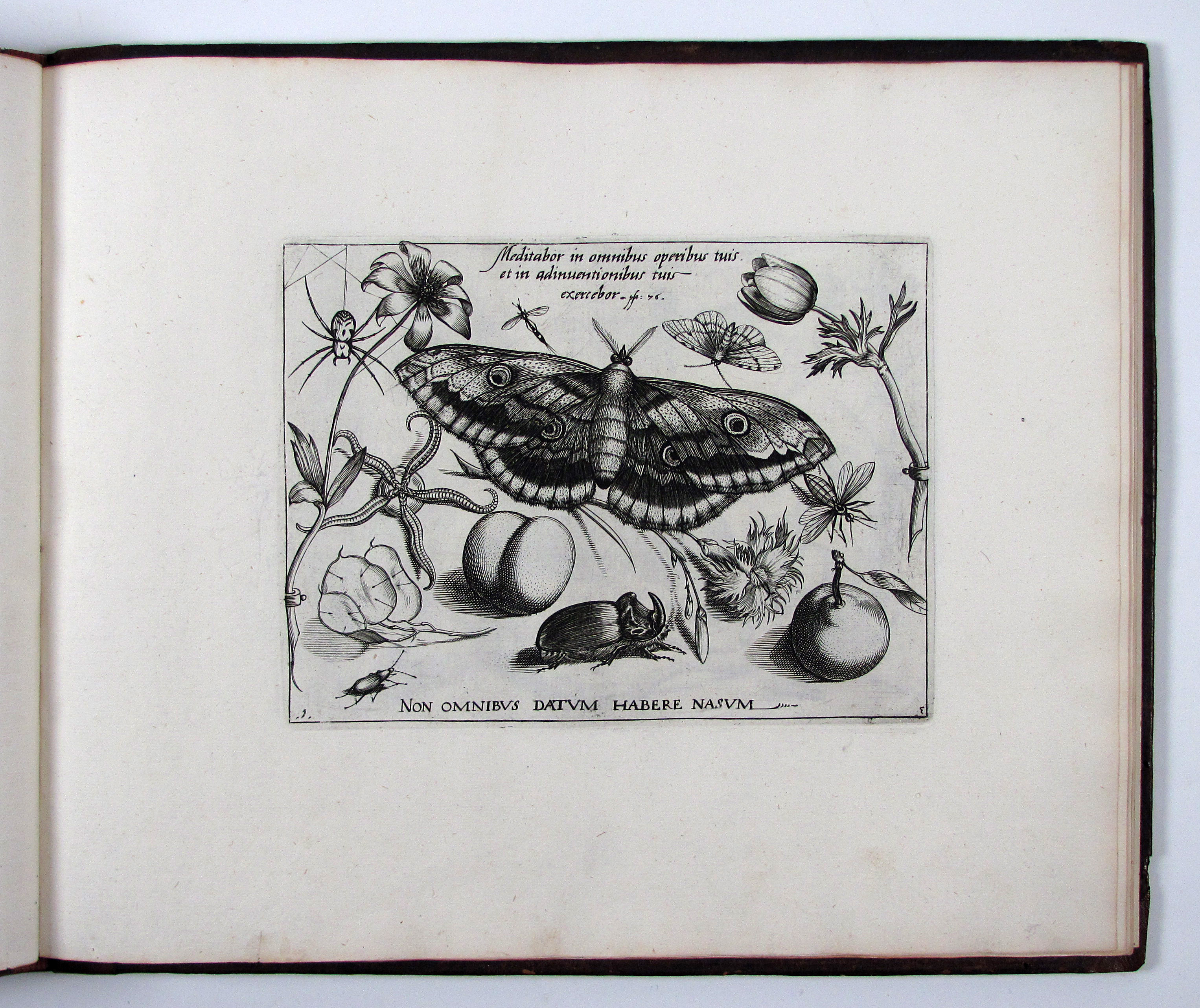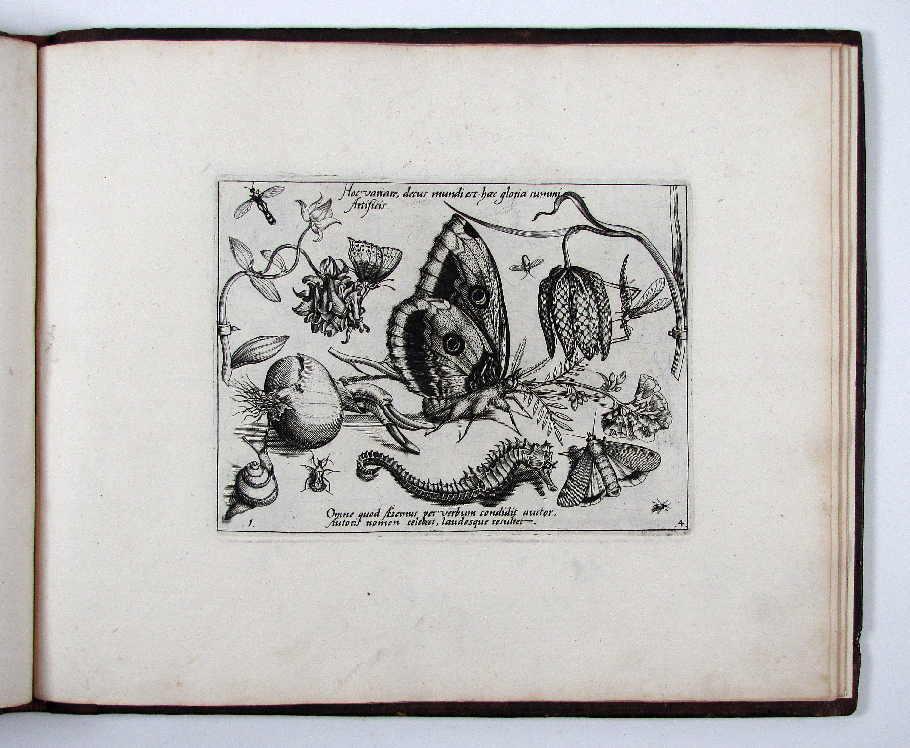 Herausragendes Exemplar der seltenen Erstausgabe, komplett und auf großem Papier, so von größter Seltenheit.– Jacob Hoefnagel (1573-1635) avancierte nach seinem Vater Georg (Joris) Hoefnagel (1542-1600), im Jahr 1602 ebenfalls zum Hof- und Kammermaler von Kaiser Rudolf II in Prag. Vorausgegangen war nicht zuletzt das vorliegende, überaus bedeutende Werk, welches er im Alter von nur 19 Jahren in enger Zusammenarbeit mit seinem Vater schuf und das als eine der Hauptquellen der Stilleben-Malerei des 17. Jahrhunderts gilt. Darüber hinaus ist es eines der ersten Werke überhaupt, in denen Insekten naturalistisch und detailliert abgebildet wurden. Jacob griff dabei auf Bildquellen zurück, die von seinem Vater stammten (Missale Romanum und Mira calligraphiae monumenta) und arrangierte sie zusammen mit Pflanzen, Früchten, Mollusken, Weichtieren und anderen Tieren zu bis dahin noch nicht gekannten, dekorativen Kompositionen. Seine Darstellungen wurden in der Folge von Zeitgenossen und nachfolgenden Künstlergenerationen oft kopiert oder leicht verändert neu interpretiert. Der Einfluss der Folge in kunstgeschichtlicher Hinsicht ist nicht zu überschätzen. Die Tatsache, dass es sich um ein Model-Buch handelt erklärt auch, warum komplette Exemplar im Markt die große Ausnahme bilden. Das Buch wurde als Vorlage benutzt umd dementsprechend oft „verbraucht“. Zusätzlich aufgewertet wird das Exemplar durch die Tatsache, dass die Radierungen auf großem Papier vorliegen, eine Rarität ersten Ranges.– Der Einband offensichtlich nicht original zugehörig (Remboîtage). Titel von Teil 1 und 2 etwas angestaubt, Tafel 2, Teil 1 mit Wasserrand, diese Blätter wurden wahrscheinlich schonen gereinigt. Einige wenige kleine geschlossene Einrisse, wenige Fleckchen im Rand, insgesamt ein sauberes, sehr gut erhaltenes Exemplar. Mit Exlibris D. von Superville auf Spiegel.– Wasserzeichen wie bei Thea Vignau-Wilberg, S. 87, Nr. 5. Hagen I, 371. Horn-Sch. 10472. Kat. der Ornamenstichslg. Berlin 4409. Nissen, ZBI 1954.