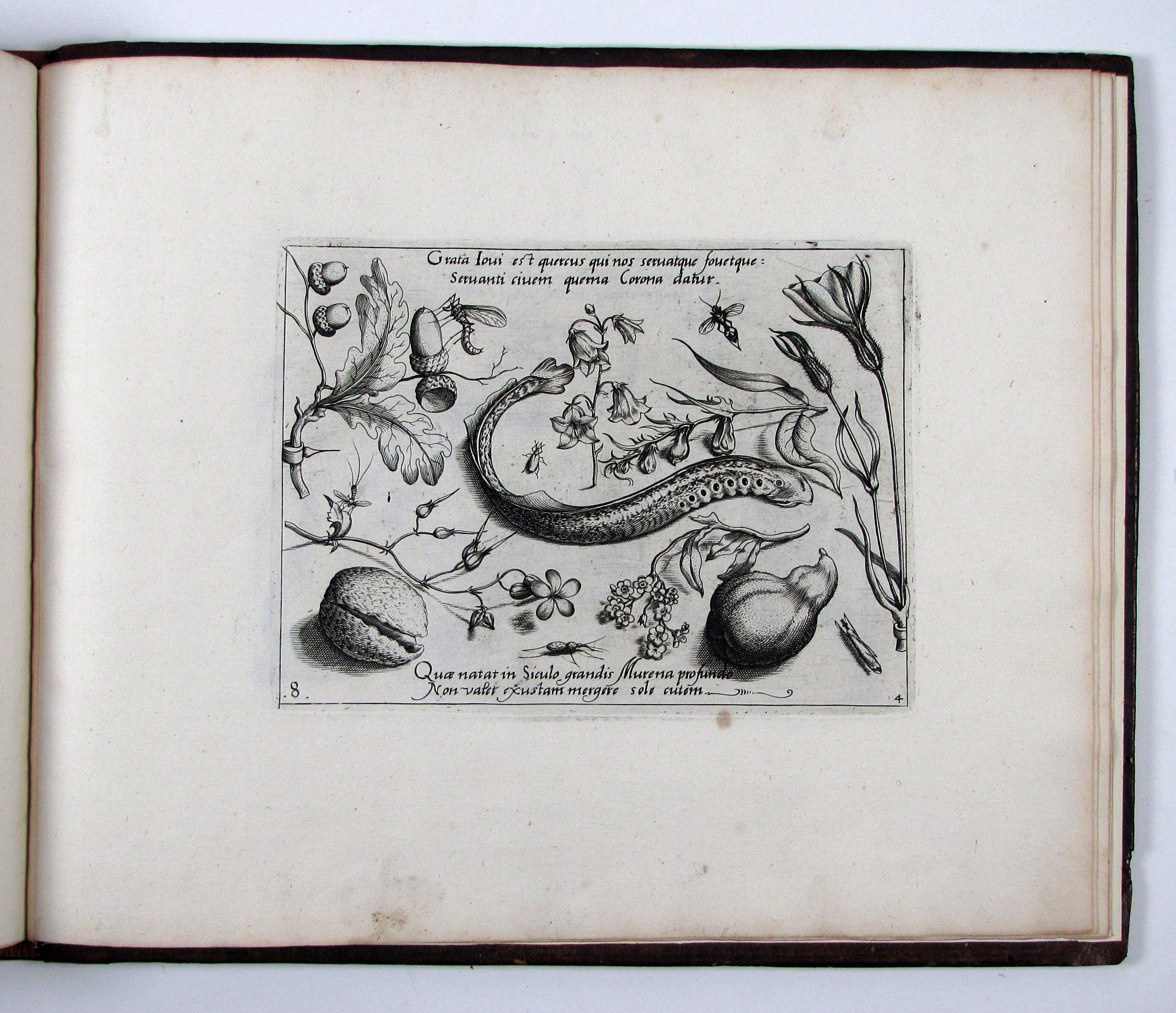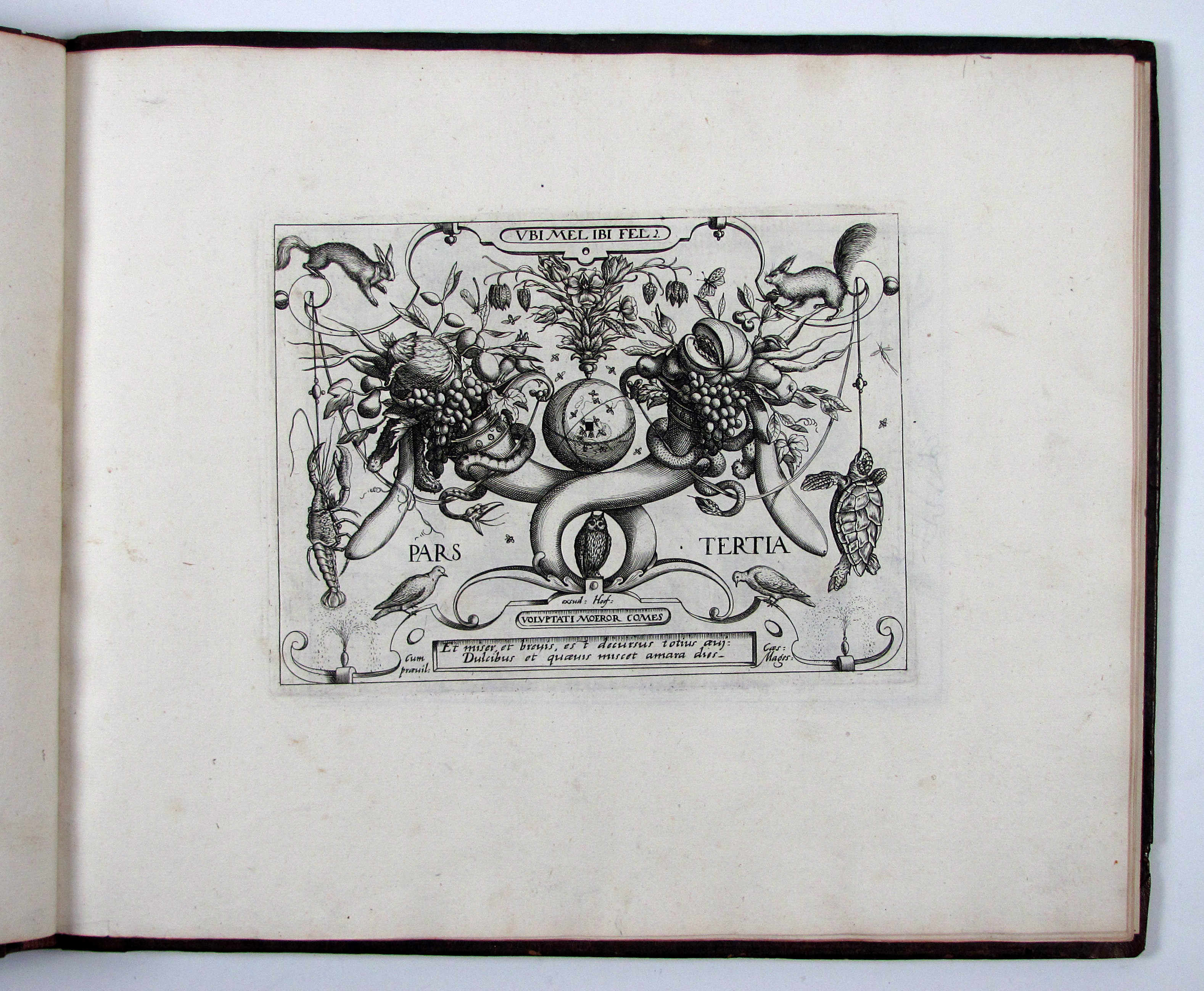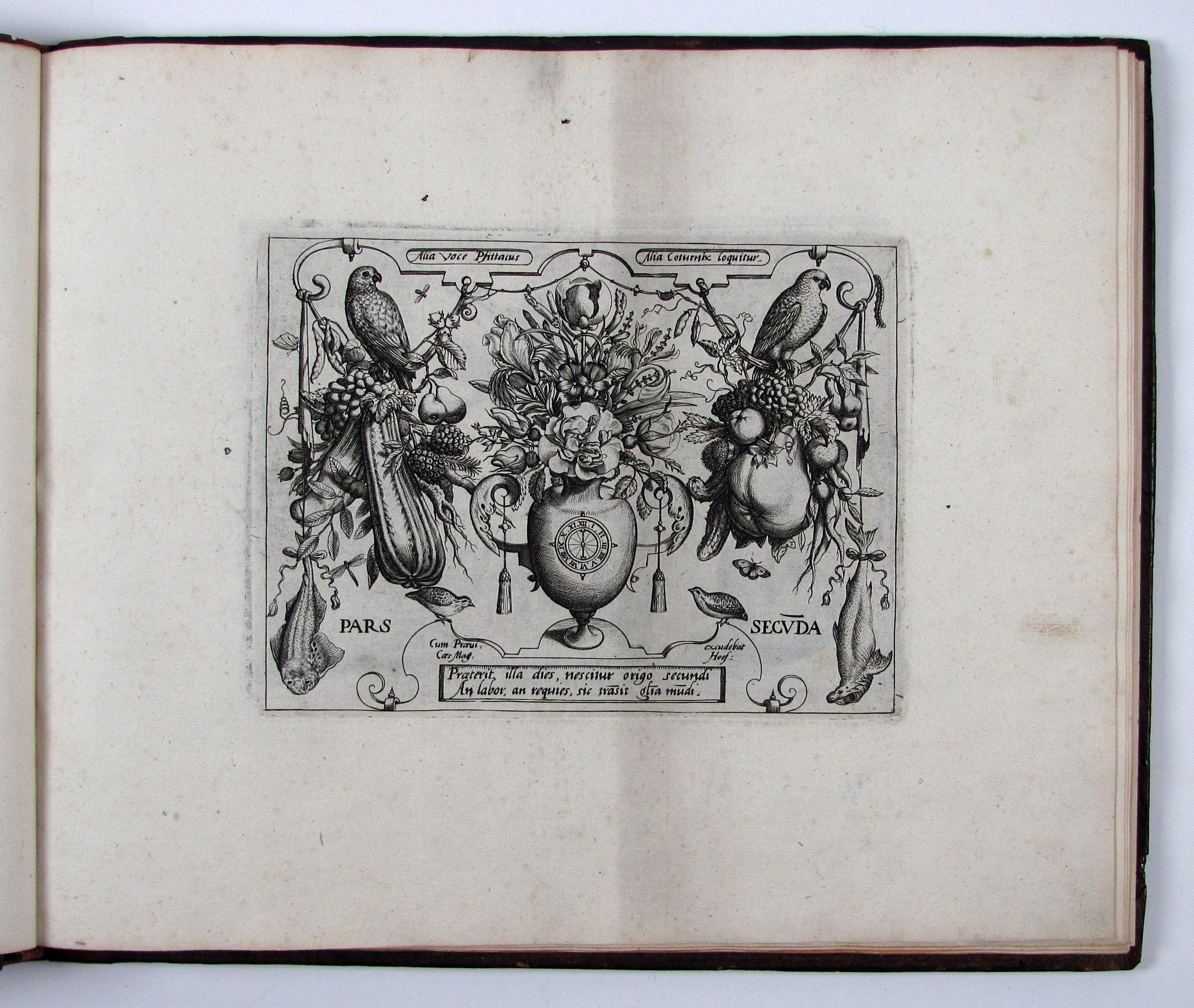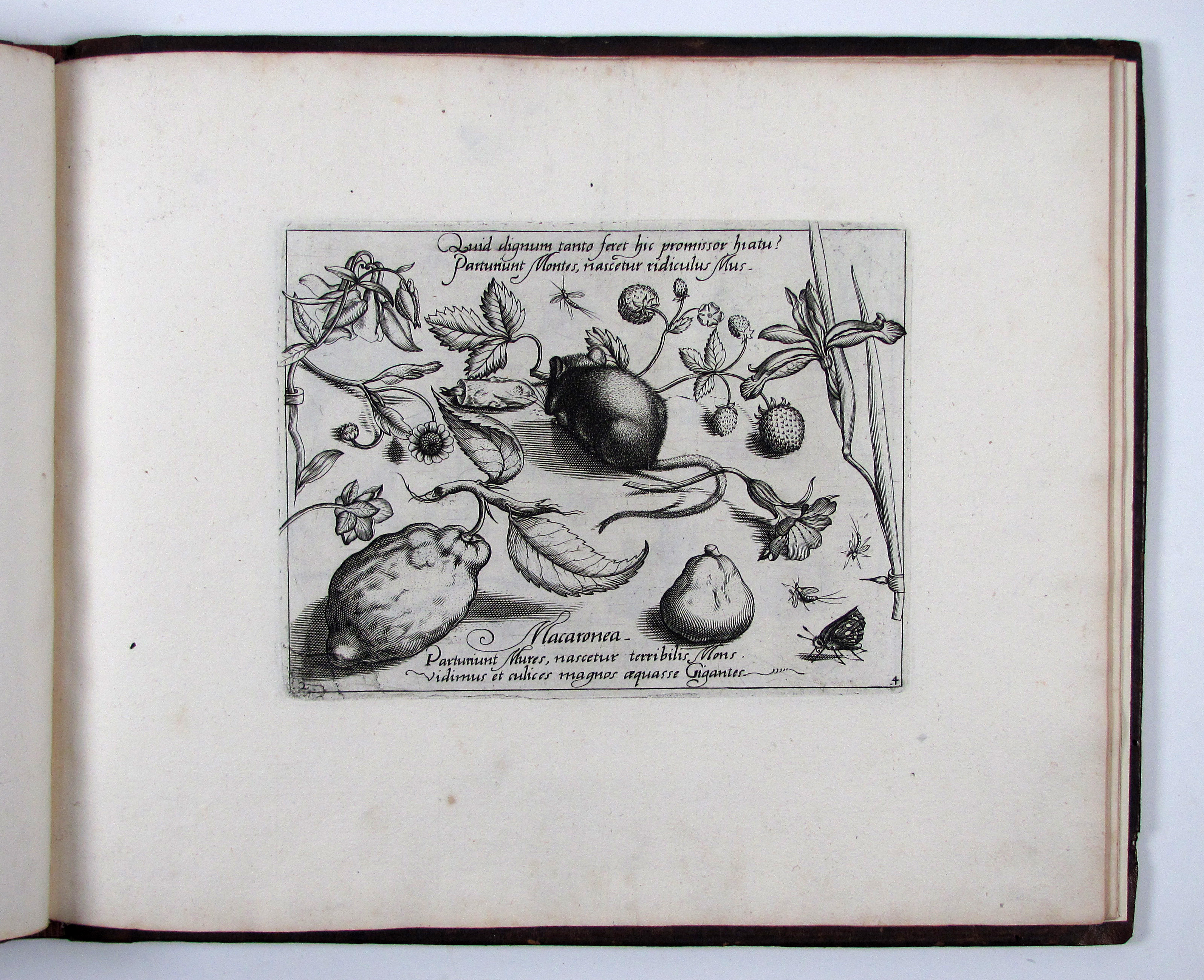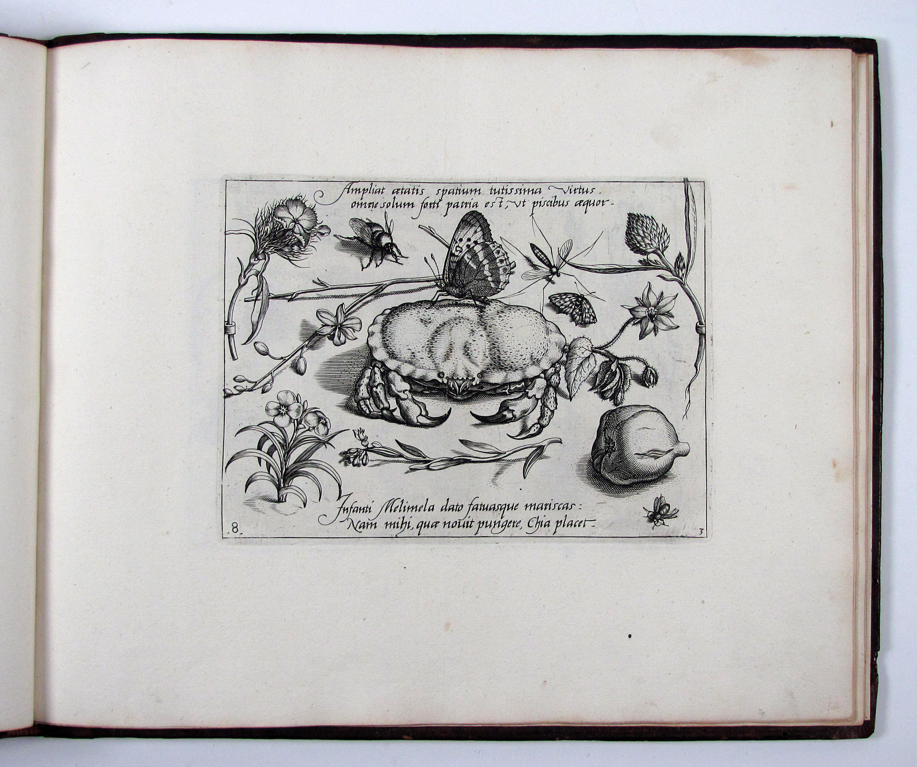 Herausragendes Exemplar der seltenen Erstausgabe, komplett und auf großem Papier, so von größter Seltenheit.– Jacob Hoefnagel (1573-1635) avancierte nach seinem Vater Georg (Joris) Hoefnagel (1542-1600), im Jahr 1602 ebenfalls zum Hof- und Kammermaler von Kaiser Rudolf II in Prag. Vorausgegangen war nicht zuletzt das vorliegende, überaus bedeutende Werk, welches er im Alter von nur 19 Jahren in enger Zusammenarbeit mit seinem Vater schuf und das als eine der Hauptquellen der Stilleben-Malerei des 17. Jahrhunderts gilt. Darüber hinaus ist es eines der ersten Werke überhaupt, in denen Insekten naturalistisch und detailliert abgebildet wurden. Jacob griff dabei auf Bildquellen zurück, die von seinem Vater stammten (Missale Romanum und Mira calligraphiae monumenta) und arrangierte sie zusammen mit Pflanzen, Früchten, Mollusken, Weichtieren und anderen Tieren zu bis dahin noch nicht gekannten, dekorativen Kompositionen. Seine Darstellungen wurden in der Folge von Zeitgenossen und nachfolgenden Künstlergenerationen oft kopiert oder leicht verändert neu interpretiert. Der Einfluss der Folge in kunstgeschichtlicher Hinsicht ist nicht zu überschätzen. Die Tatsache, dass es sich um ein Model-Buch handelt erklärt auch, warum komplette Exemplar im Markt die große Ausnahme bilden. Das Buch wurde als Vorlage benutzt umd dementsprechend oft „verbraucht“. Zusätzlich aufgewertet wird das Exemplar durch die Tatsache, dass die Radierungen auf großem Papier vorliegen, eine Rarität ersten Ranges.– Der Einband offensichtlich nicht original zugehörig (Remboîtage). Titel von Teil 1 und 2 etwas angestaubt, Tafel 2, Teil 1 mit Wasserrand, diese Blätter wurden wahrscheinlich schonen gereinigt. Einige wenige kleine geschlossene Einrisse, wenige Fleckchen im Rand, insgesamt ein sauberes, sehr gut erhaltenes Exemplar. Mit Exlibris D. von Superville auf Spiegel.– Wasserzeichen wie bei Thea Vignau-Wilberg, S. 87, Nr. 5. Hagen I, 371. Horn-Sch. 10472. Kat. der Ornamenstichslg. Berlin 4409. Nissen, ZBI 1954.