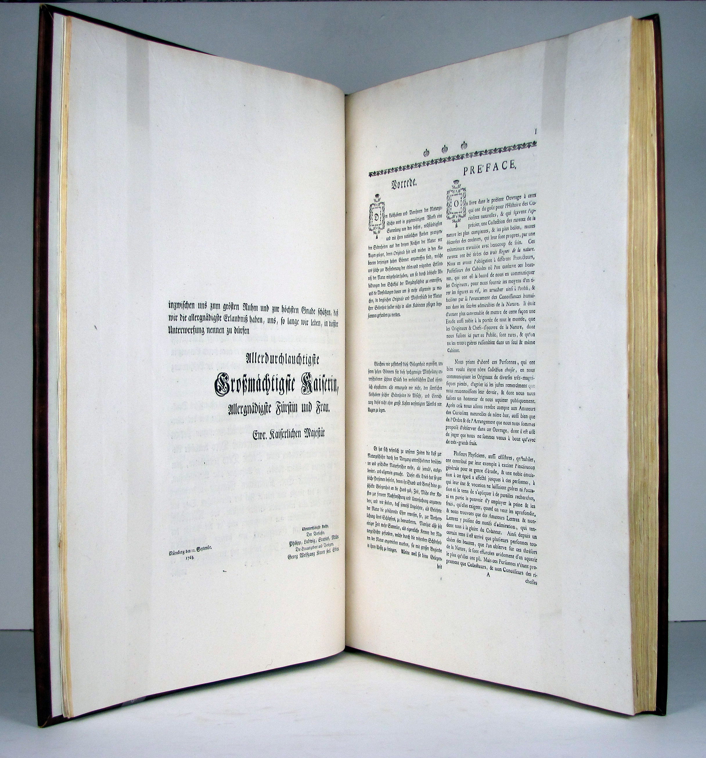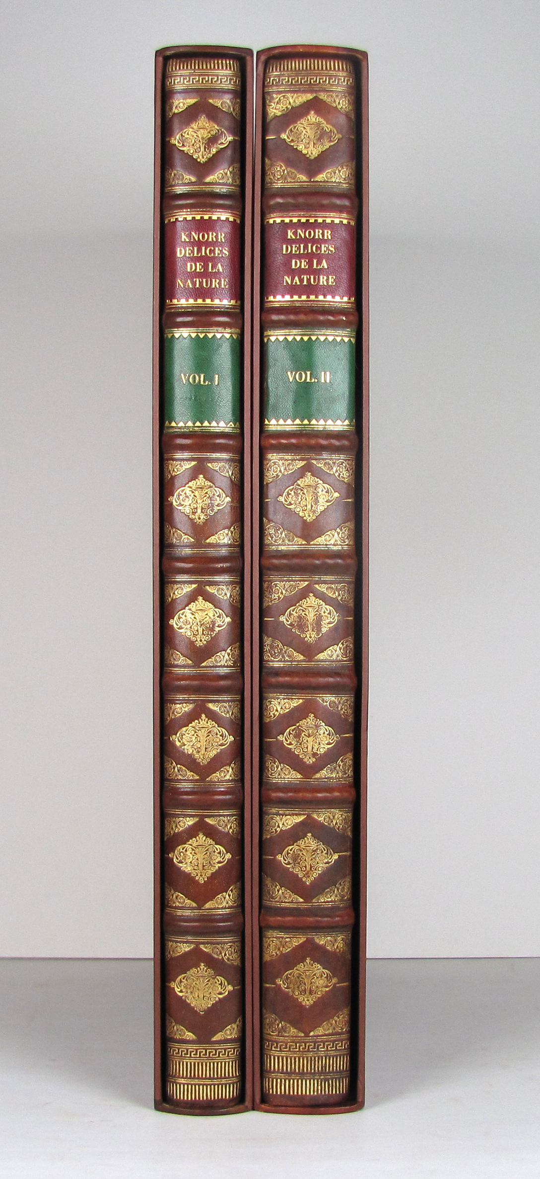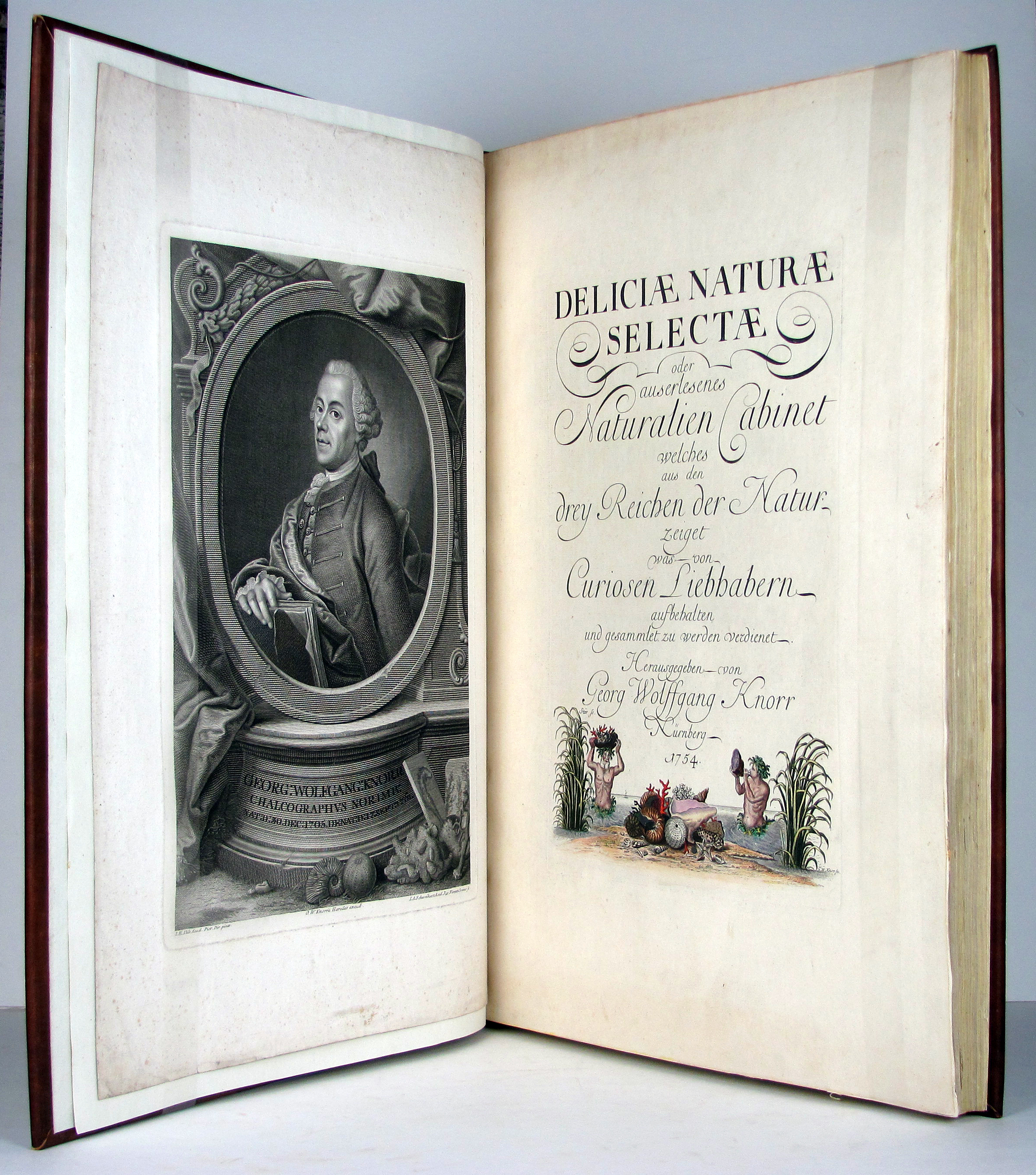 Hervorragend erhaltenes Exemplar eines der schönsten Werke des 18. Jahrhunderts über Naturalienkabinette in der Tradition der Wunderkammern. Erste Ausgabe. Die Qualität der großformatigen und prächtigen Tafeln stellt einen der Höhepunkte der naturwissenschaftlichen Illustration dar. Nürnberg war in dieser Zeit das Zentrum naturwissenschaftlicher Buchillustration und Knorr (1705-1761) mit seinen Werken zu Blumen, Muscheln, Versteinerungen und dem Vorliegenden einer seiner hervorragenden Vertreter. Christoph Jacob Trew, aus dessen Naturalienkabinett viele der abgebildeten Objekte stammen, besaßs eine 34.000 Bände umfassende Bibliothek und schwang sich zum nachhaltigsten Förderer der naturwissenschaftlichen Buchproduktion im Nürnberg des 18. Jahrhunderts auf. Er unterstützte und beauftragte zahlreiche Künstler mit Arbeiten neben G.W. Knorr auch J.F. Dietsch, B.R. Dietsch, J.C. Keller, C.N. Kleemann, J.A. Eisenmann, J.F. Schmidt, A. Hoffer, Christian und C.J. Leinberger u.v.a. Eine unvergleichlich gute Künstlergeneration wirkte zu dieser Zeit in Nürnberg und alle eben genannten schufen auch Aquarelle oder Stiche für das vorliegende Werk. Auch nach Nissen gehört das von Knorr bereits 1751 begonnene Werk neben seinen Conchylien zu den aufwändigsten naturwissenschaftlichen Werken Nürnbergs (vgl. Band II, S. 152). Nach Knorrs Tod im Jahr 1761 wurde es von Philipp Ludwig Statius Müller fortgesetzt und schließlich von Knorrs Erben mit deutsch-französischen Paralleltext herausgegeben.– Das nach Gruppen geordnete Werk behandelt und bildet ab: Korallen (15), Muscheln (7), Schmetterlinge (6), Seeigel (4), Mineralien (6), Hummer und Spinnen (7), Seesterne (4), Fische (9), Vögel (7), Säugetiere (14) und Reptilien (12). Nicht nur die Qualität der Tafeln besticht, geradezu verschwenderisch ist auch der restliche Ausstattung des Werkes. Kräftiges Papier und eine äusserst großzügige Typographie lassen das Buch als Gesamtkunstwerk erscheinen.– Ausnahemexemplar auf besonders grossem Papier (56 x 36 cm.) und von hervorragender Gesamterhaltung. Das schöne Porträt, welches in nur sehr wenigen Exemplaren zu finden ist, ist etwas knapper im Rand und stammt höchstwahrscheinlich aus einem anderen Exemplar.– 1771 erschien eine niederländische Ausgabe, 1778 die vorliegende Ausgabe in zweiter Auflage und 1779 eine französische Ausgabe.– Nissen, ZBI, 2227. Horn-Sch. 2038.