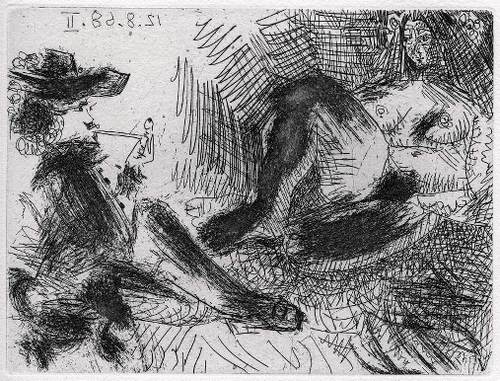 Nr. 182 (von 350) Exemplaren, im Druckvermerk vom Künstler signiert, Gesamtauflage 400.– Die Radierungen schuf Picasso im Jahr 1968 in nur wenigen Monaten, es handelt sich um das letzte von ihm signierte Buch. Die llustrationen wurden auf der Handpresse des Verlegers gedruckt, die Typographie einer 10-Punkt-Garamond im Handsatz von Fequet et Baudier, das Papier „Canton“ der Mühle Richard de Bas mit Wasserzeichen „La Celestine“.– Hervorragend erhalten, S. 9 und 44 mit winzigem Fleck, Druckvermerk minimal gebräunt.– Goeppert-Cramer 149.Monod 9820.