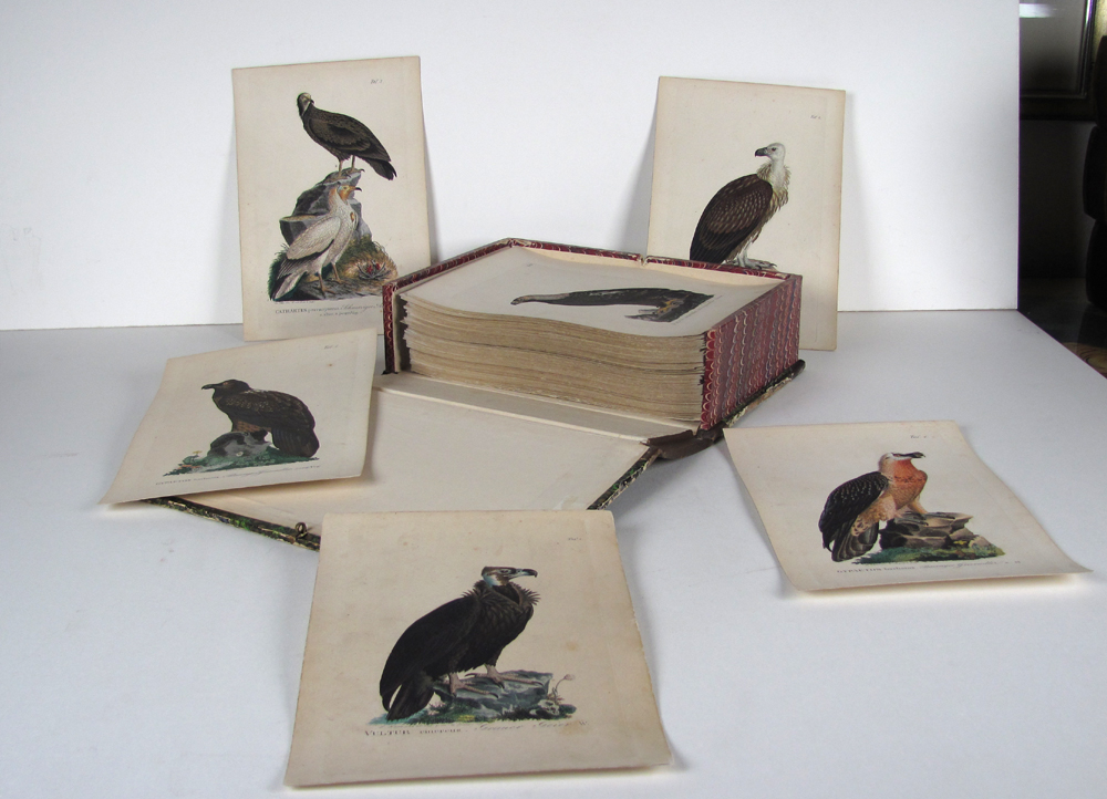 Eines von nur sehr wenigen Ausnehmexemplaren mit den Kupfertafeln auf starkem Karton. Diese besonders attraktive Ausstattung können wir im Handel und den einschlägigen Bibliographien nicht nachweisen.– Komplett seltene, zweite Ausgabe von Naumanns Naturgeschichte der Vögel Deutschlands. Diese Ausgabe basiert textlich auf der von Johann Andreas Naumann verfassten „Naturgeschichte der Land- und Wasservögel des nördlichen Deutschlands und angränzender Länder…“, 1795 bis 1817 in Folio-Format erschienen und in nur sehr wenigen kompletten Exemplaren bekannt. Für die vorliegende Ausgabe wurde die Zahl der Tafeln mehr als verdoppelt, sie wurden nach Zeichnungen von Johann Friedrich Naumann neu angefertigt (nach Zimmer vor allem in naturwissenschaftlicher Hinsicht verbessert) und der Text wurde erheblich erweitert. Somit stellt diese zweite Ausgabe ein neues Werk dar, das zu den schönsten deutschen Vogelbüchern gehört. In Fortsetzungen über einen Zeitraum von 24 Jahren erschienen, gehört es vollständig zu den Seltenheiten der ornithologischen Literatur. Weitere 16 Jahre nach Veröffentlichung des 12. Bandes erschien Band 13 als abschließendes Supplement in zwei Teilen. Der zweite Teil wurde nach J.Fr. Naumann’s Tod von J.H. Blasius, E. Baldanus und Fr. Sturm herausgegeben. Jeder Band verfügt über ein Inhaltsverzeichnis, das Ende von Band 12 bildet ein Generalregister.– Von sehr guter Gesamterhaltung. Die Textbde. stellenweise papierbedingt stockfleckig, die Tafeln insgesamt sehr sauber, meist nur rückseitig minimal stockfleckig, jeweils oberste Tafel leicht angestaubt oder gebräunt. Einbandecken leicht bestoßen, minimal berieben, ein Einband der Tafeln mit Wasserrand.– Nissen IVB 666. Zimmer 459 ff. Fine Bird Books 96.