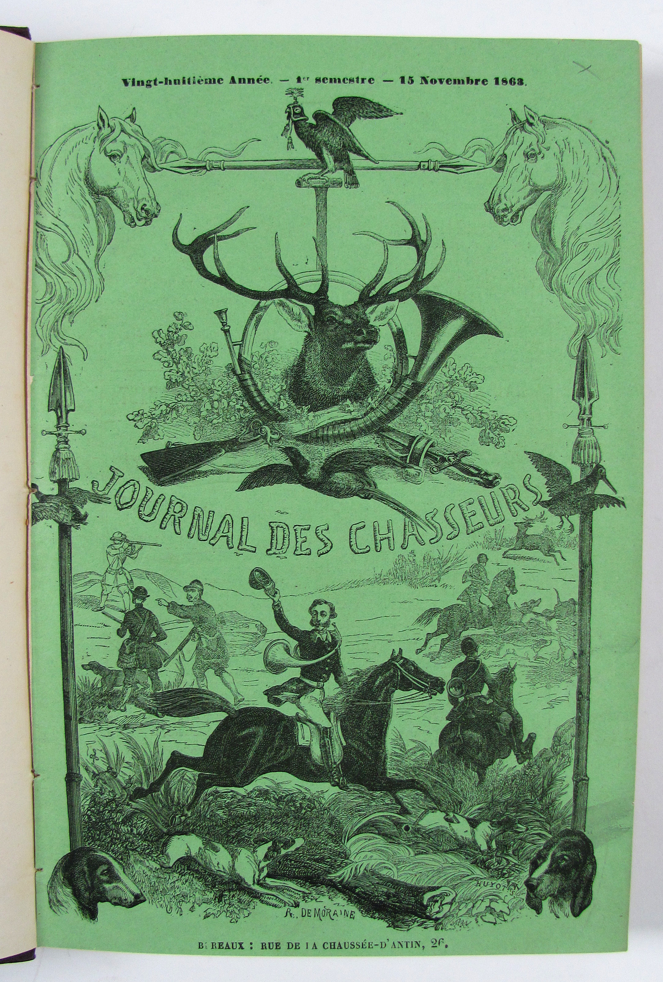 Selten umfangreiche Reihe der bekannten französischen Jagdzeitschrift, insgesamt in 34 Jahrgängen zwischen 1836 und 1870 erschienen. Die Tafeln zeigen Jagdszenen, jagdbare Tiere, Jagdhunde, Pferde und vereinzelt auch Humoristisches. Diesem textlich kompletten Exemplar fehlen lediglich 3 Tafeln (Jg. 20/II: „Un facheux“; Jg. 26/II: „Le lièvre“; Jg. 27/I: „Philosophe“). Ein Tafel in Jg. 24/I doppelt vorhanden. 14 Bänden sind die Orig.-Lieferungsumschläge beigebunden.– Einbände tls. leicht fleckig, 3 Bände mit Wasserflecken auf Einbänden und im Buchblock, Rücken verblaßt. Stellenw. leicht gebräunt bzw. stockfleckig.– Schwerdt I, 276 f. Thiébaud 523 f.