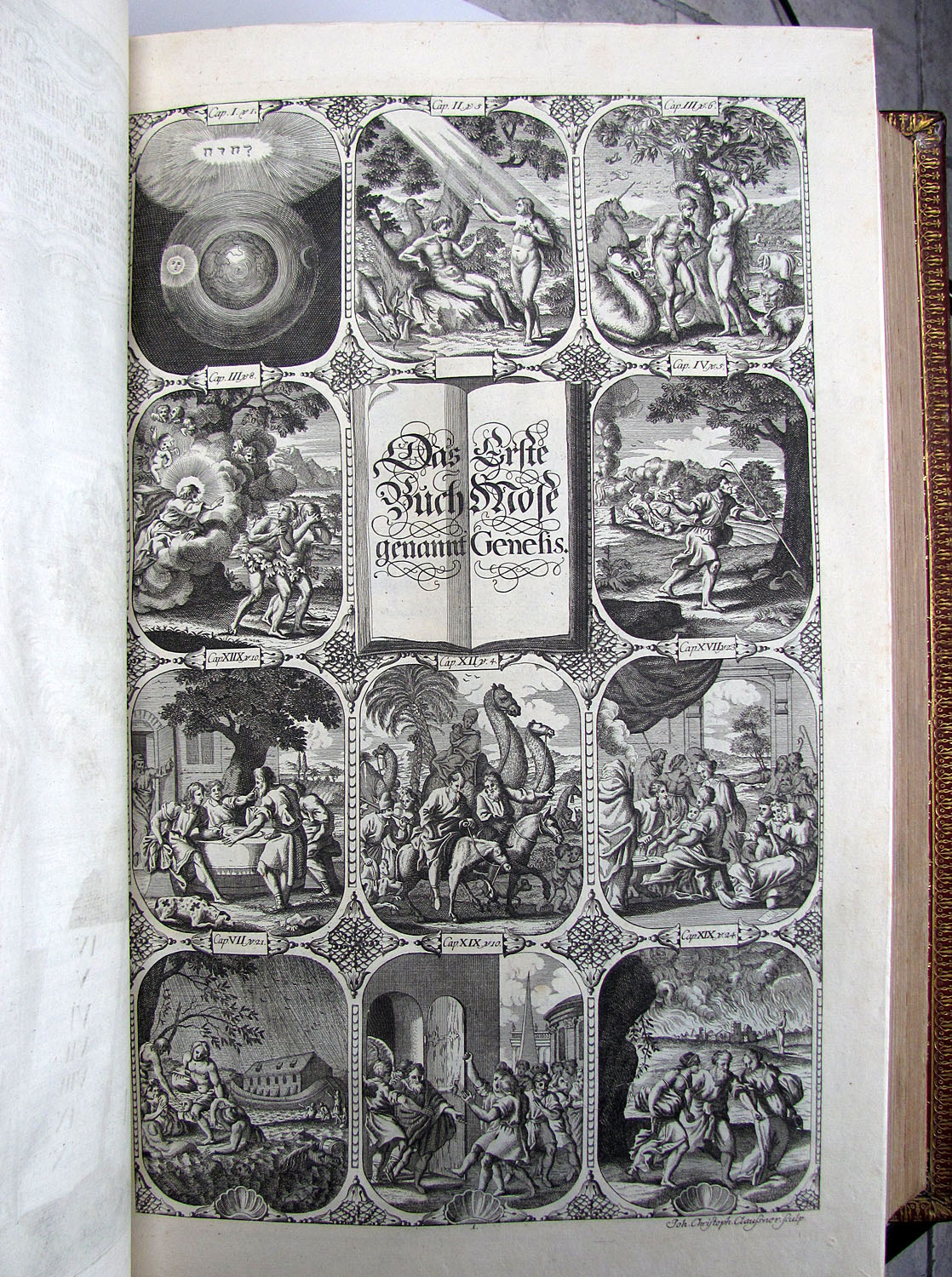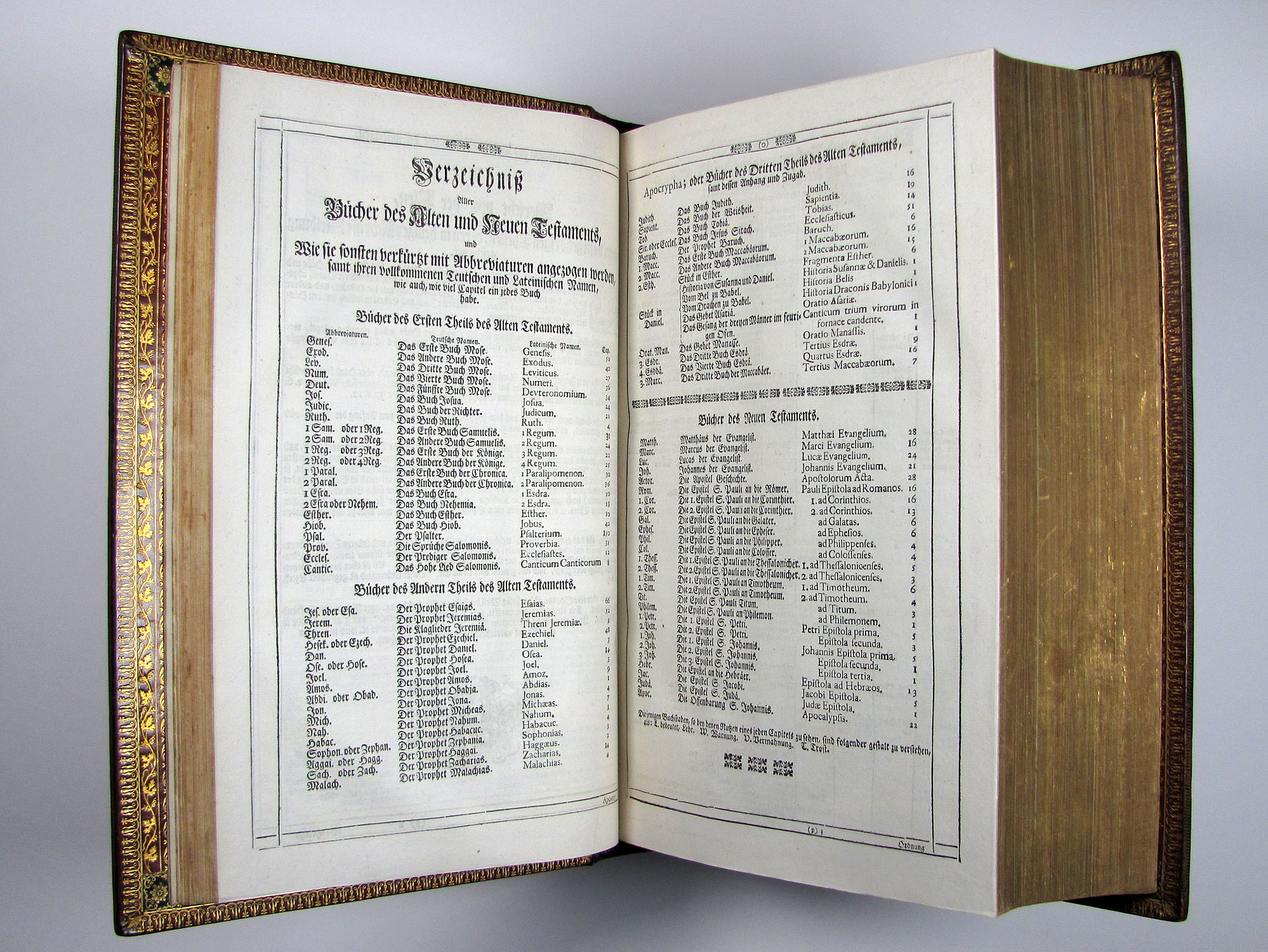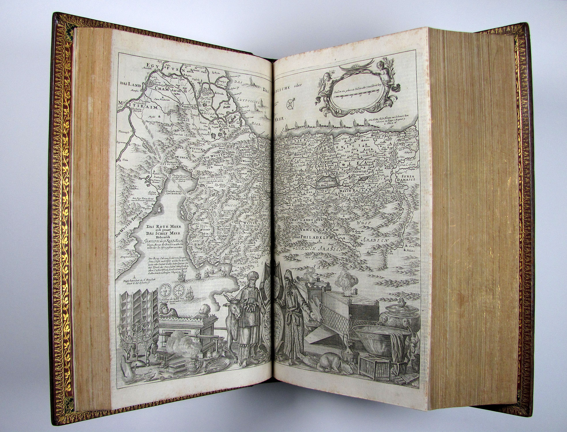 Hervorragend erhaltenes Prachtexemplar der Kurfürstenbibel in einem äussert beeindruckenden Meistereinband von vorzüglicher Erhaltung. Der monumentale Bibeldruck (Papier 42,8 x 27 cm.) aus der Endter’schen Offizin beeindruckt durch die sehr aufwändige Typographie, die umfangreichen Register und Hilfstabellen sowie die bildliche Ausstattung. Es liegt hier die letzte, 14. Ausgabe der sog. „Weimarer Kurfürstenbibel“ vor, die vom Umfang und Format ihre Vorgänger noch einmal übertrifft. Die doppelblattgroßen Kupfer zeigen das „Zeltlager der Kinder Israels“ , 4 Karten des Mittelmeerraumes, 2 Pläne von Jerusalem und eine Darstellung der Augsburger Konfession. Die anderen Kupfer mit Porträts von Moses, den Prophetenund Evangelisten, der Arche Noah sowie den 18 dekorativen Zwischentiteln mit Abbildung mehrerer Bibelszenen.– „Hauptzweck der Edition ist, dem gemeinen Mann, ‚der in Künsten und Sprachen nicht erfahren‘ zu dienen, weshalb die Erklärungen so kurz wie nur möglich gehalten und nicht zu umfangreichen Glossen ausgebaut werden sollten… Da gleichzeitig Luthers Text unverändert nach der Version von 1545 abgedruckt werden sollte, wurden alle Änderungen in die angefügten Glossen so gesetzt, daß der Kontext nicht zerstört wurde. Um dies zu gewährleisten wurde der alte Wortlaut größer und fett gedruckt, die Glosse dazwischen kleiner und normal.“ (Reinitzer 169).– Das Exemplar innen wie aussen von nahezu perfekter Erhaltung und bis auf sehr vereinzelte und minimale Stockflecken im Rand vollkommen sauber.– Jahn 91.