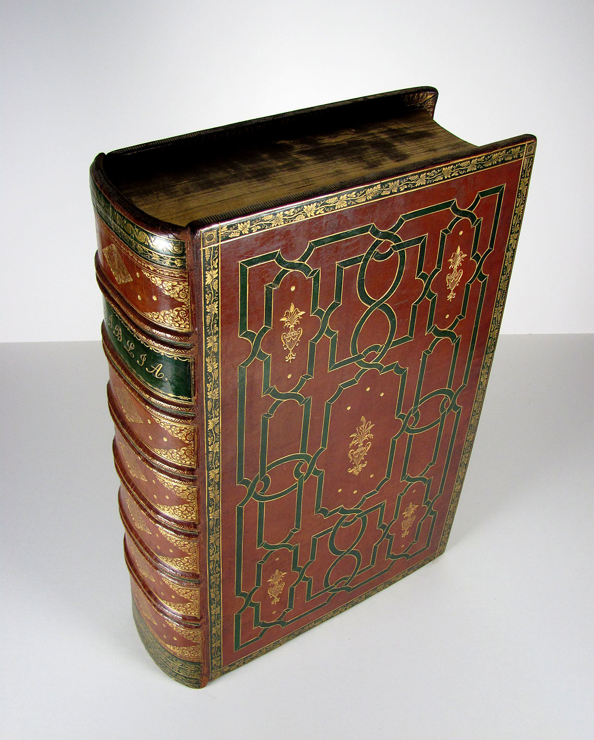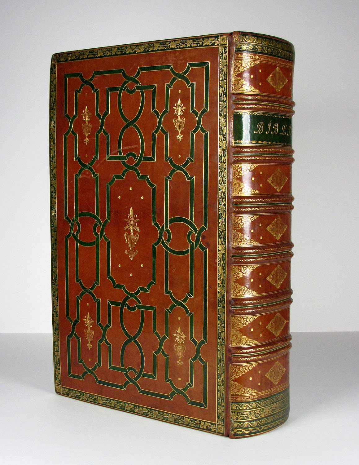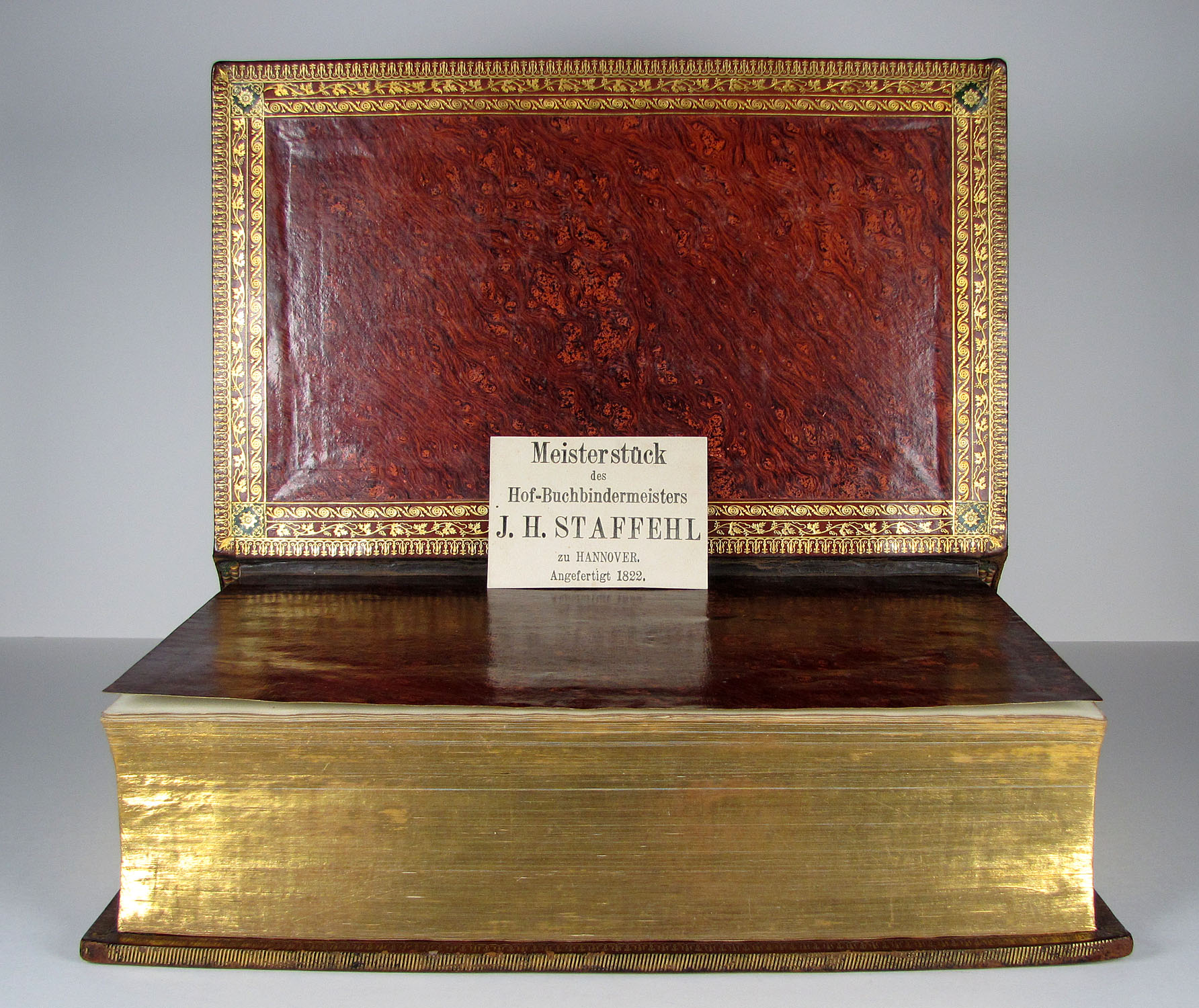 Gr.-Folio. 73 Bl., S. 1-8, 2 Bl., S. 9-740, 512, 480 S., 8 Bl. Mit gestoch. Titel, 11 Porträts der Kurfürsten, 1 Porträt Luther’s, 4 Karten und 2 Plänen (alle doppelblattgr.) sowie 30 Tafeln (davon 18 nummerierte mit mehreren Darstellungen und 2 doppelblattgr.), alles in Kupferstich. Hellbrauner, geglätteter Kalbslederband auf 6 Doppelbünden und über Holzdeckel. Rücken sehr reich mit kleinen Einzelstempeln vergoldet, am Kopf, Schwanz und in den Zwischenräumen der Bünde mit grünen Lederauflagen, die ebenfalls, wie das grüne Rückenschildchen, reich vergoldet sind. Deckel mit flächenfüllendem, sich überschneidenden Bandwerkspiel aus grünen Ledereinlagen mit Randvergoldung, darinnen fünf große, goldgepr. Vasen mit floralem Schmuck und einige wenige Sternstempel, das Ganze umfasst von einer grünen Randbordüre, die mit vier kleinen Eckstücken und Rankenwerkrolle vergoldet ist. Dreiseitiger Goldschnitt, Stehkantenvergoldung. Breite Innenkantenvergoldung von drei verschiedenen Rollen, die inneren beiden Rollen mit vier, goldgeprägten Eckstücken aus grünem Leder. Spiegel und Vorsätze aus geflammtem Marmorpapier. Beiliegend gedruckter Original-Zettel: „Meisterstück des Hof-Buchbindermeisters J.H. Staffehl zu Hannover. Angefertigt 1822“.