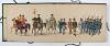 Hübsches, ungewöhnlich großformatiges Leporello zur Feier des 300-jährigen Bestehens der Universität. Die Mitglieder der Studentenverbindungen in historischen Kostümen und zu Fuß oder beritten unterwegs, stellen die nahmhaftesten Persönlichkeiten in der Geschichte der Hochschule dar. Das Ende des Zuges bildete en Prunkwagen mit Allegorien der unterrichteten Fächer.– Ein hier nicht vorhandenes Begleitheft mit 8 Seiten trägt den Titel: „Maskerade gehouden door de leden van het Leidsche Studenten-Corps den 15den Juni 1875, ter viering van den 300sten verjaardag der Leidsche Hoogeschool, voorstellende de Leidsche Hoogeschool, afgebeeld in de beroemdste en merkwaardigste mannen, die van hare stichting af hun naam aan den haren hebben verbonden. Overeenkomstig de teekeningen door de commissarissen tot regeling van de maskerade verstrekt en onder hun toezicht geteekend en op steen gebragt door G.J. Bos.“.– Das Leporello vom Einband gelöst, einige wenige kleine Einrisse an den Fälzen, ansonsten gut und farbfrisch erhalten.– Nicht bei Lipperheide Kostümbibliothek und Landwehr, Dutch books with coloured plates.